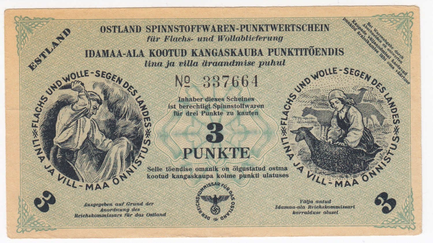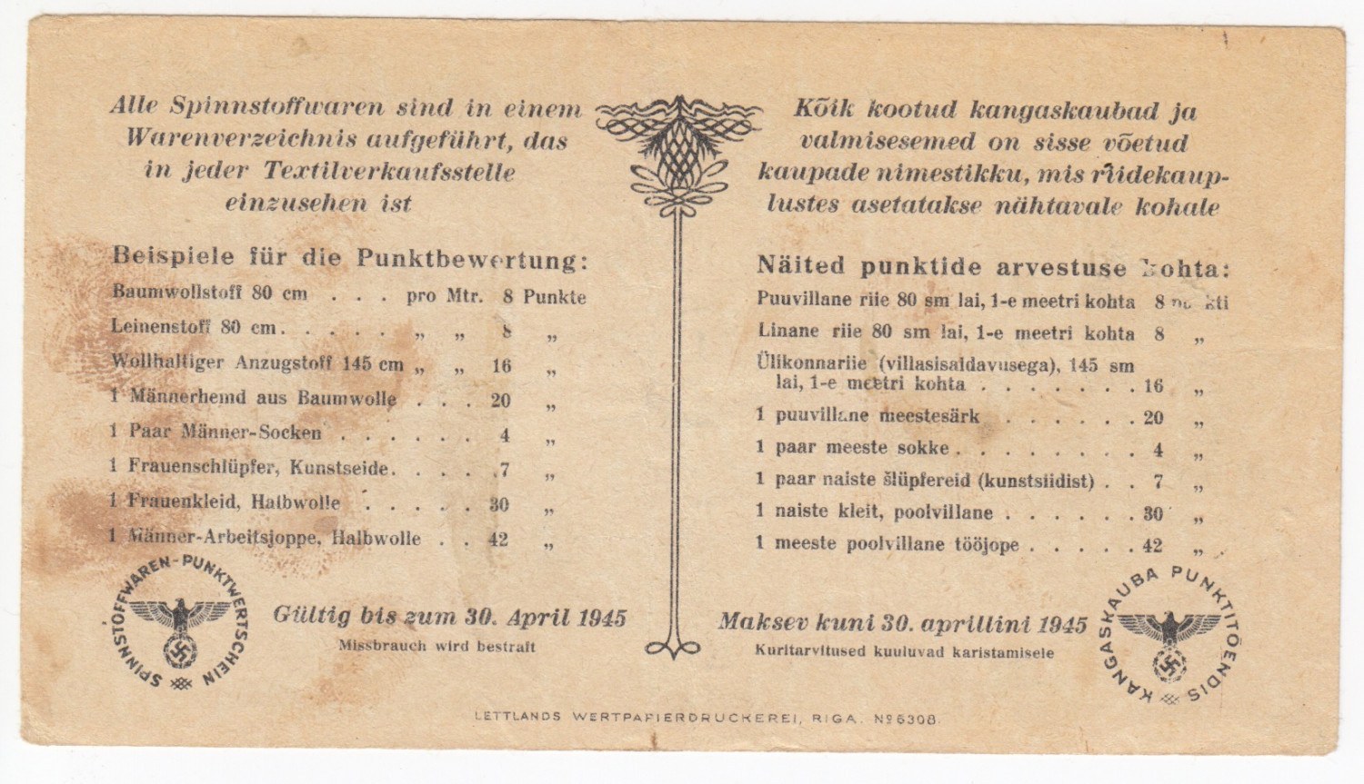 Estonia (Germany Occupation WWII) 3 Points (Punkte) 1945 - Textile Ration Coupon