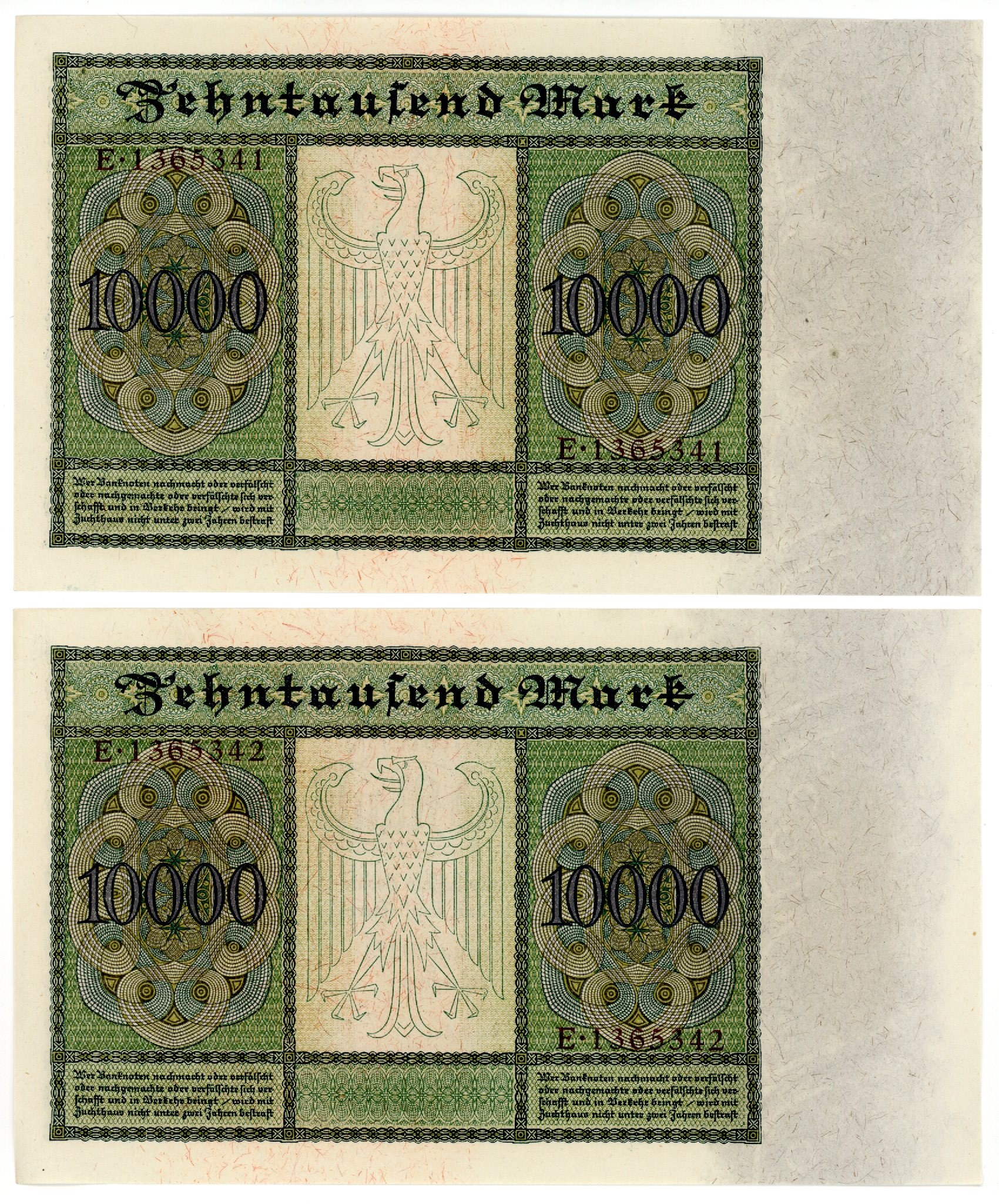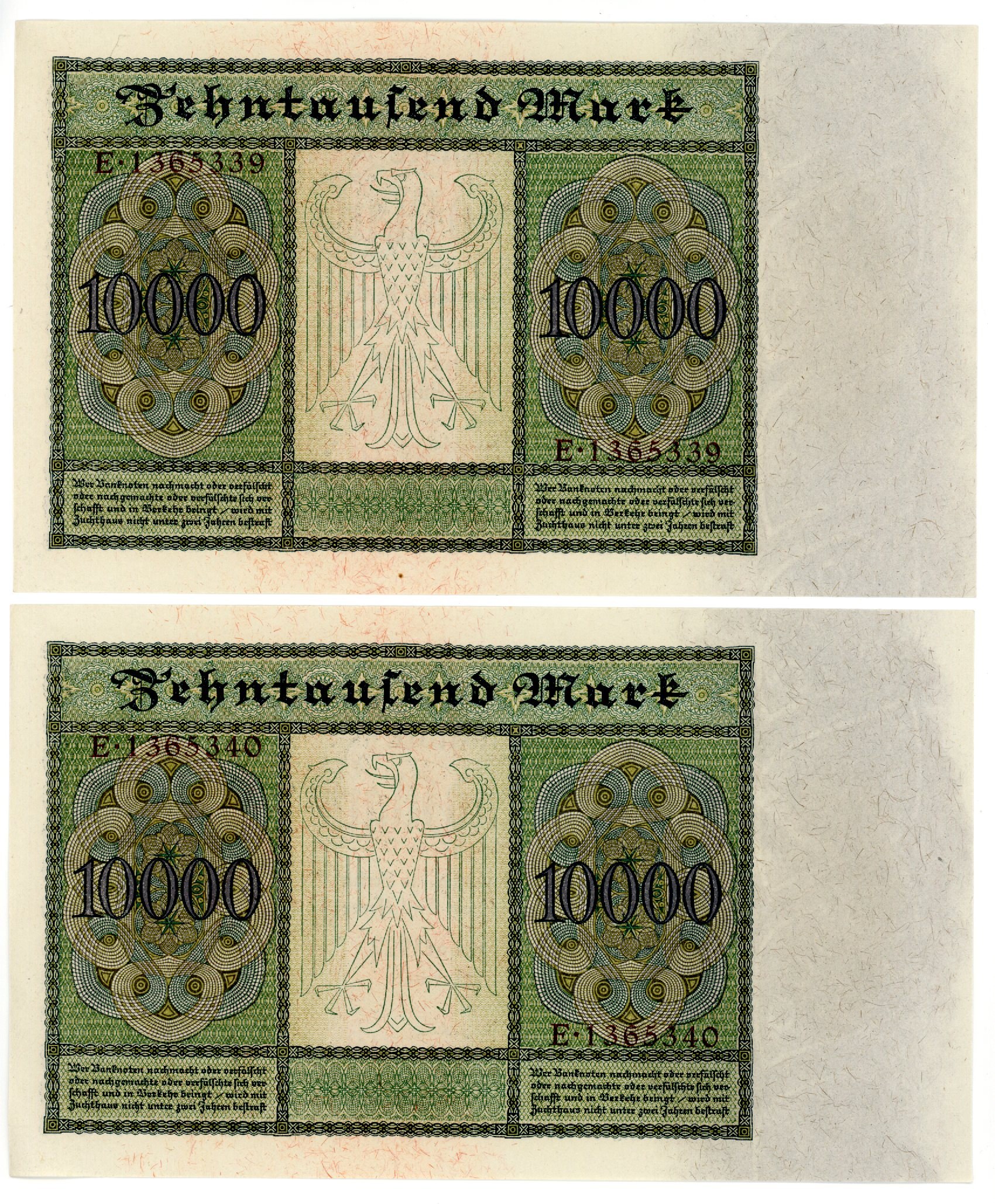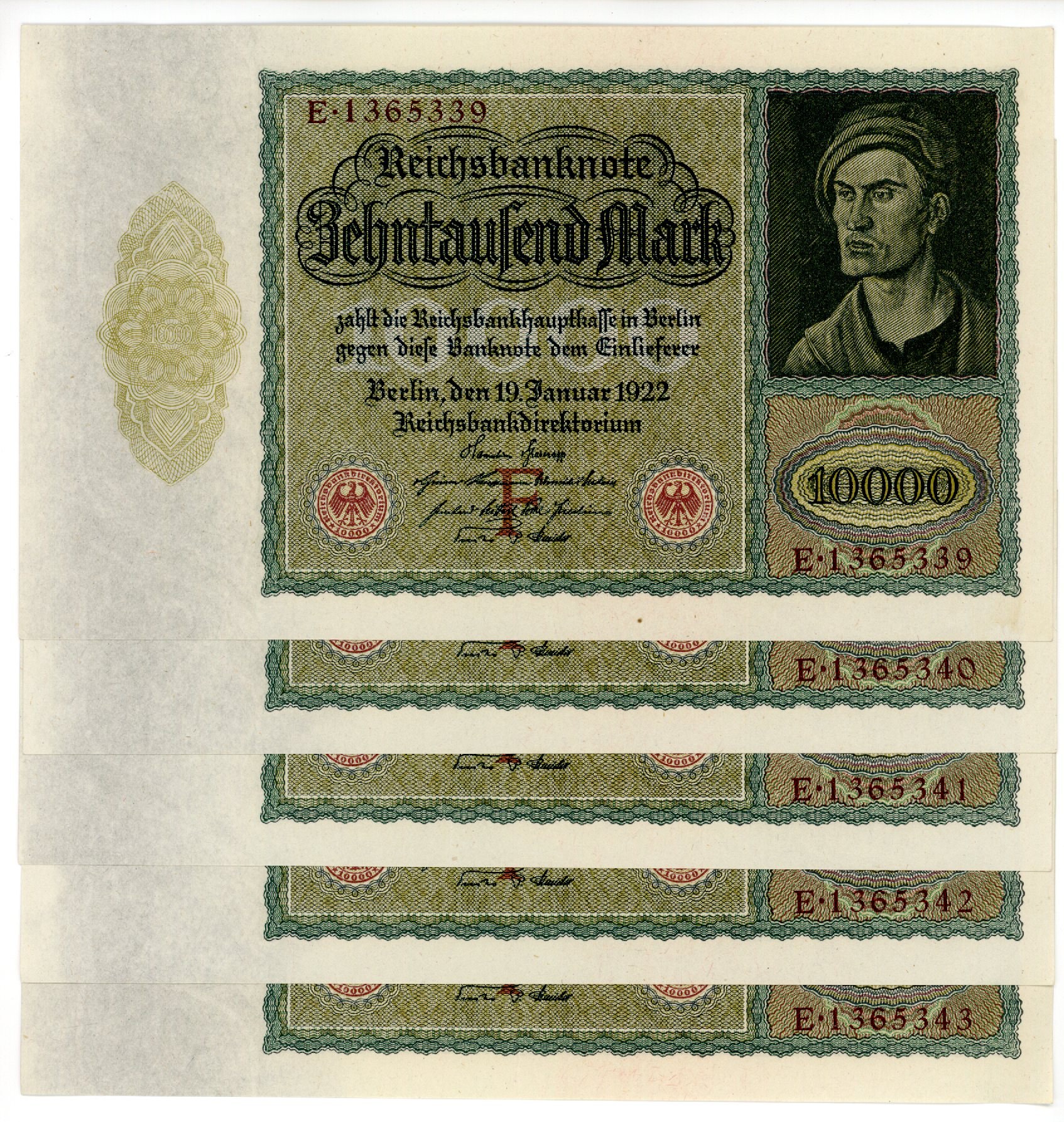 Niemcy, zestaw 10.000 marek 1922. Razem 5 szt. Kolejne numery. Duży format. Stan zachowania 1-. Zagięcia w okolicach prawego dolnego rogu. Bardzo dobrze zachowane. Literatura: Pick: 70; Rosenberg: 68a