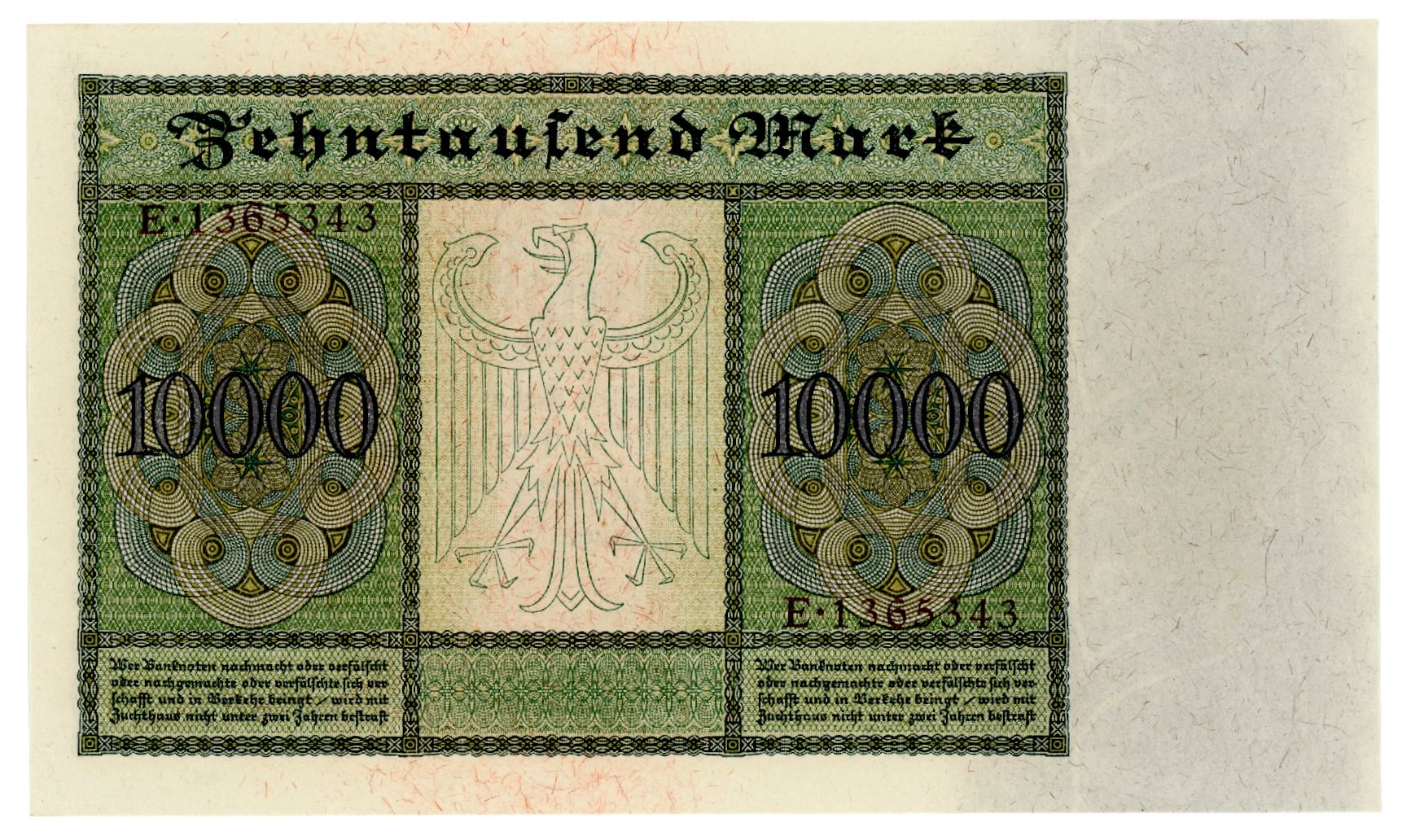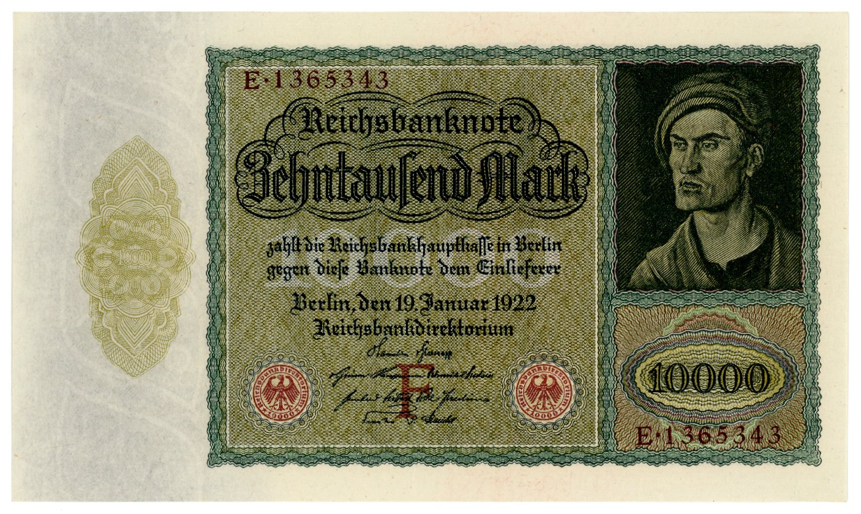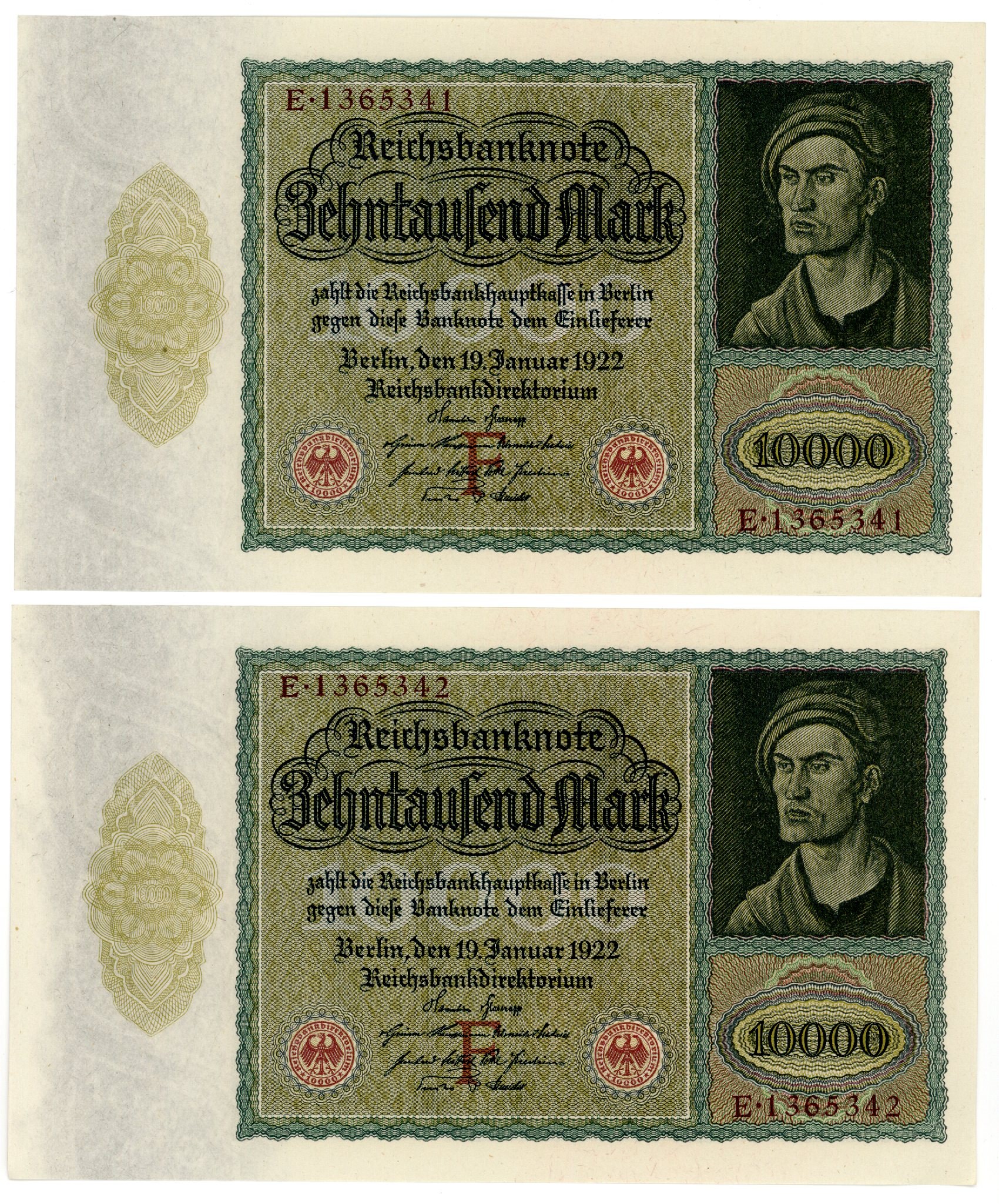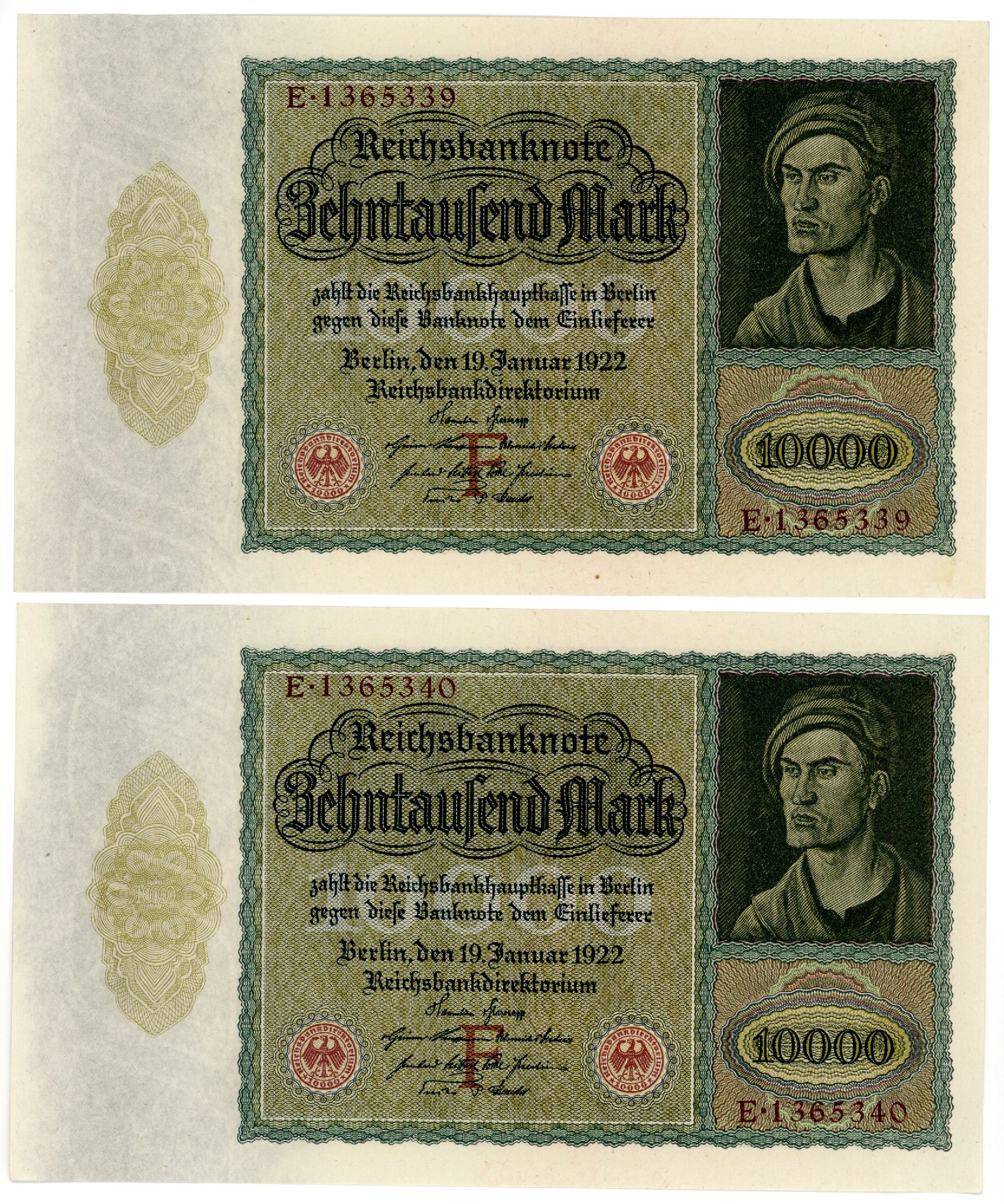 Niemcy, zestaw 10.000 marek 1922. Razem 5 szt. Kolejne numery. Duży format. Stan zachowania 1-. Zagięcia w okolicach prawego dolnego rogu. Bardzo dobrze zachowane. Literatura: Pick: 70; Rosenberg: 68a