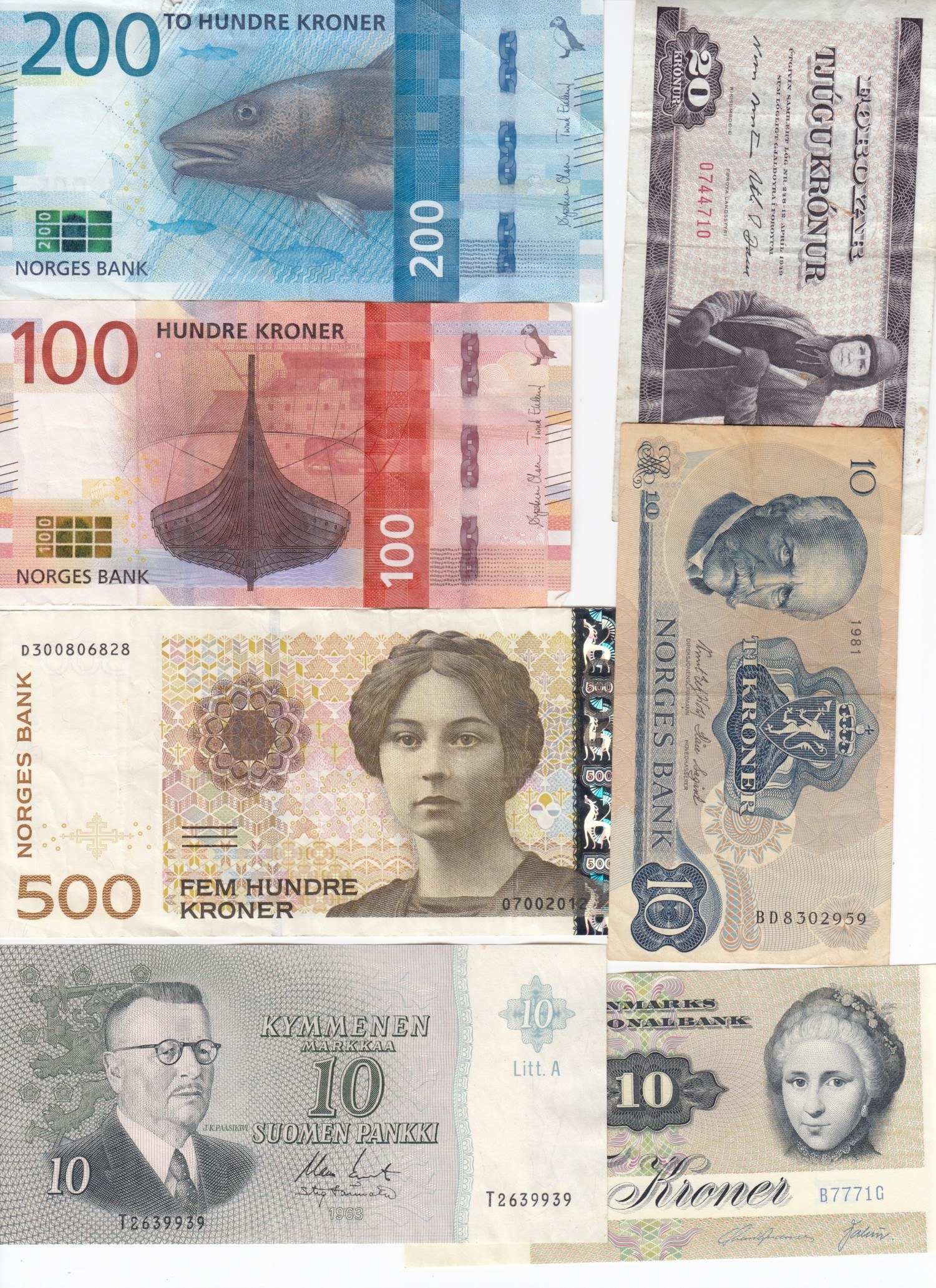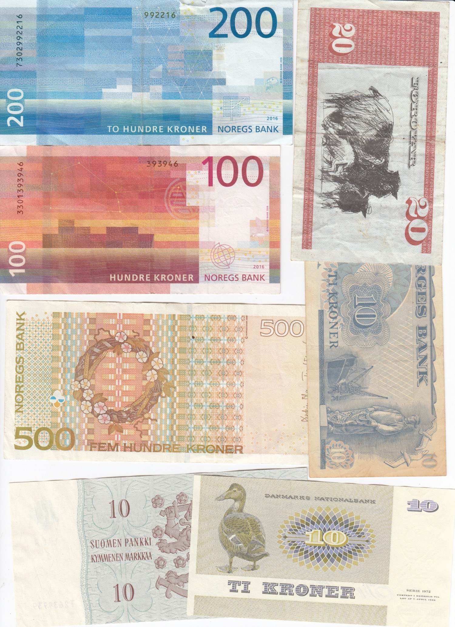 Denmark 10 Kroner 1972, UNC, Pick 48.Finland 10 Markkaa 1963, UNC,, Pick 100.Faeroe Islands 20 Kronur 1949, VF, Pick 19.Norway 10 Kroner 1981, VF, Pick 36c.Norway 100 Kroner 2016, VF, Pick 54.Norway 200 Kroner 2016, VF, Pick 55.Norway 500 Kroner 2015, VF+, Pick 51g.