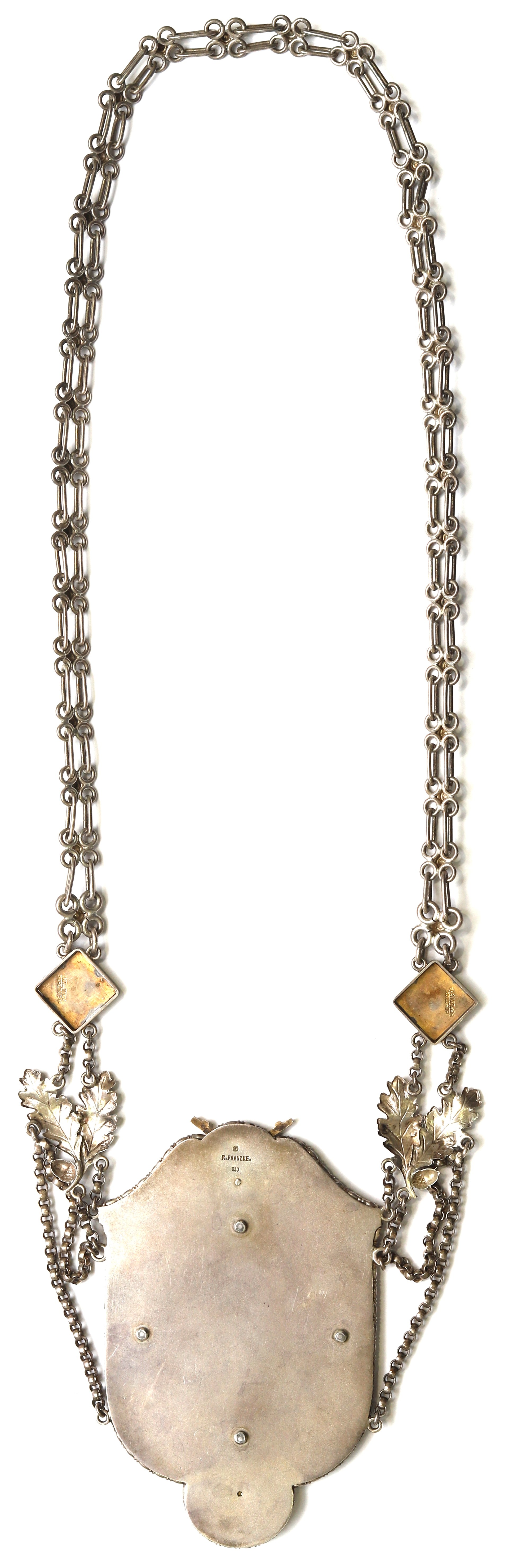 Srebro, złocenie, mosiądz srebrzony, emalia, żelazo, wymiary 44 x 12 cm, waga łączna 190 g.