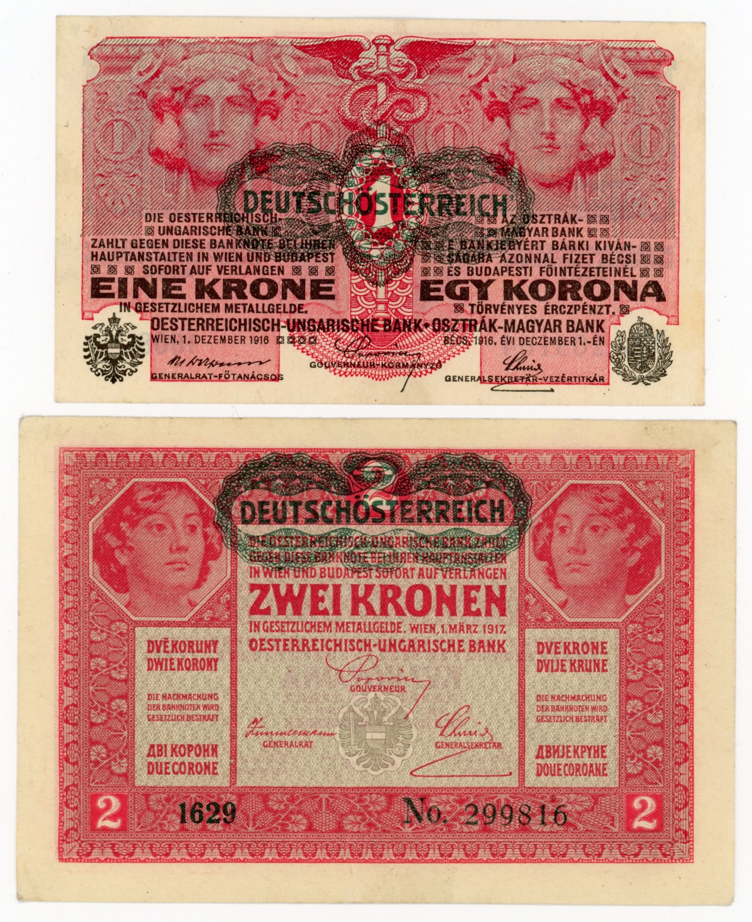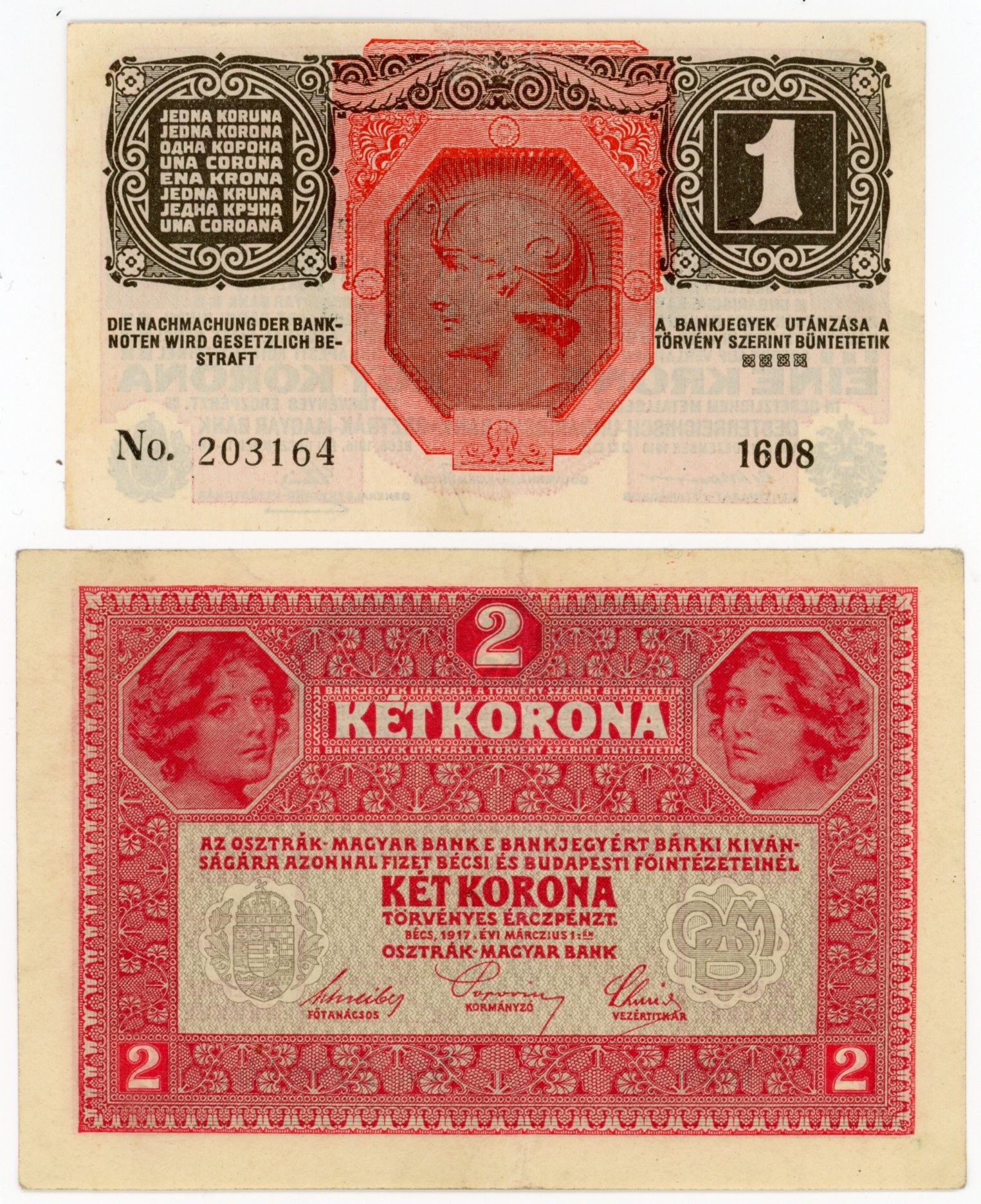 Austria, zestaw 1 korona 1916 i 2 korony 1917. Razem 2 szt. Banknot 1 korona - stan zachowania 1; Banknot 2 korony - stan zachowania 2. Literatura: