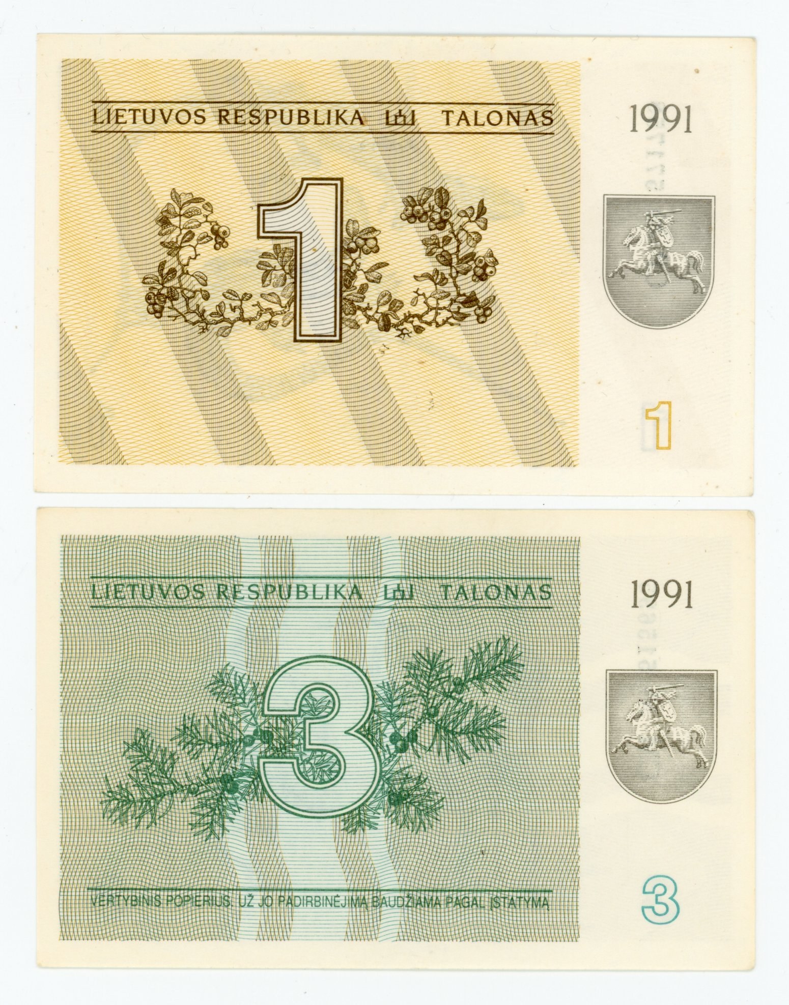 Litwa, 1 i 3 Talonas 1991. Razem 2 szt. Stan zachowania: 1. Emisyjny stan zachowania. Literatura: Pick 32 a), 33 b)