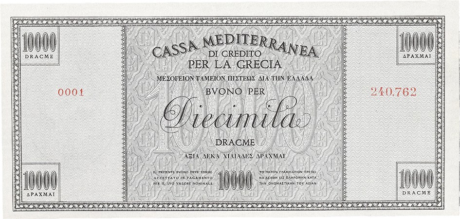 10000 drachmes - Occupation italienne (WWII) ND (1941). PMG 64 EPQ Choice Uncirculated (2184302-076).