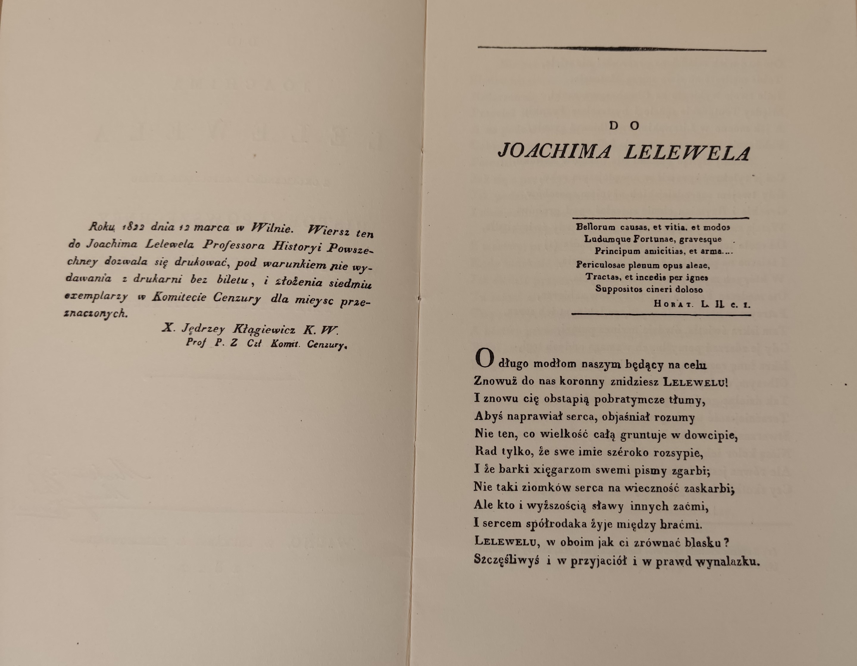 DO JOACHIMA LELEWELA Z OKOLICZNOŚCI ROZPOCZĘCIA KURSU HISTORYI POWSZECHNEY W UNIWERSYTECIE WILEŃSKIM DNIA 6 STYCZNIA 1822 ROKU - pierwsze wydawnictwo Towarzystwa Bibliofilów w Toruniu