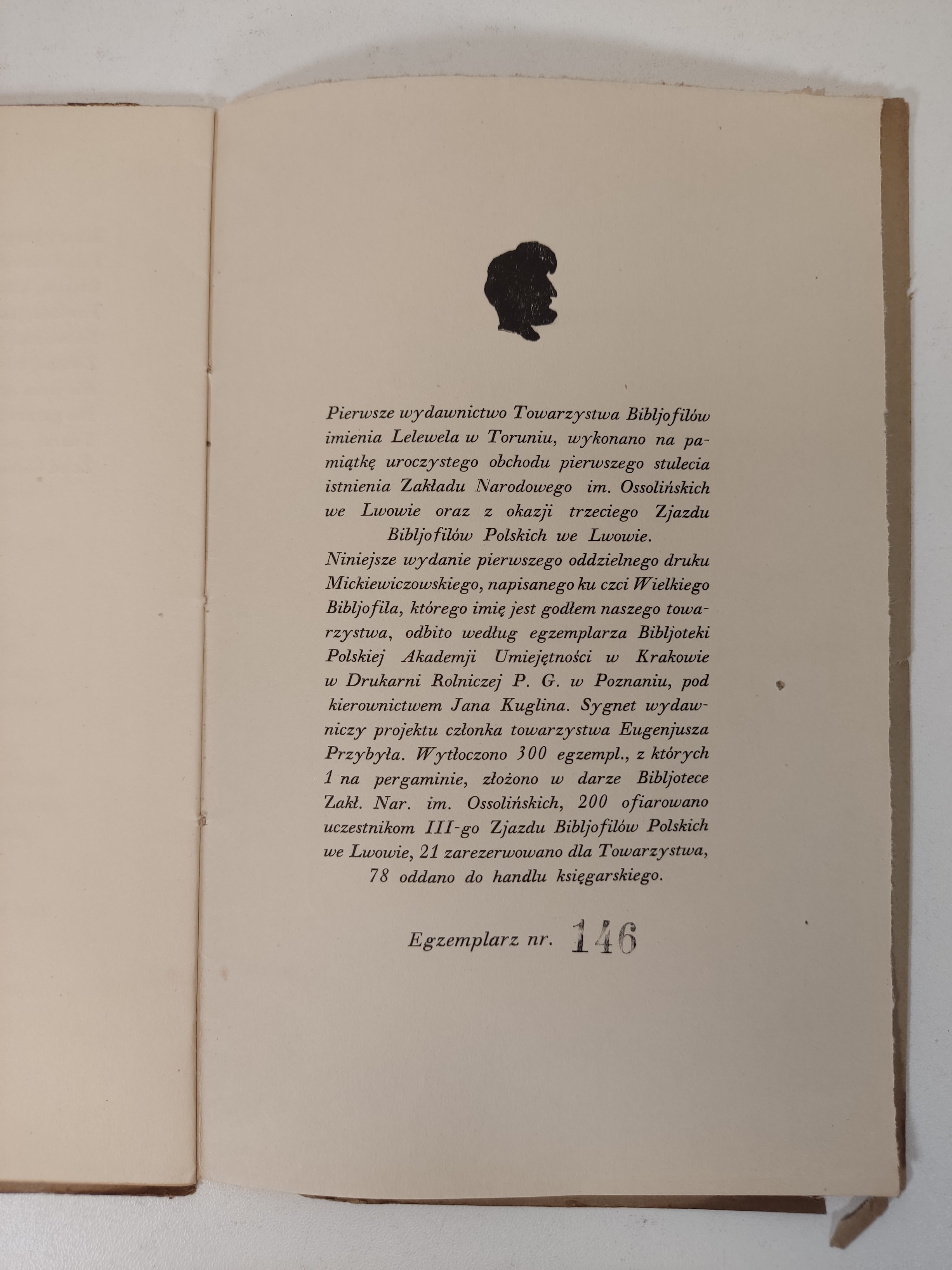 Pierwsze wydawnictwo Towarzystwa Bibliofilów im. Lelewela w Toruniu, wykonane na pamiątkę uroczystego obchodu pierwszego stulecia istnienia Zakładu Narodowego im. Ossolińskich we Lwowie oraz z okazji trzeciego Zjazdu Bibliofilów Polskich we Lwowie. Niniejsze wydanie pierwszego oddzielnego druku Mickiewiczowskiego, napisanego ku czci Wielkiego Bibliofila Joachima Lelewela, odbito według egzemplarza Biblioteki Polskiej Akademii Umiejętności w Krakowie w Drukarni Rolniczej P. G. w Poznaniu, pod kierownictwem Jana Kuglina. Sygnet wydawniczy projektu członka towarzystwa Eugeniusza Przybyła. Wytłoczono 300 egzemplarzy. Ten egzemplarz numer 146.