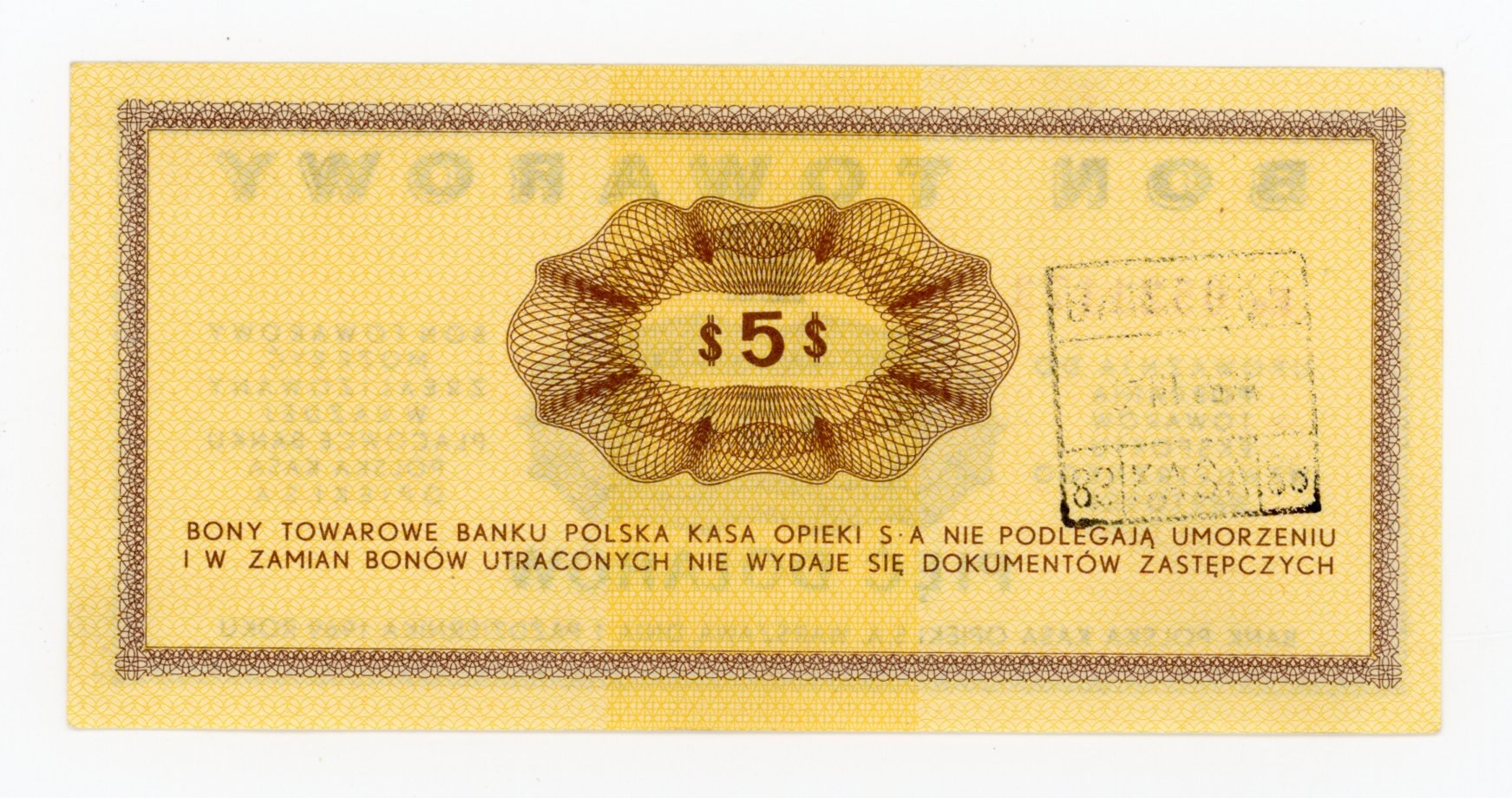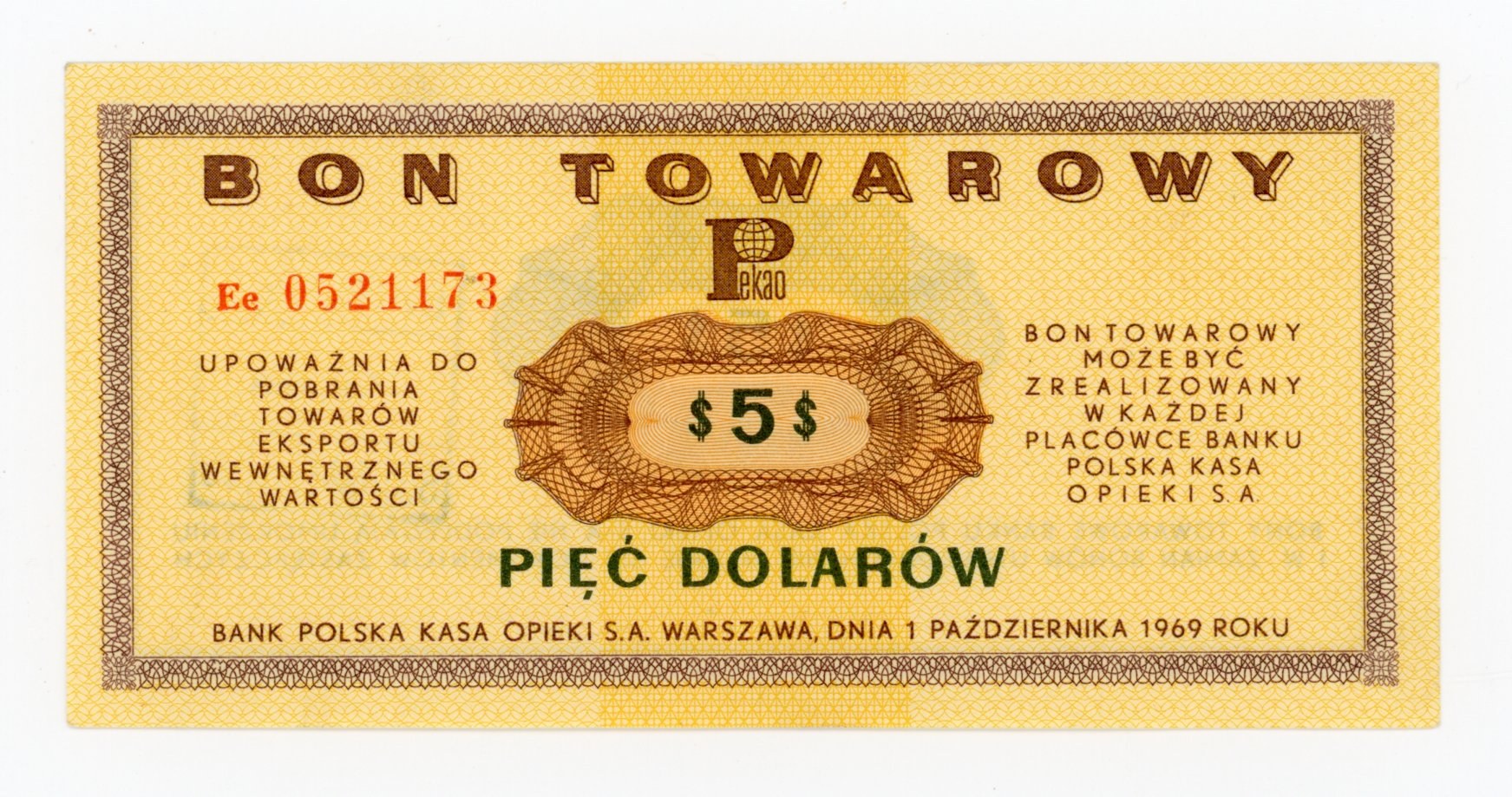 Pewex, 5 dolarów 1969 Ee. Stan zachowania 2+. Bardzo słabe ugięcie pionowe, prawie niedostrzegalne i niewidoczne w świetle przechodzącym. Słabe złamanie lewego górnego rogu nie wychodzące za margines. Literatura: Miłczak B19a