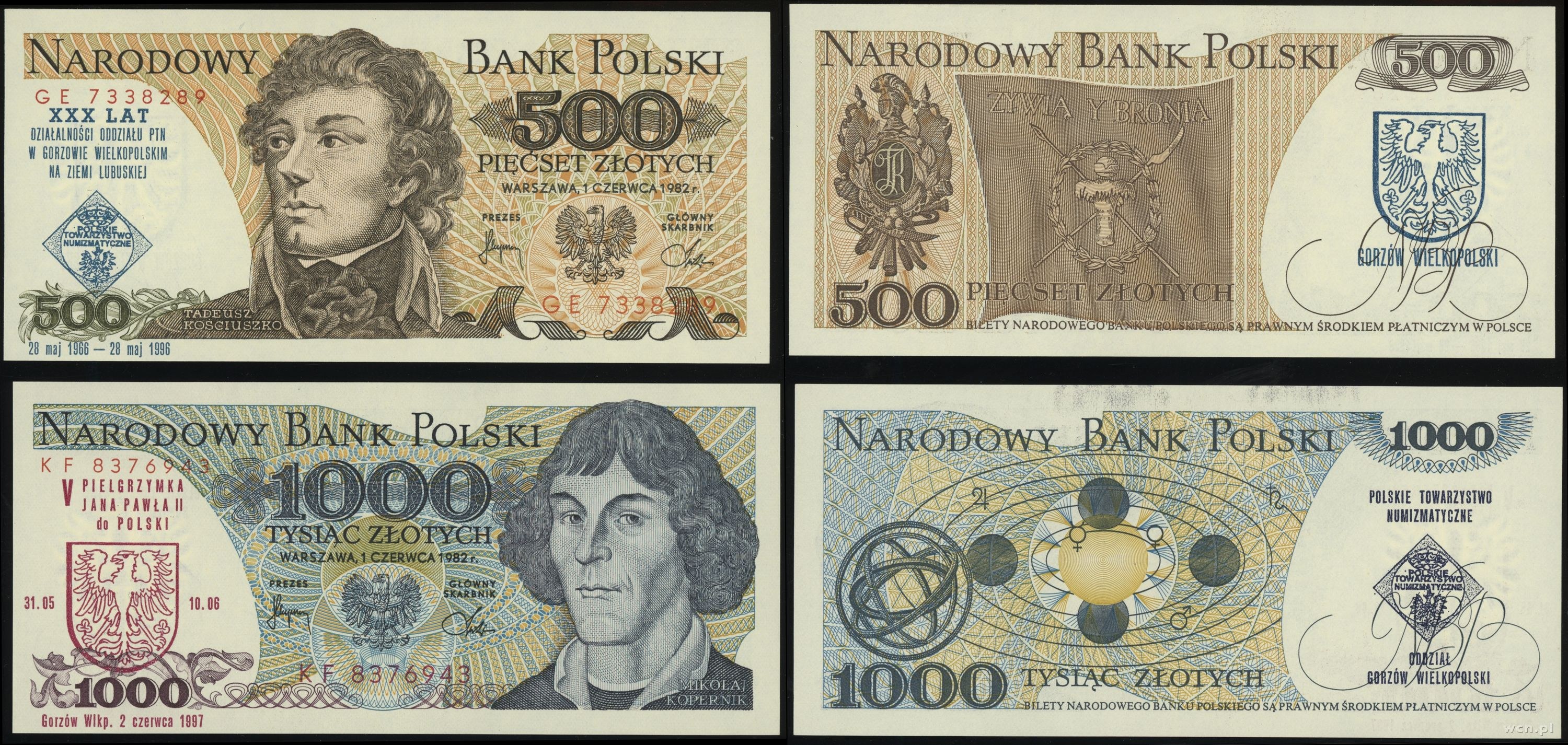 1) 500 złotych emisji 1.06.1982 seria GE 2) 1.000 złotych emisji 1.06.1982 seria KF