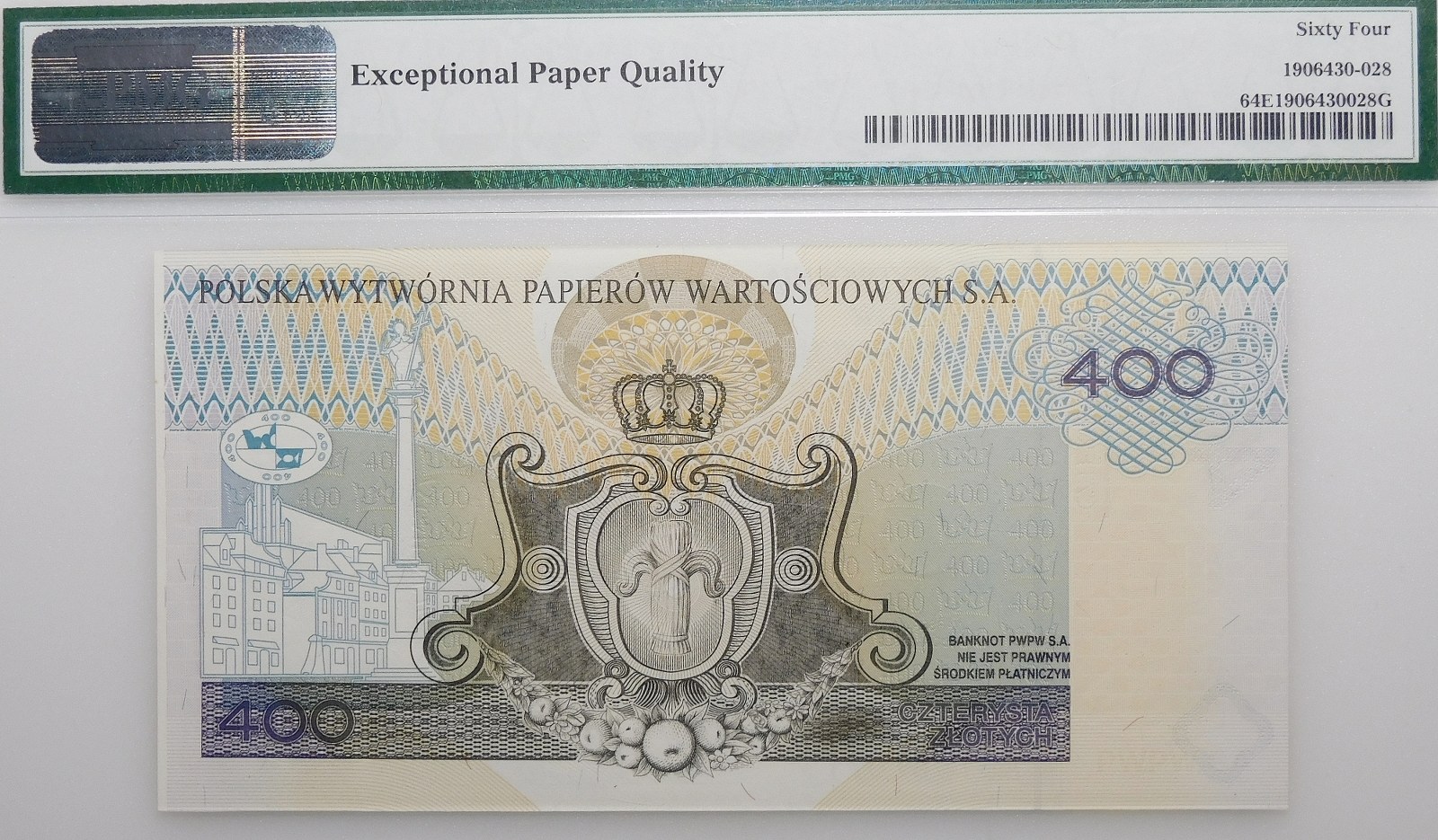 Banknot studyjny PWPW o nominale 400 złotych 1996 z wizerunkiem króla Zygmunta III Wazy.