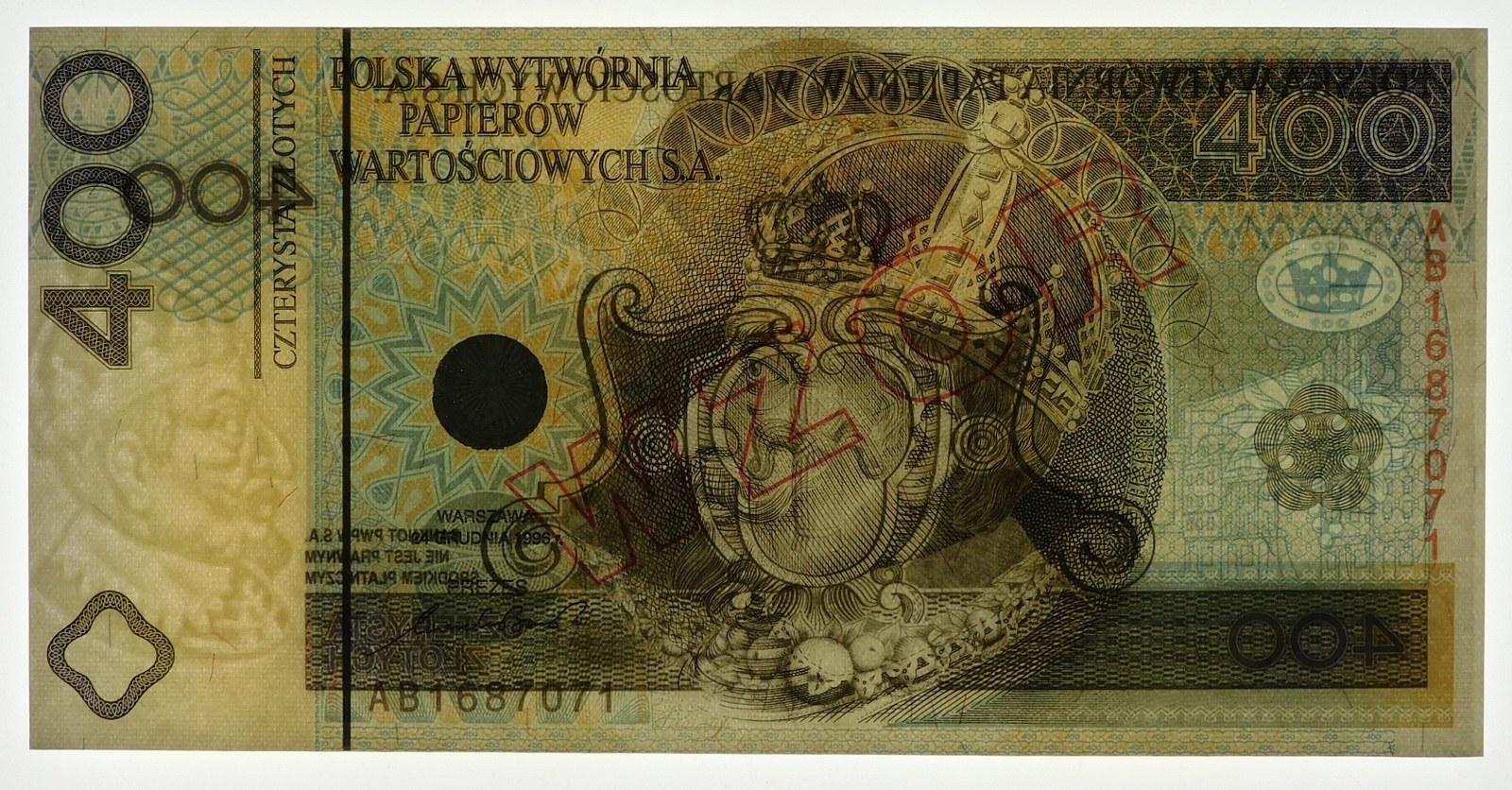 * zastosowanie druku kontowego (suchy wklęsłodruk) - widoczny nominał 400 pod odpowiednim kątem,