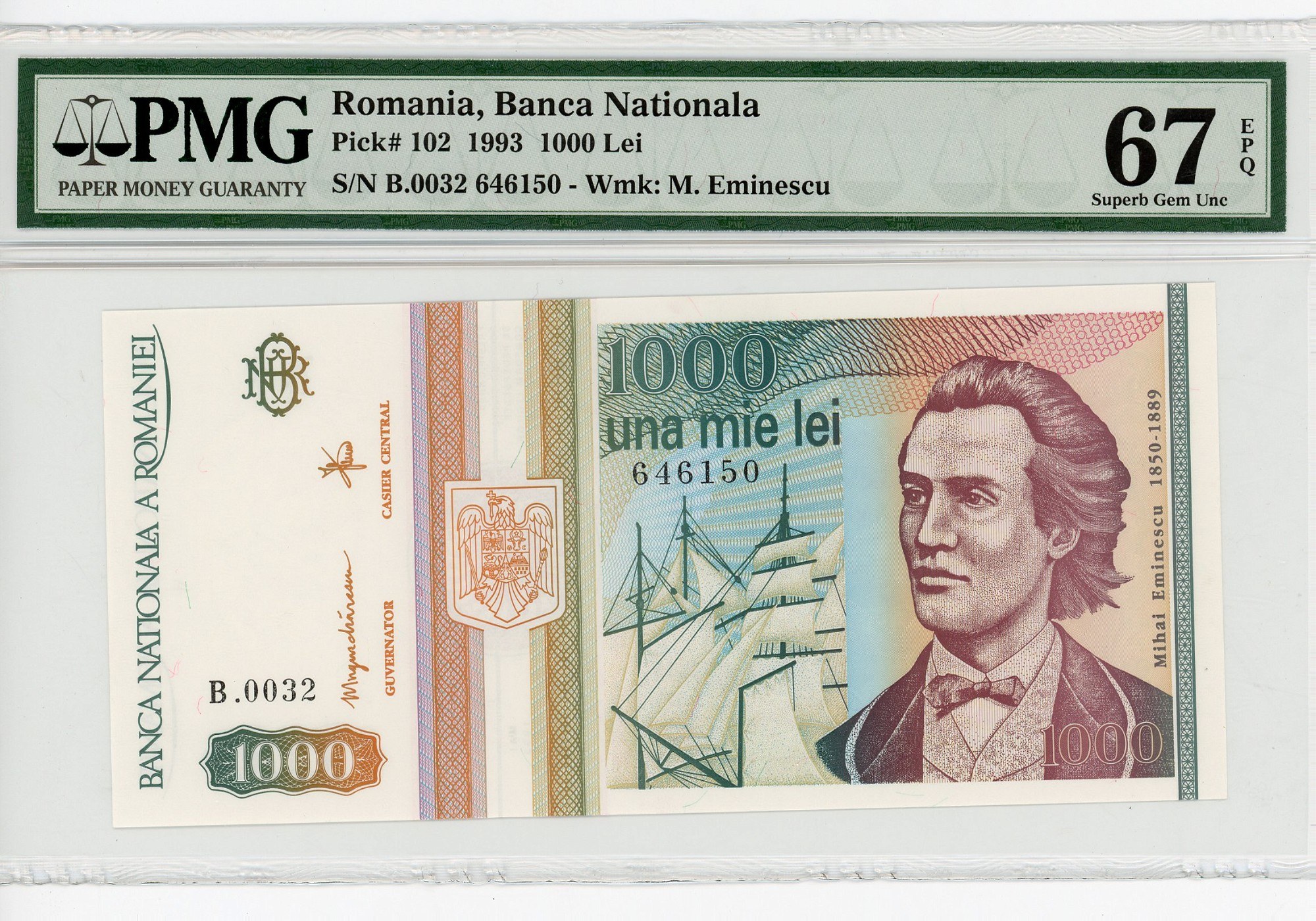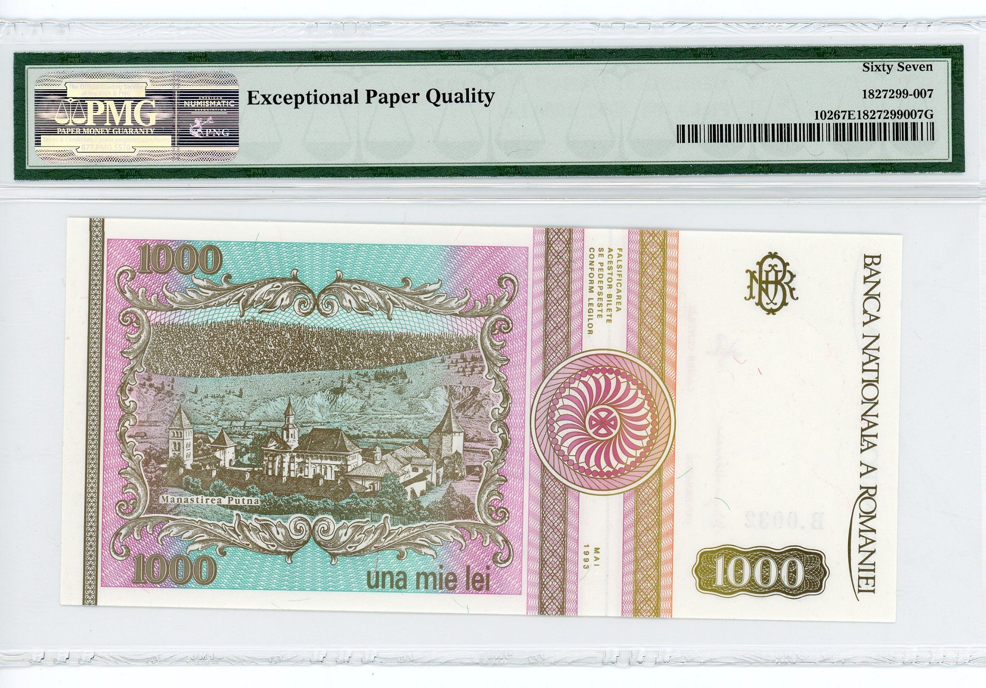Romania 1000 Lei 1993 PMG 67EPQ Superb UNC