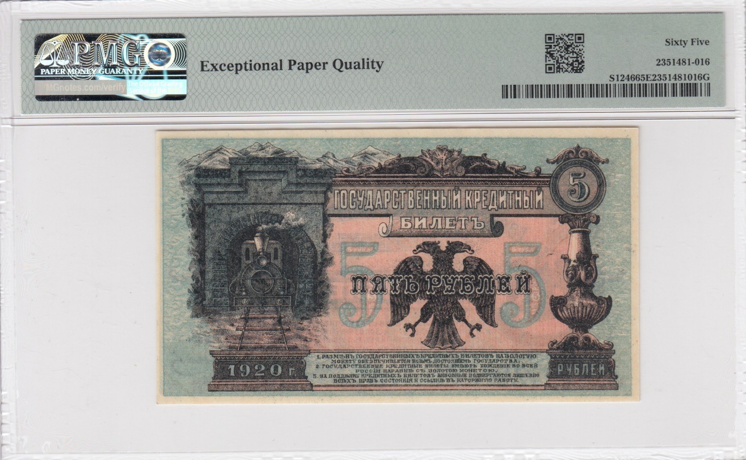 Russia (E. Siberia, Far East Provisional Gov't) 5 Rubles 1920 - PMG 65 EPQ Gem Uncirculated
