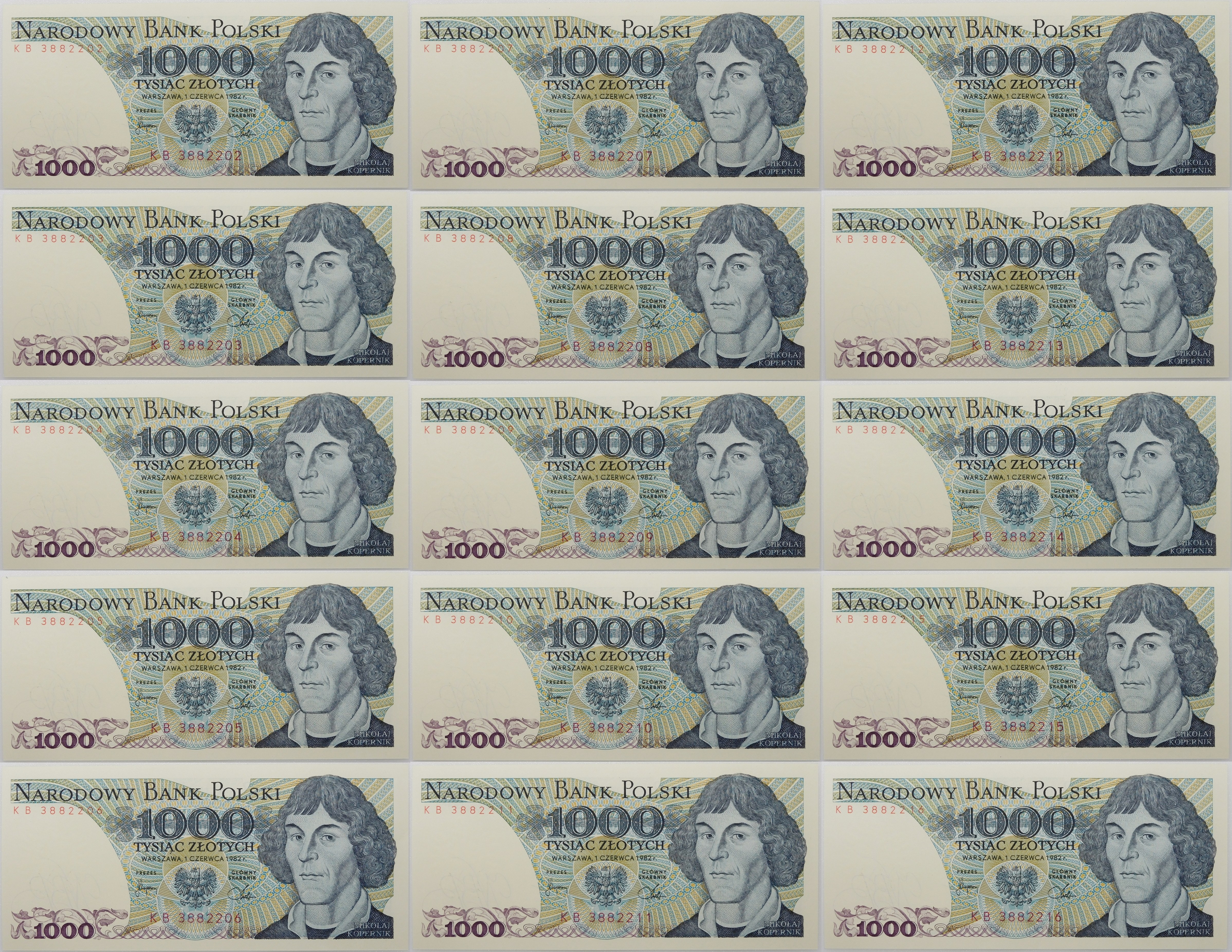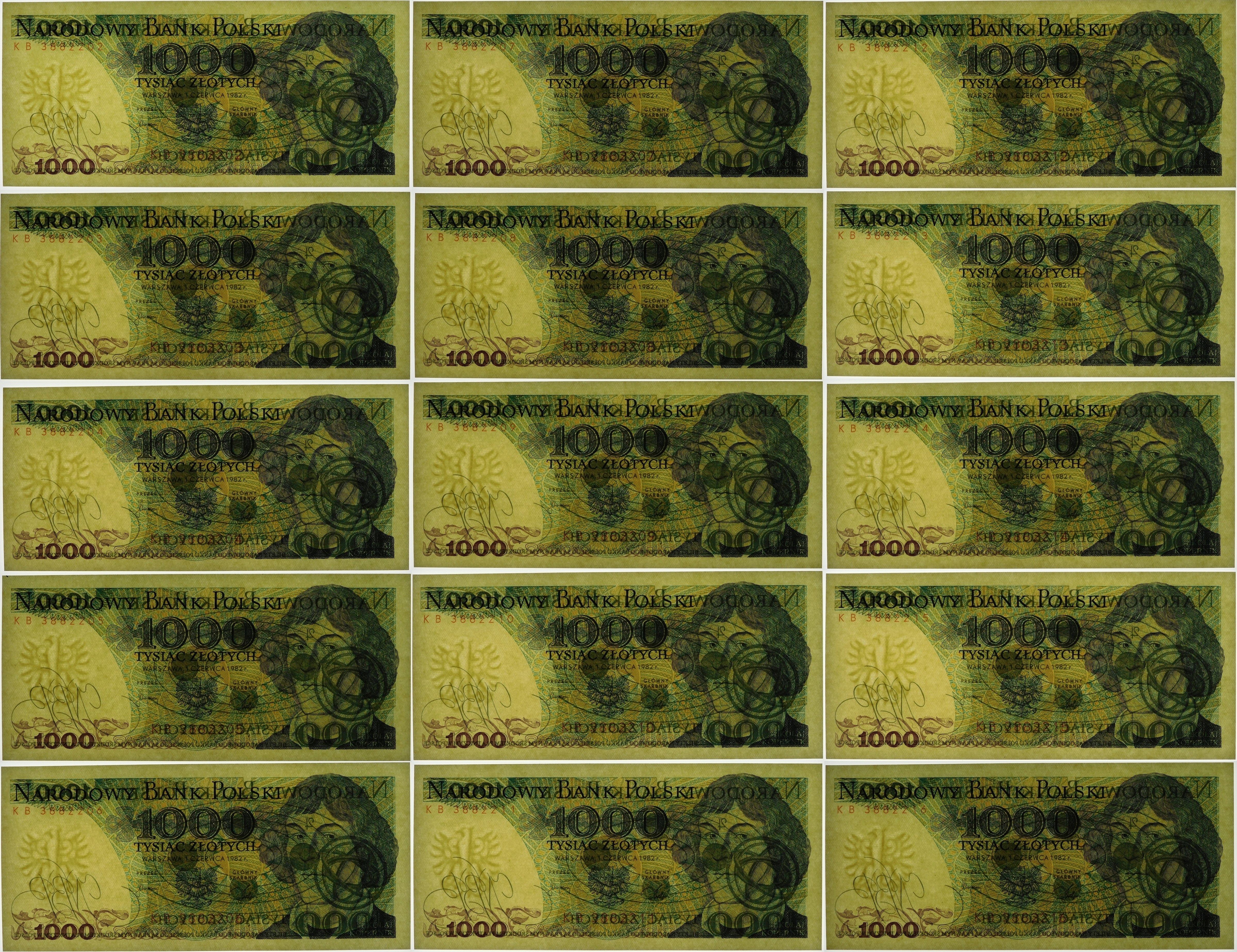 Zestaw piętnastu banknotów 1000 złotych 1982, 15 x ser. KB - banknoty z paczki bankowej o kolejnych numerach