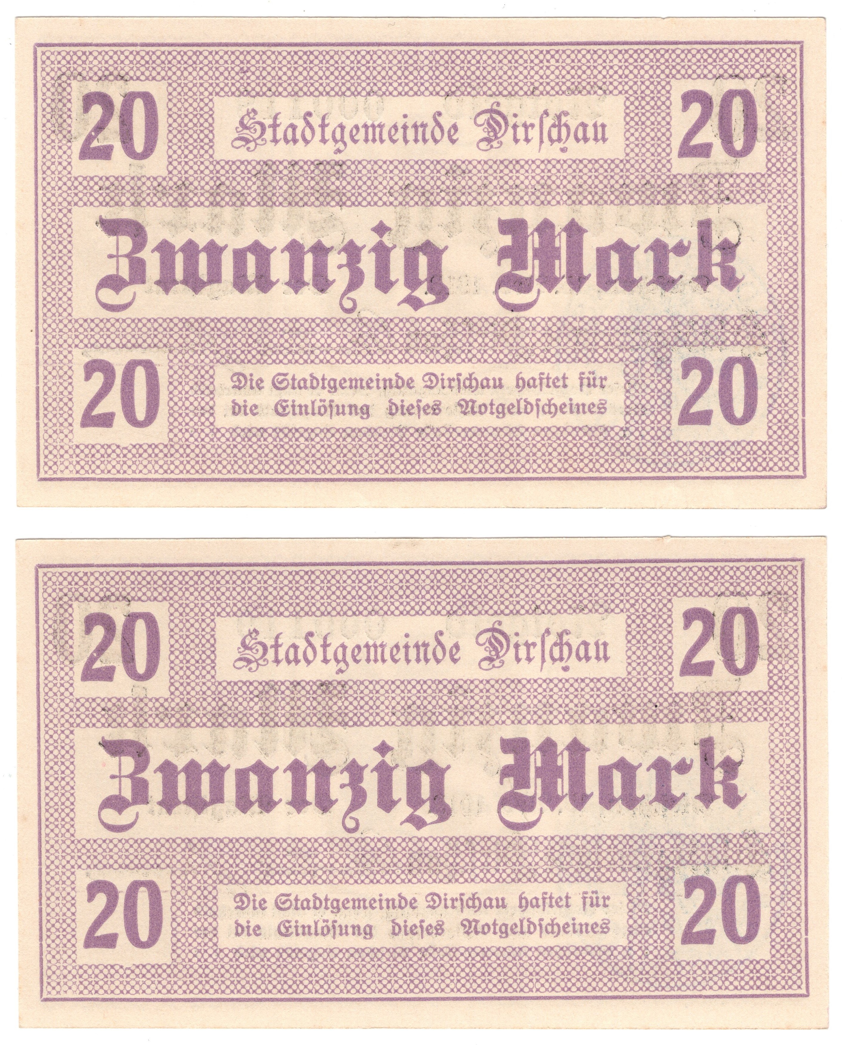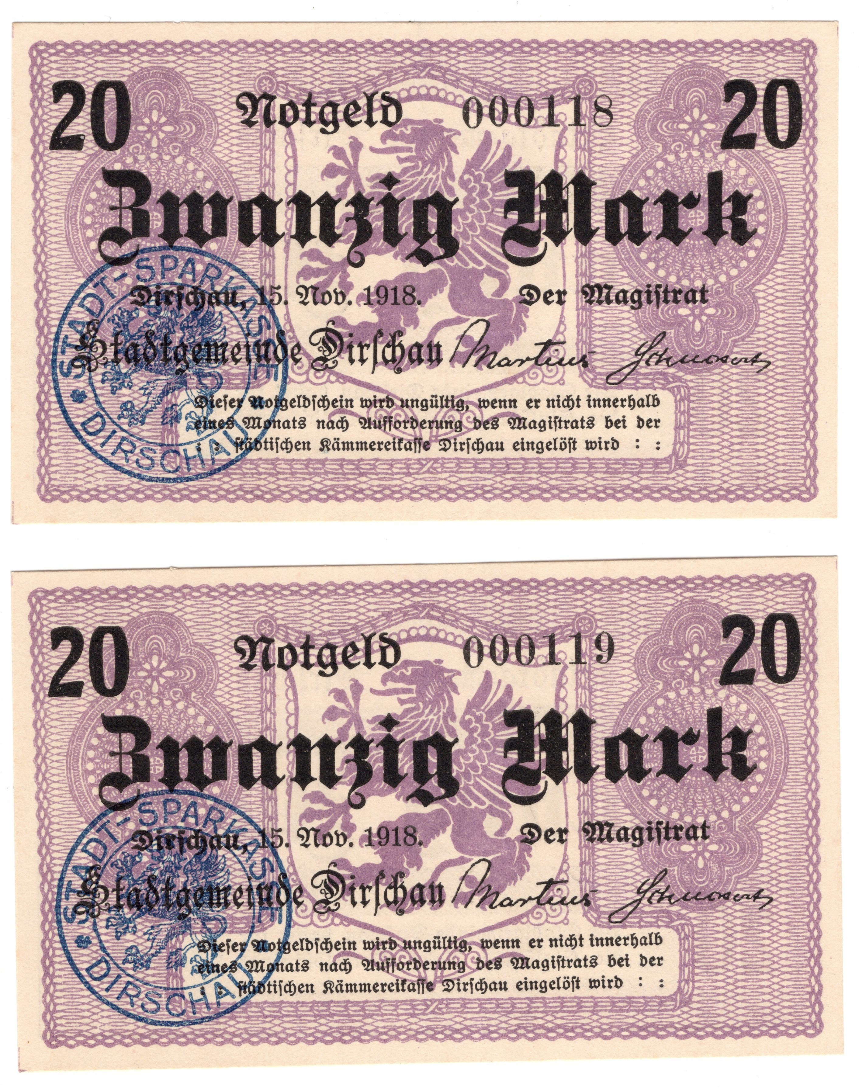Tczew (Dirschau), 20 marek 1918 - zestaw 2 sztuk, dwa kolejne niskie numery