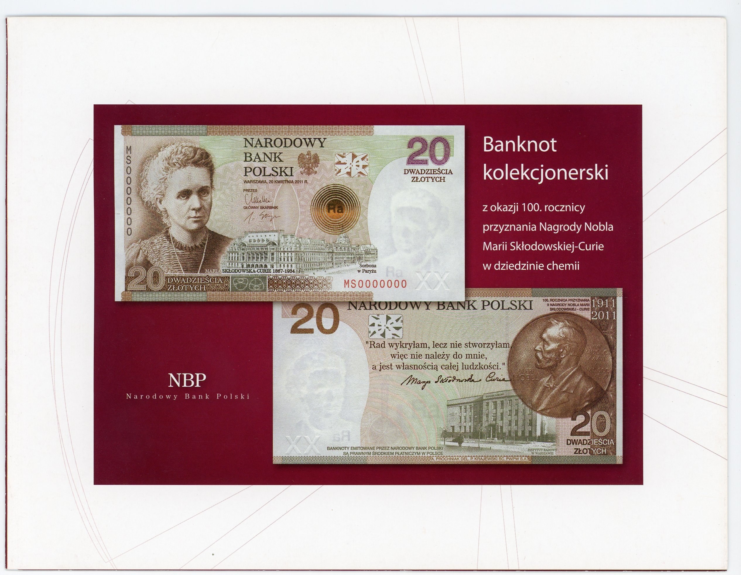 Piąty Polski Banknot Kolekcjonerski. 100. rocznica przyznania Nagrody Nobla Marii Skłodowskiej - Curie w dziedzinie chemii.