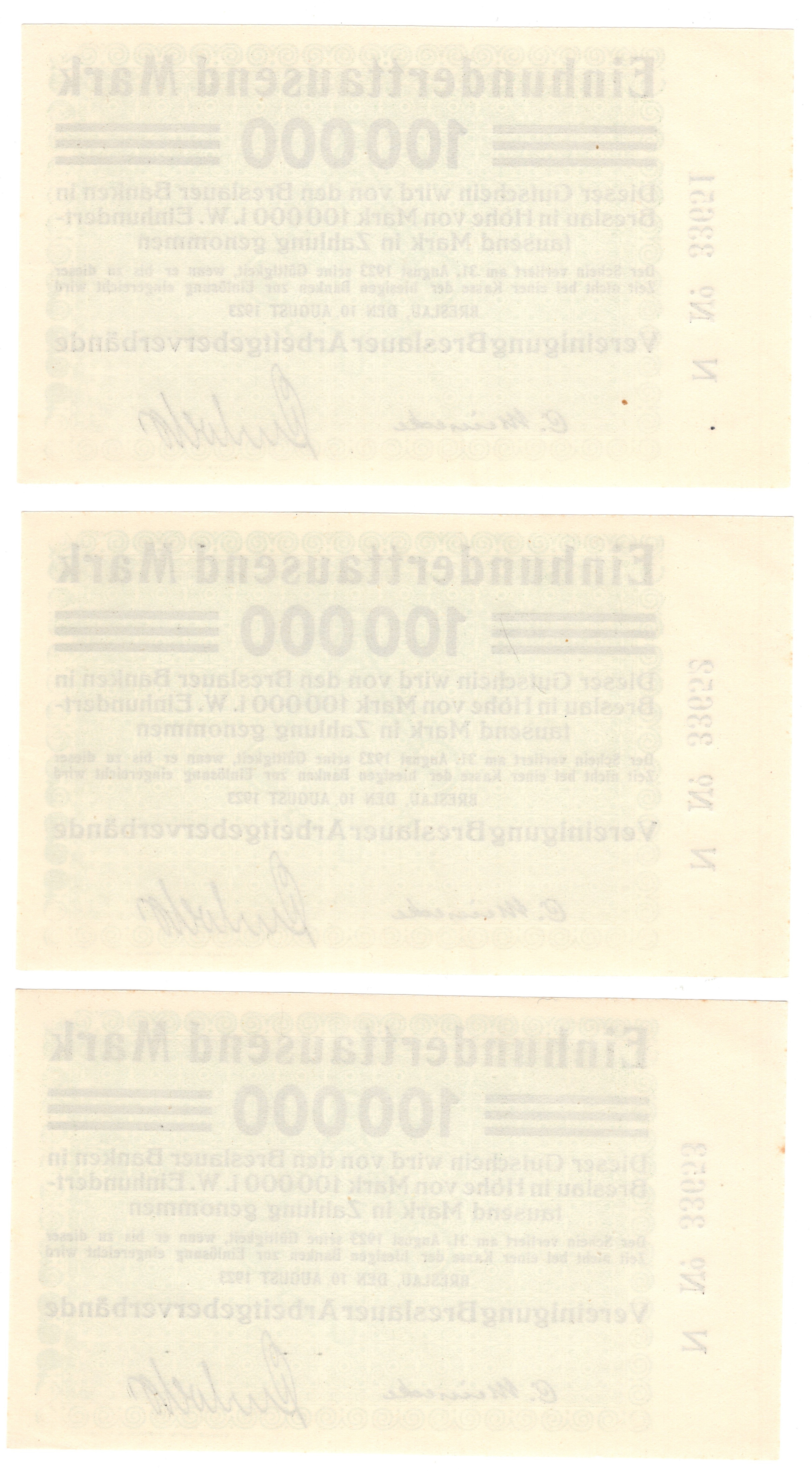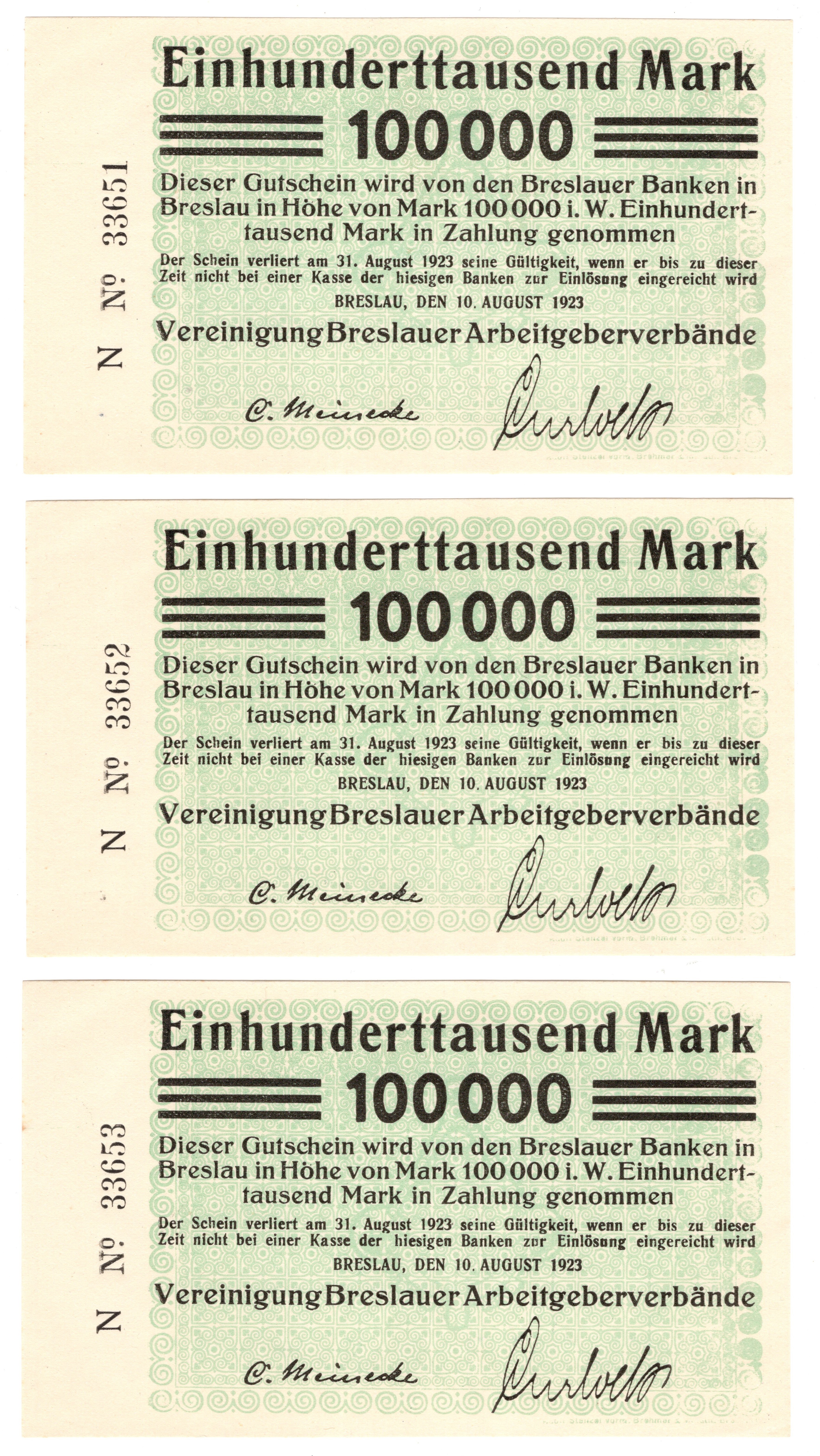Wrocław (Breslau), 100 000 marek 1923 - zestaw 3 kolejnych numerów