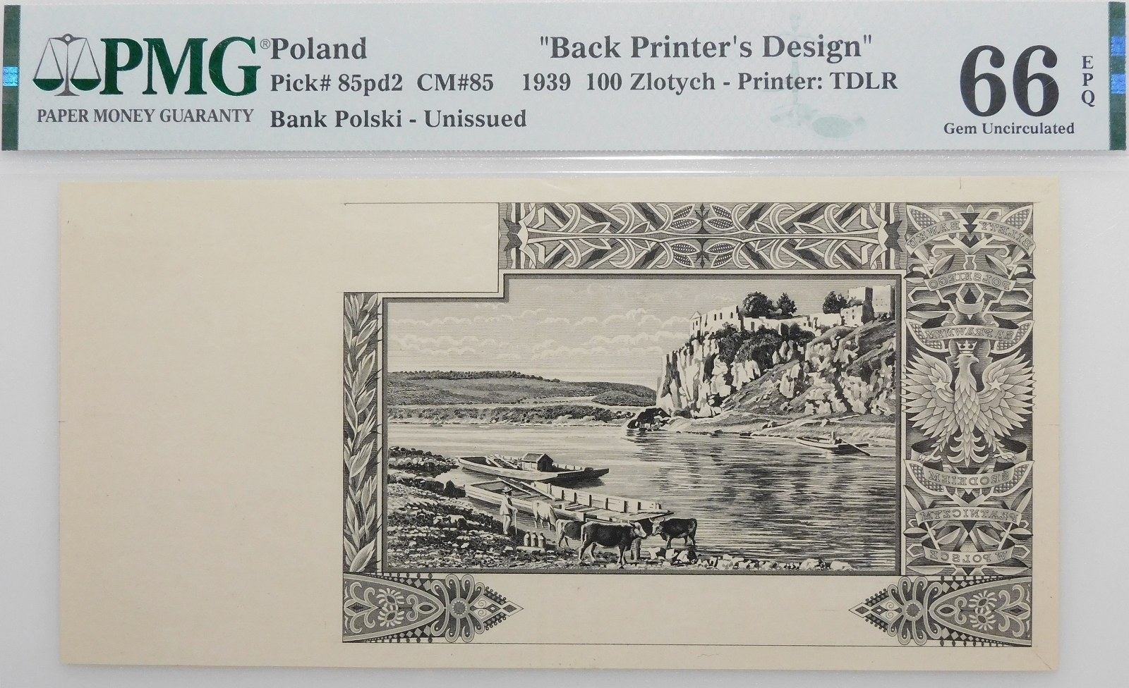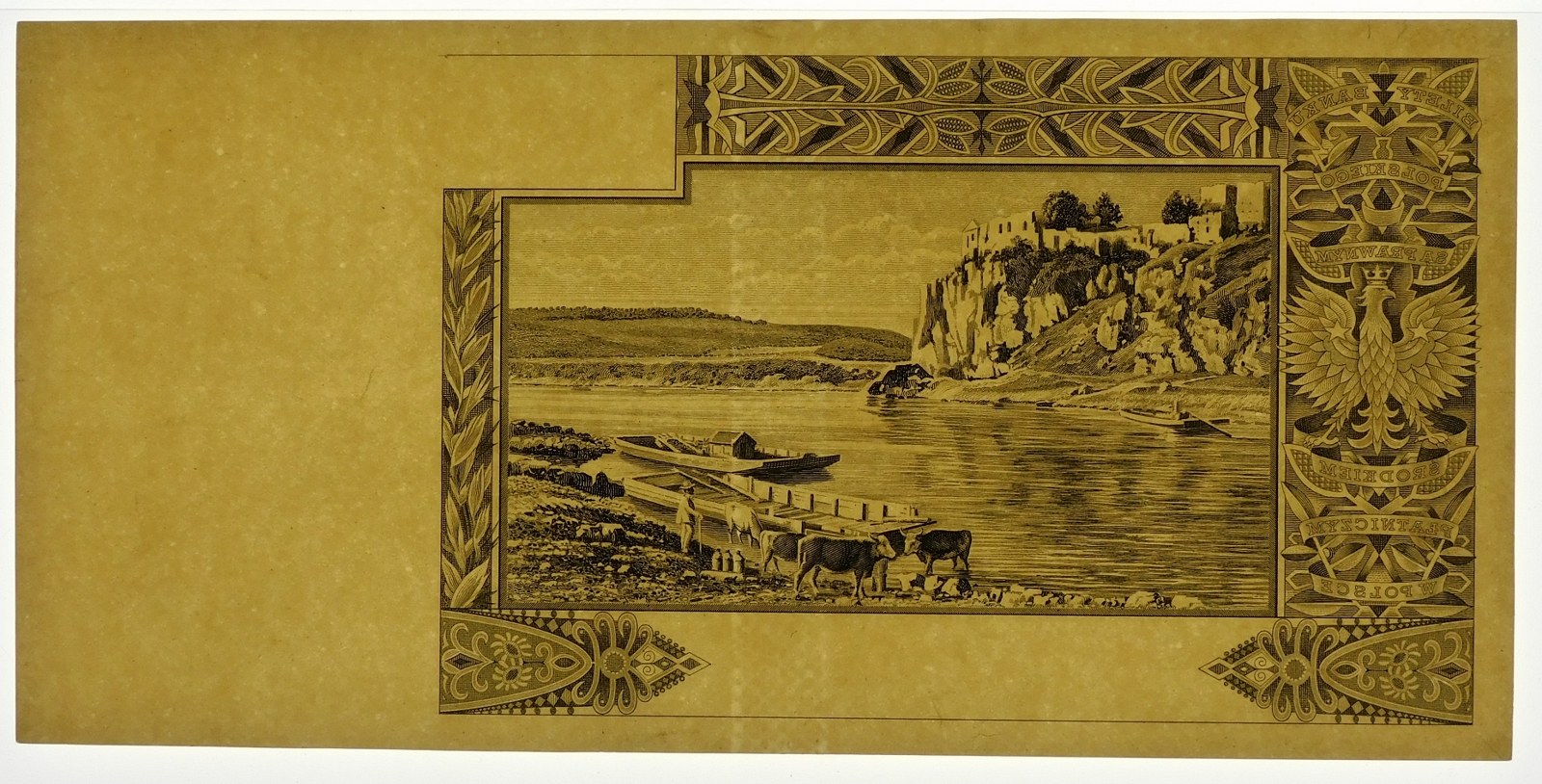 Próbna odbitka druku stalorytniczego rewersu 100 złotych 1939 drukarni TDLR - w odbiciu lustrzanym (wersja niezatwierdzona)