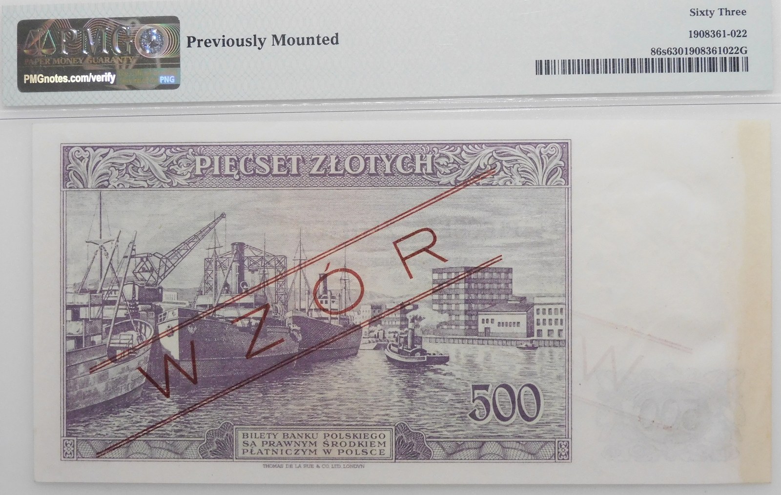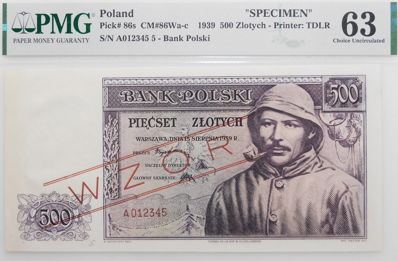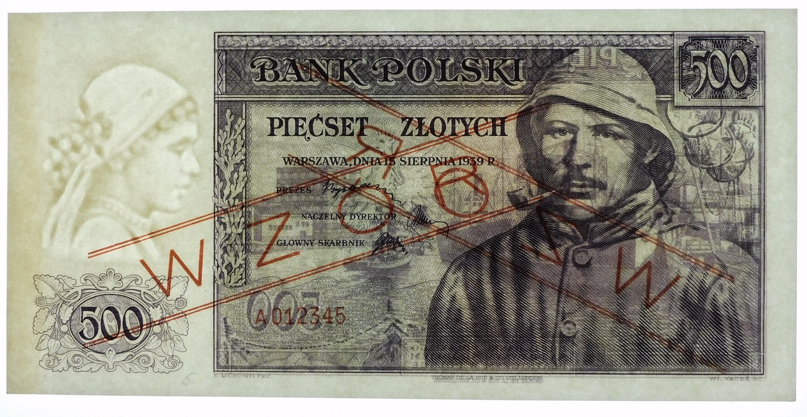 Banknot 500 złotych 1939 WZÓR - ser. A , numeracja kolejna: 012345 ,