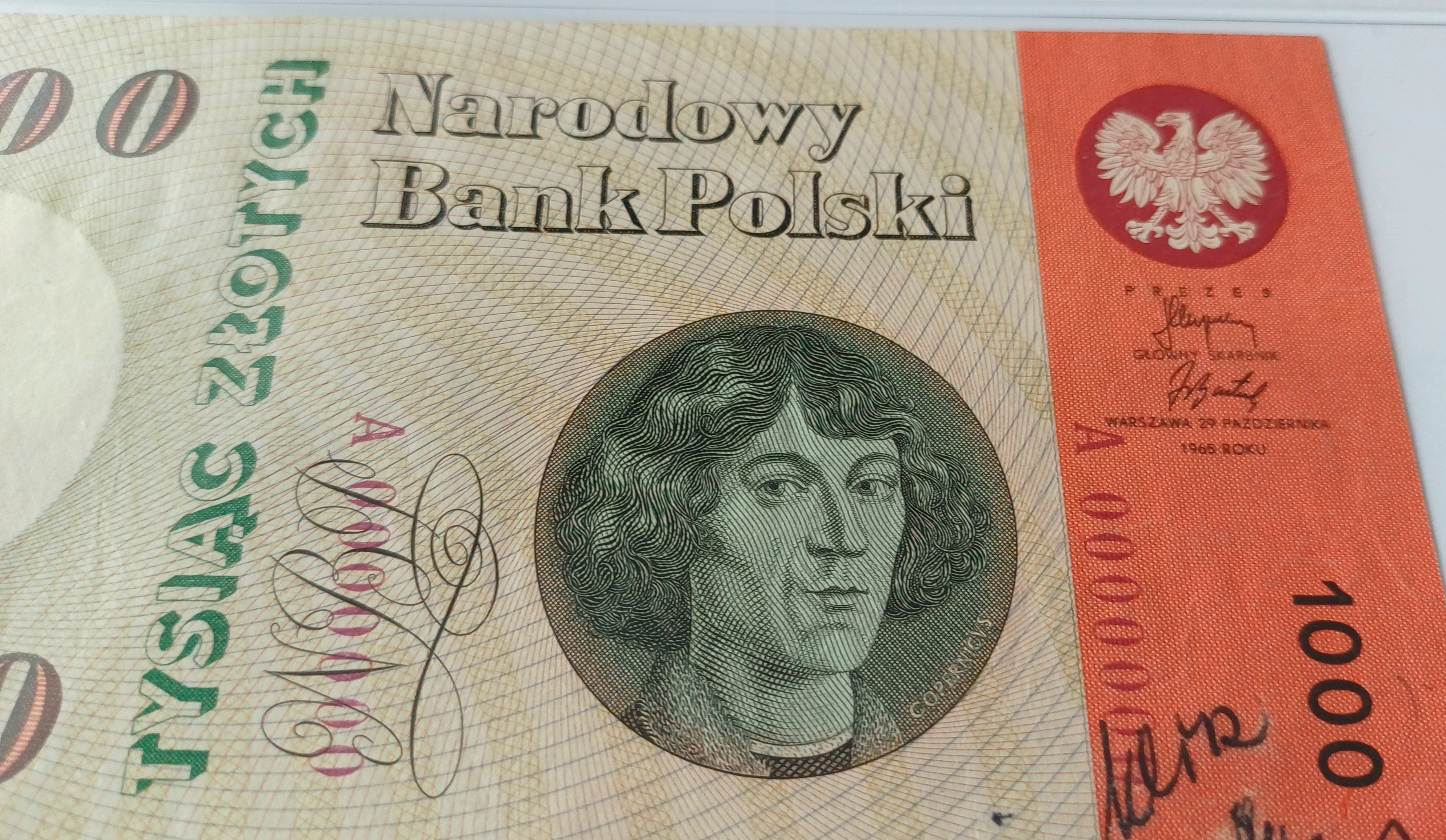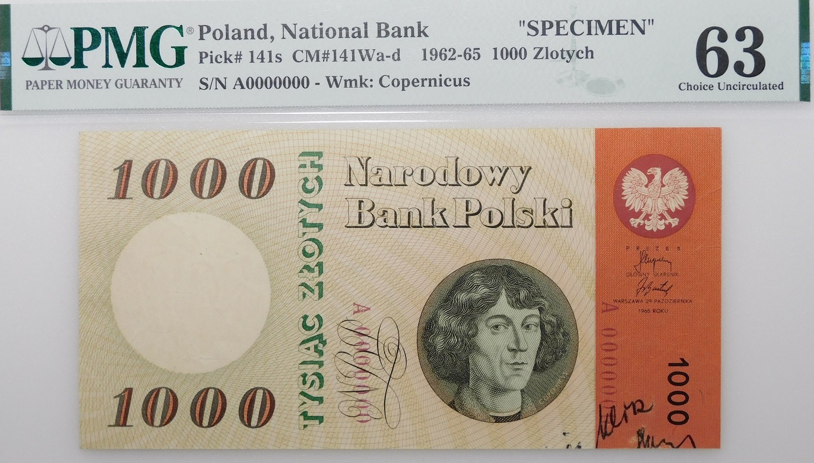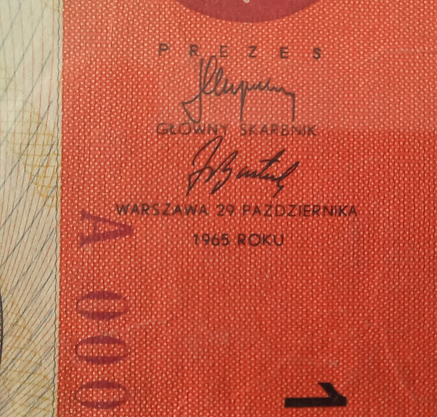 Bardzo rzadki AKCEPT znany zaledwie z kilku zachowanych egzemplarzy, pochodzący z zasobów archiwalnych, dodatkowo z adnotacją z epoki po prawej stronie, na dolnym marginesie. To nie jest rzadkie 1000 złotych 1962 r., w odróżnieniu od niego banknot posiada właściwy podpis prezesa NBP oraz datę późniejszą, taką jakie posiadały obiegowe banknoty 1000 złotych tj. 29 październik 1965 r.