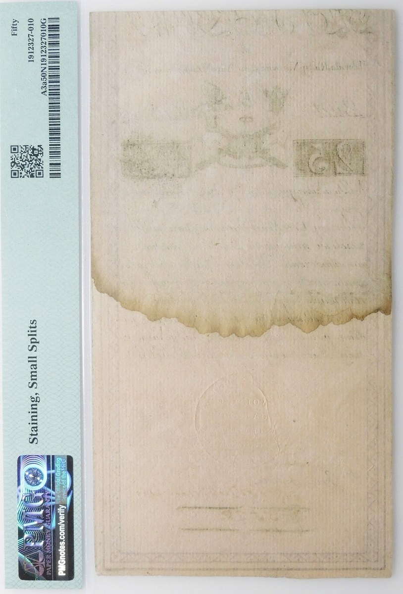 Banknot naturalny, z zachowaną naturalną "żeberkową" fakturą papieru czerpanego, rzadszy wariant, z fragmentem filigranu w papierze w postaci napisu [PIETER DE VRIES] - górnego fragmentu filigranu pomocniczego, producenta papieru czerpanego, który swój wyrób oznaczał filigranem: PIETER DE VRIES & COMP- .