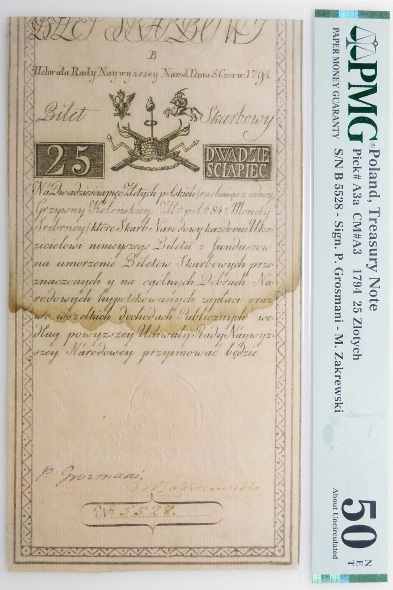 Egzemplarz o dobrej prezencji, w niespotykanej obecnie kolorystyce, tj. w swym naturalnym kolorze z epoki, w odcieniu POMARAŃCZOWYM, zwłaszcza widoczne jest to w jego dolnej części, poniżej linii zacieku. Obecnie w większości zachowanych 25 złotych 1794 spotykamy w kolorze szarym, rzadziej kremowym. Banknot o wyjątkowej jakości druku, jednakże z zaciekiem, co zostało odnotowane w opisie na slabie. Bardzo dobrze widoczna sucha pieczęć, jak i podpisy dwóch komisarzy P. Grozmaniego i M. Zakrzewskiego, każdy wykonany innym gatunkiem atramentu.