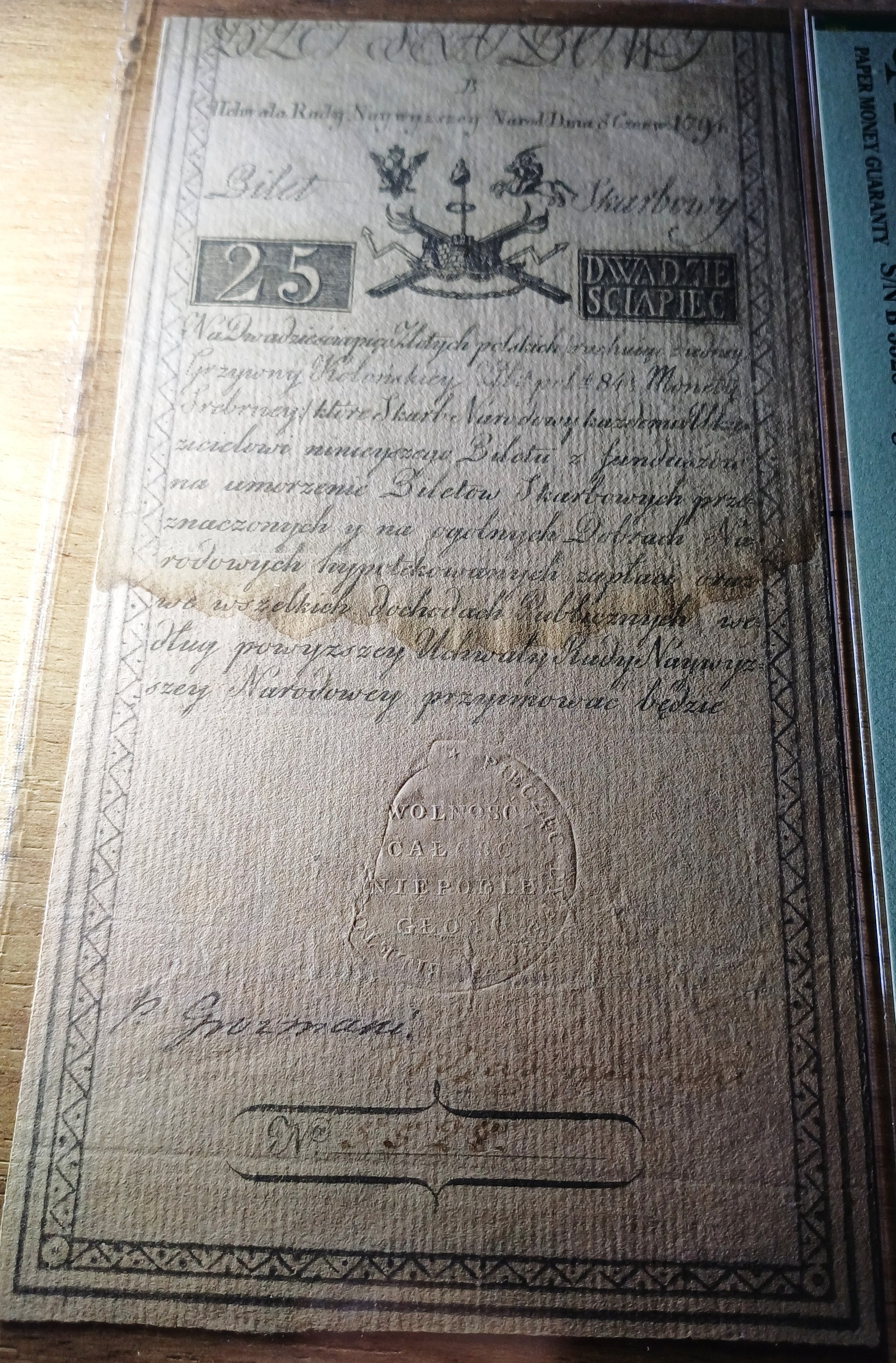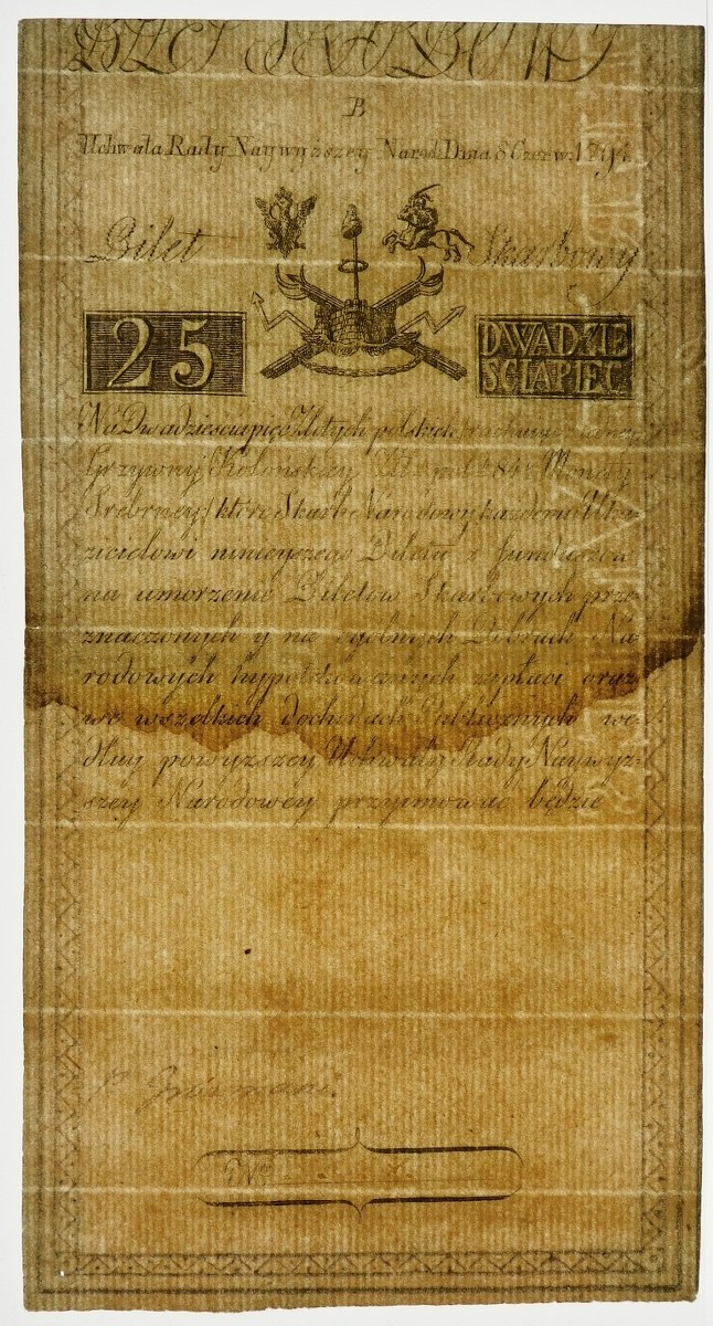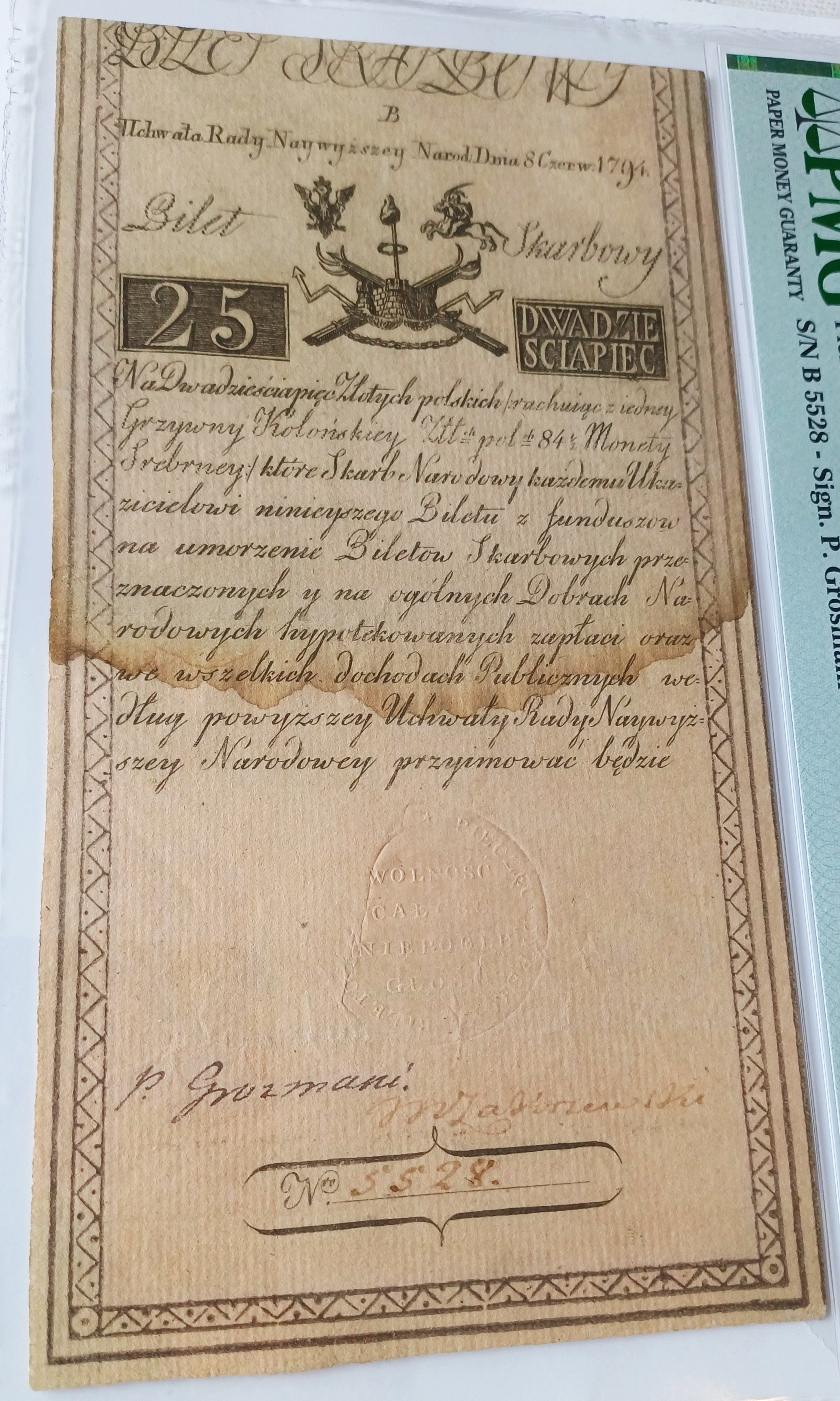 Bilet skarbowy Insurekcji Kościuszkowskiej 25 złotych 1794, serii B i rzadziej występującej numeracji 4-cyfrowej: 5528 (zdecydowanie rzadziej spotykaną od 5-cyfrowej).