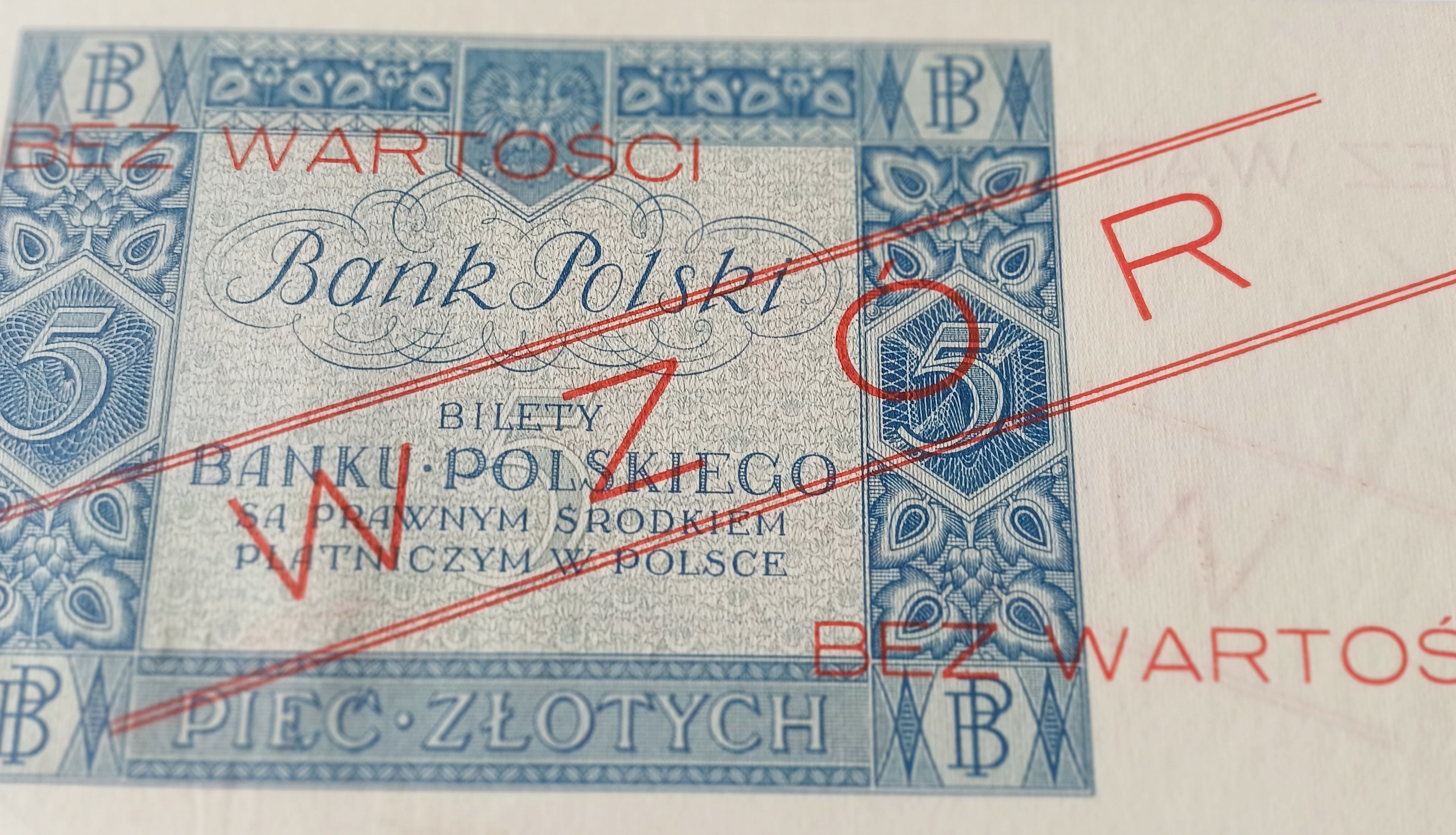Banknot z ukośnym, obustronnym nadrukiem WZÓR, umieszczonym pomiędzy dwoma podwójnymi liniami, nadruk "BEZ WARTOŚCI" 2x znaczony na każdej stronie banknotu, nadruki w kolorze czerwonym.