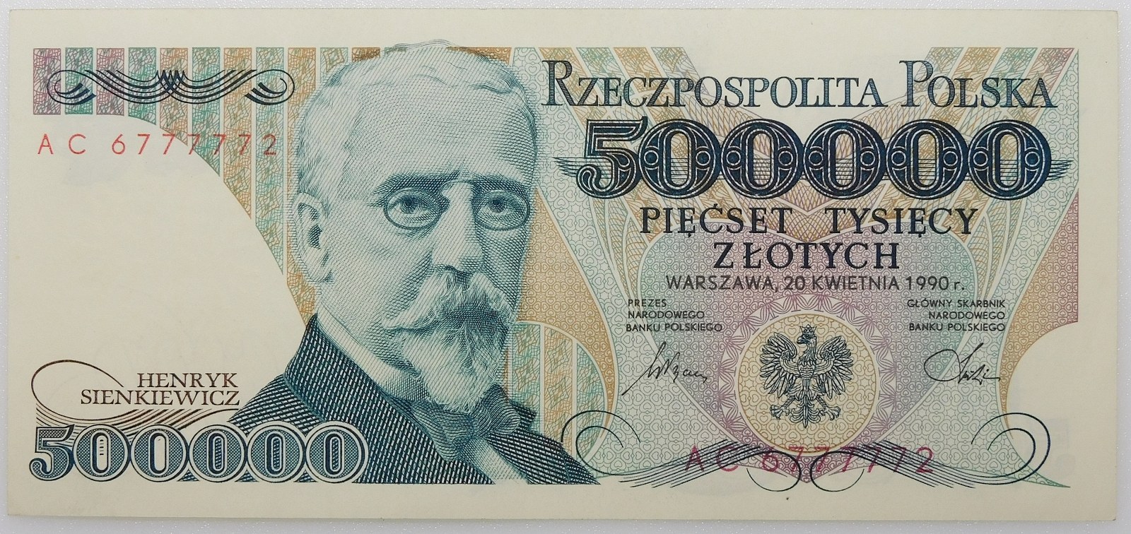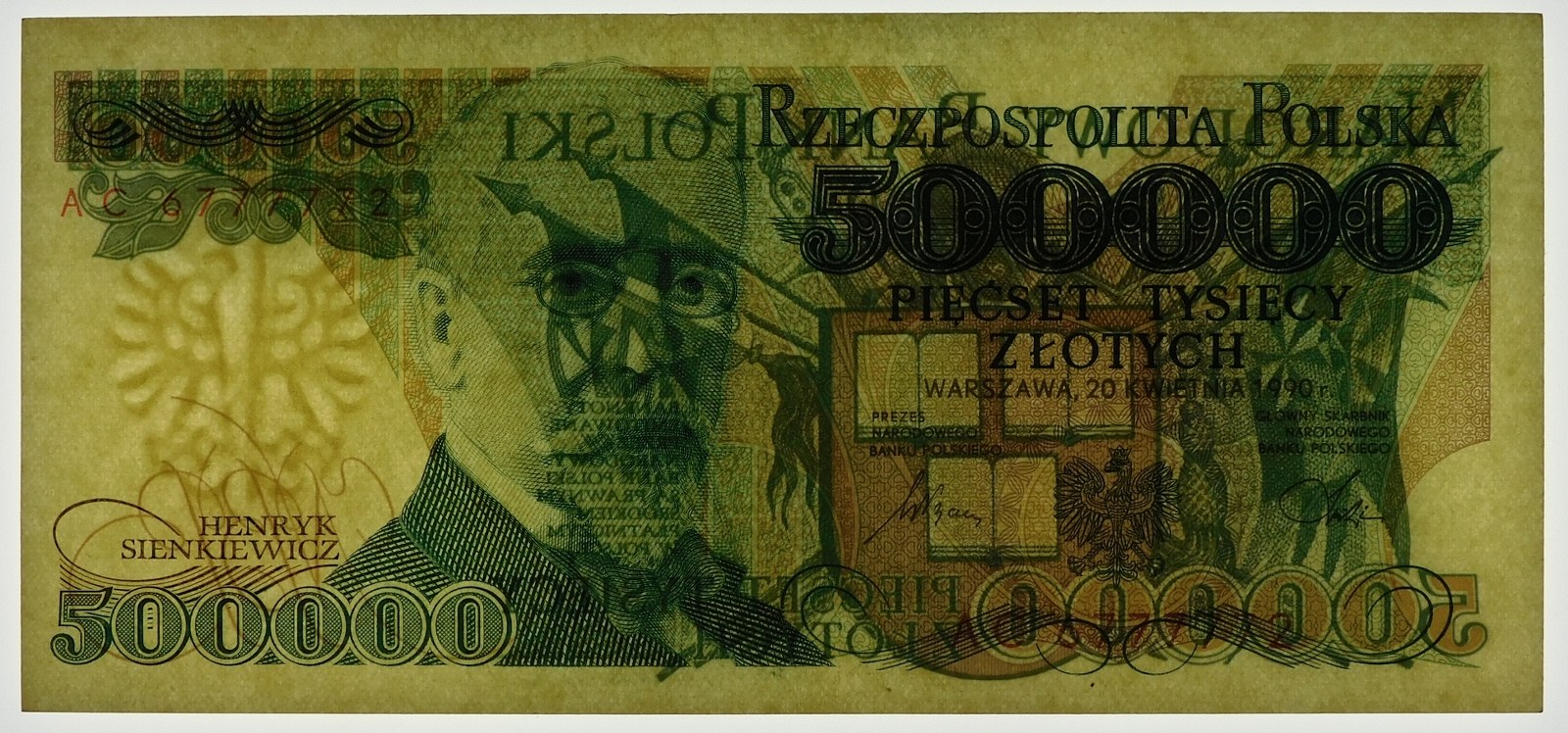 Banknot 500.000 złotych 1990, ser. AC - seria dwuliterowa rzadka dla tego nominału