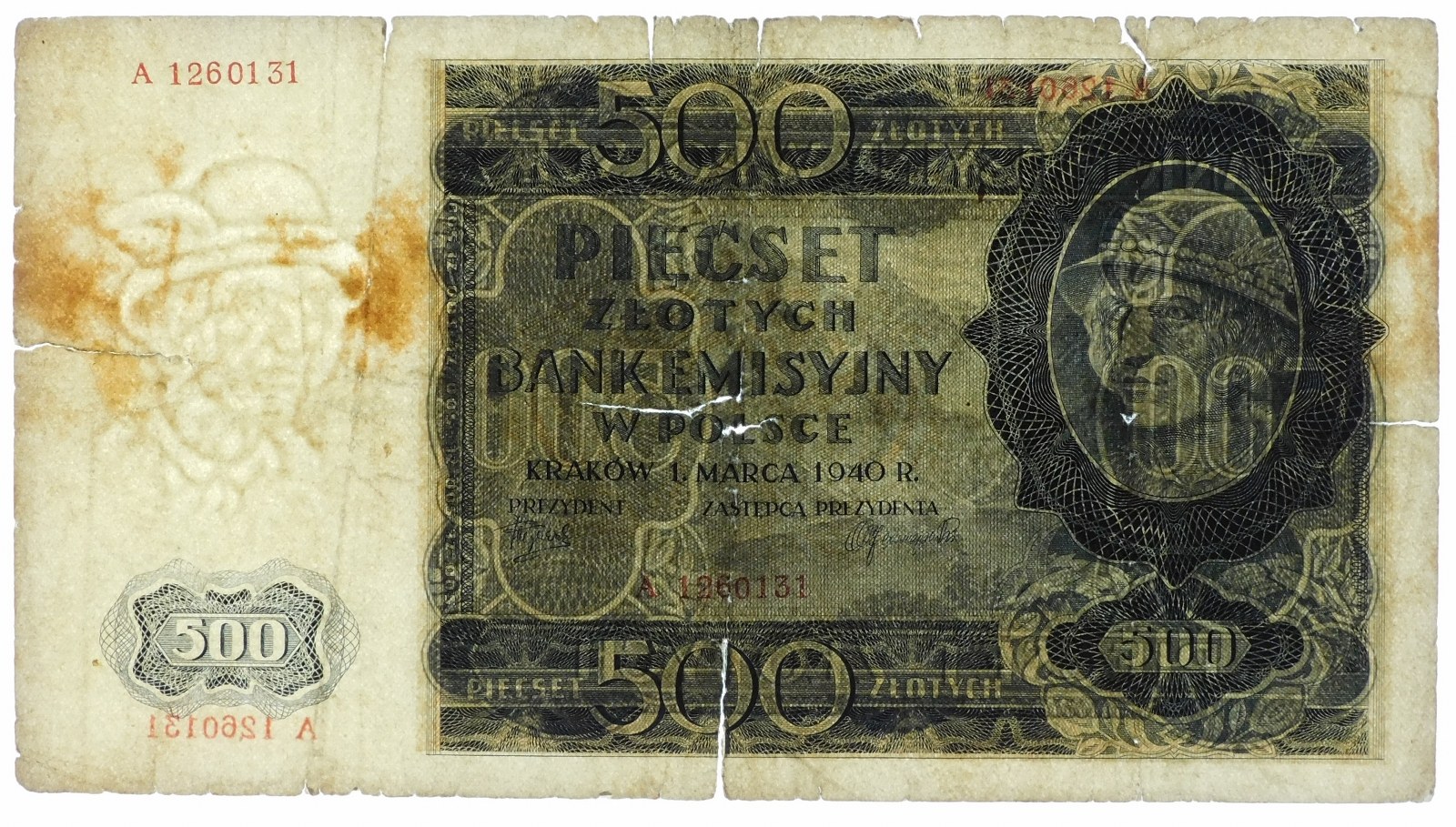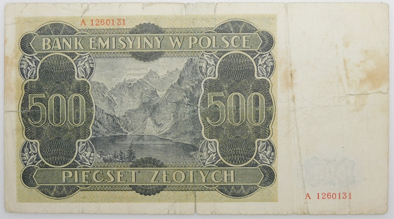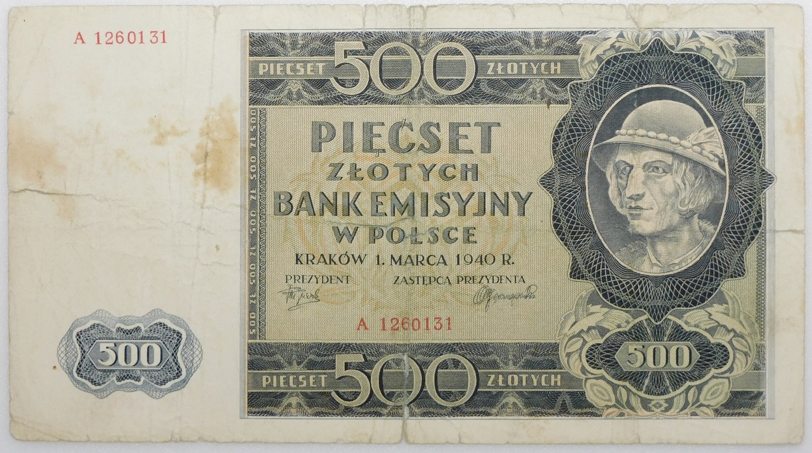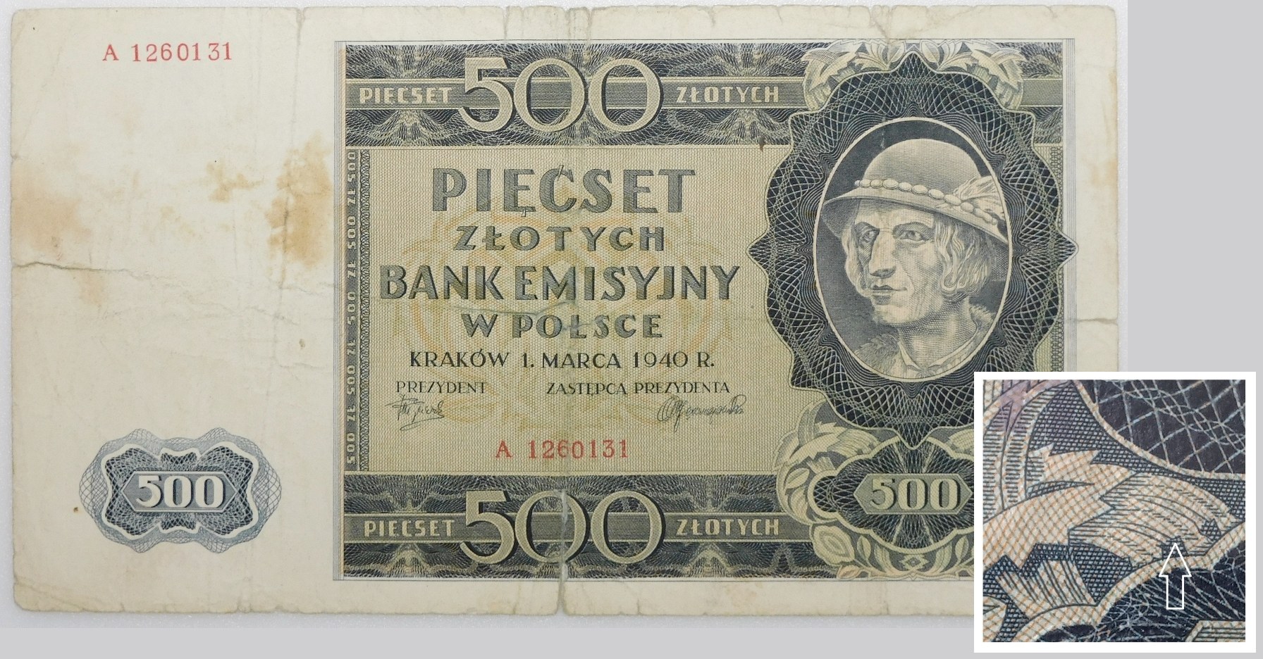 Banknot 500 złotych 1940, tzw. FAŁSZERSTWO LONDYŃSKIE – seria A , ciąg numeracji charakterystyczny dla tego typu fałszerstwa zaczynający się od cyfr 12…. (znane są też z nr 13….)