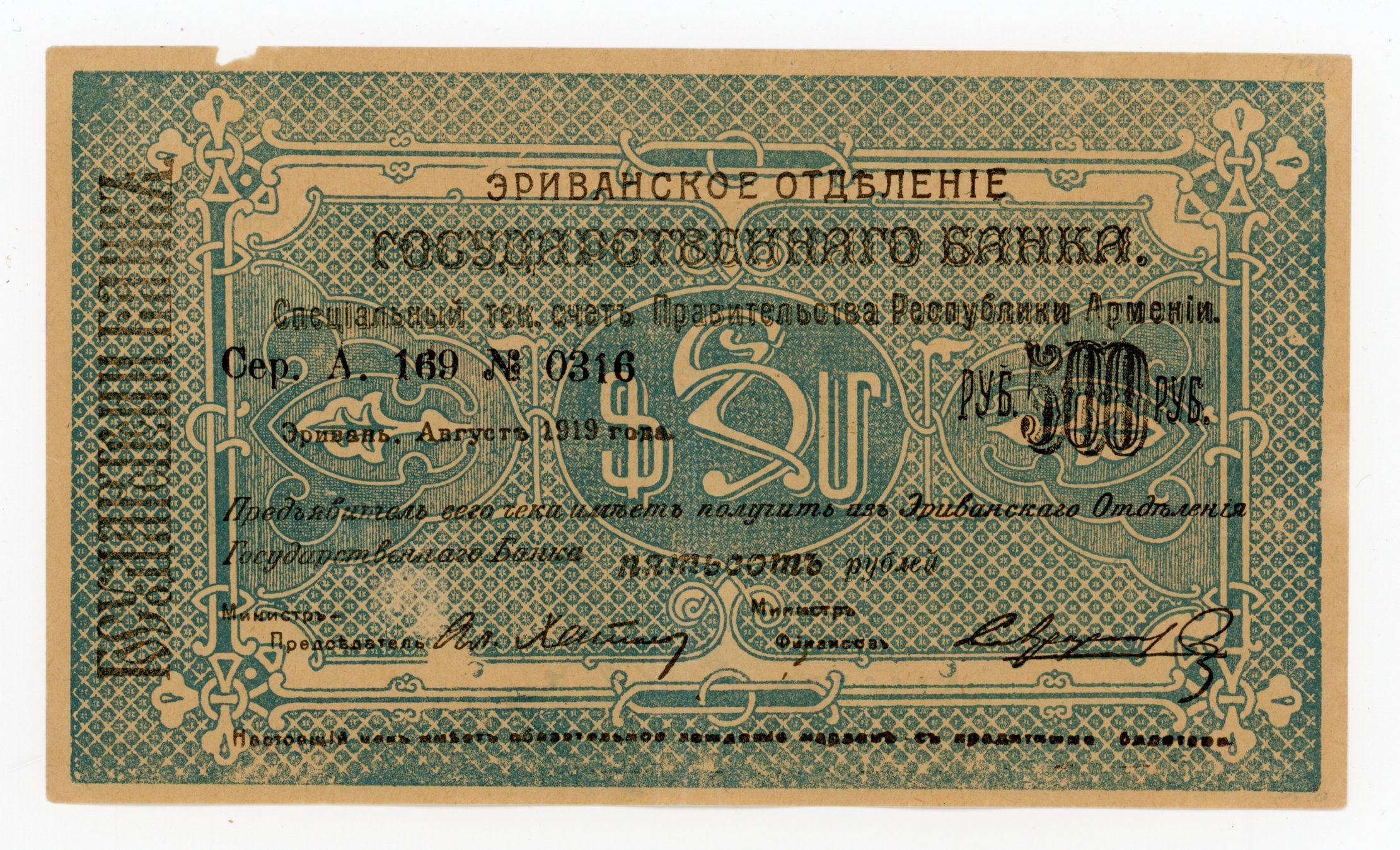 Armenia, 500 rubli 1919. Stana zachowania 3. Dwa pionowe równoległe złamania oraz ubytek na górnym marginesie i na rewersie ślad po odklejeniu. Literatura: Pick 26a