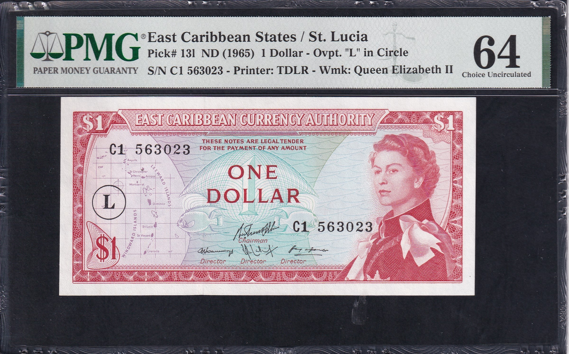 East Caribbean States / St. Lucia, 1 Dollar - Ovpt. ''L'' in Circle, 1965, Choice UNC 64, Pick: 131