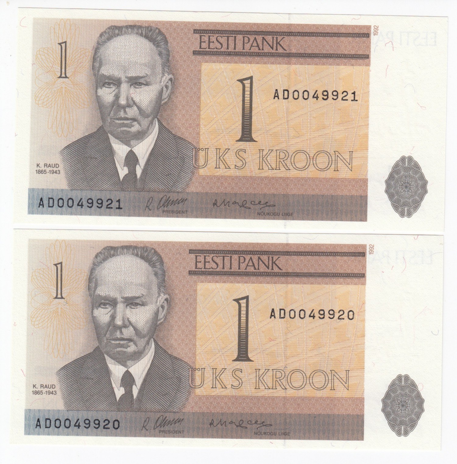 Estonia 1 Kroon 1992 - Consecutive numbers (2)