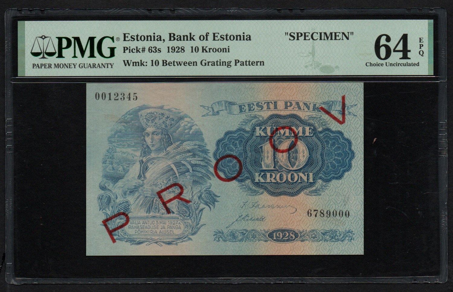 Estonia 10 Krooni 1928 - Specimen - PMG 64 EPQ Choice Uncirculated
