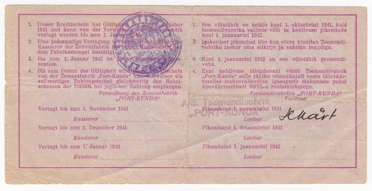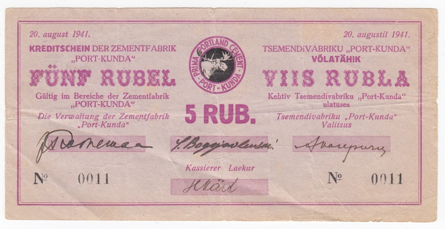 Germany / Estonia, Kunda Cement factory 5 Roubles 1941 local note