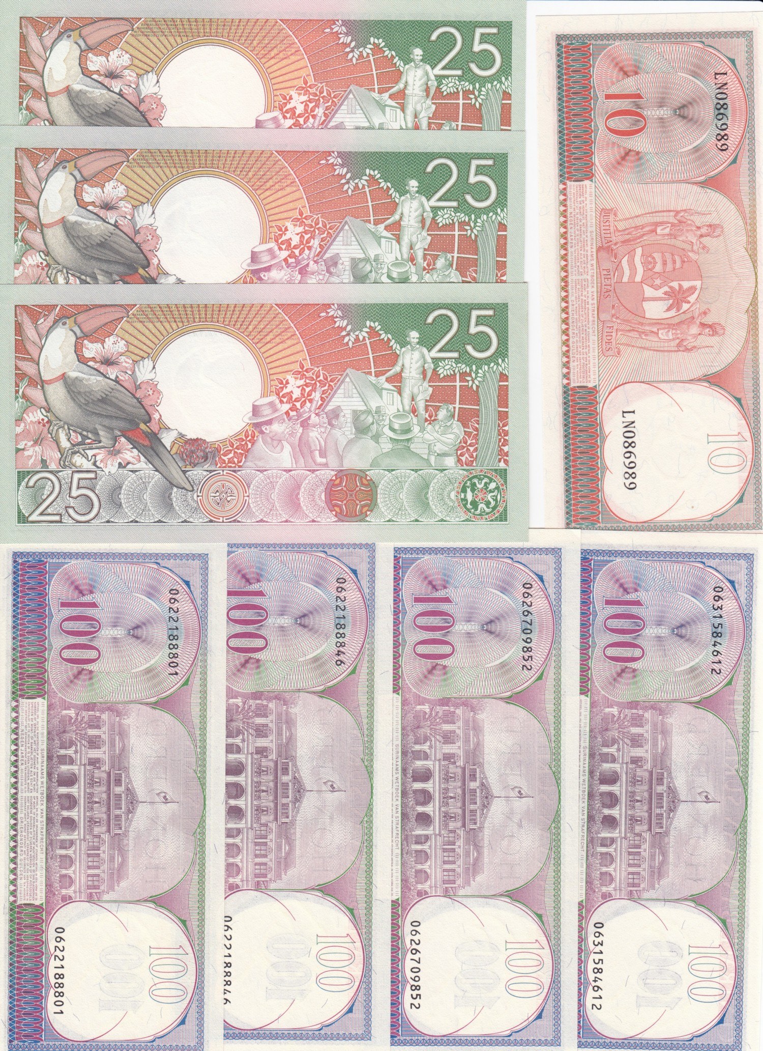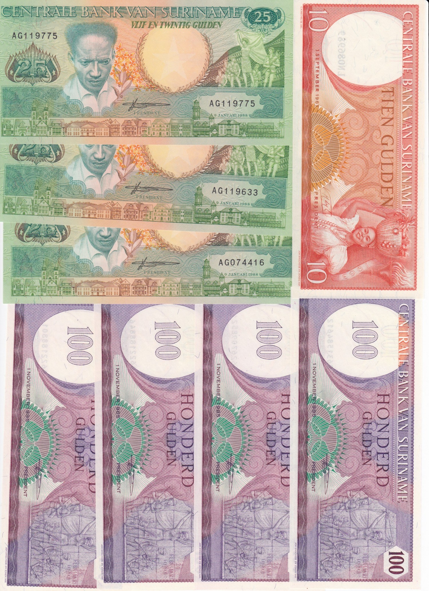 UNC. 10 Gulden 1963, Pick 121.25 Gulden 1988, Pick 132b.100 Gulden 1985, Pick128b.