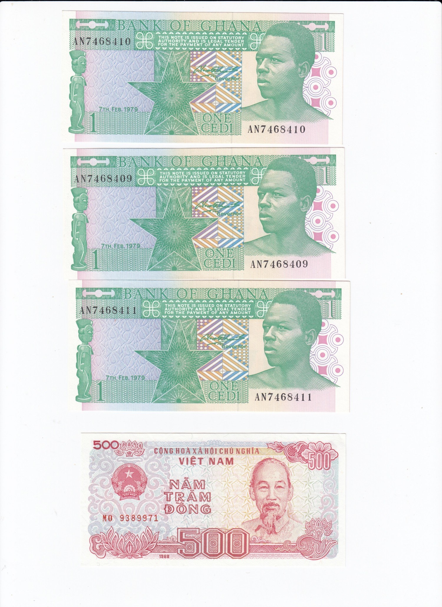 UNC. For additional photos, please visit our website.Zambia 50 Kwacha 1986-1988, Pick 28.India 5 Rupees 1970, Pick 56.Ghana: 1 Cedi 1979, Pick 17a;1 Cedi 1976 & 1 Cedi 1975, Pick 13;10 Cedis 1977, Pick 16e.North-Korea: 5 Won 1998, Pick 40;10 Won 1978, Pick 20.Viet Nam (South) :20 Dong 1969, Pick 24;1000 Dong 1972, Pick 34a.Viet Nam:100 Dong 1991, Pick 105;200 Dong 1987, Pick 100;500 Dong 1988, Pick 101.
