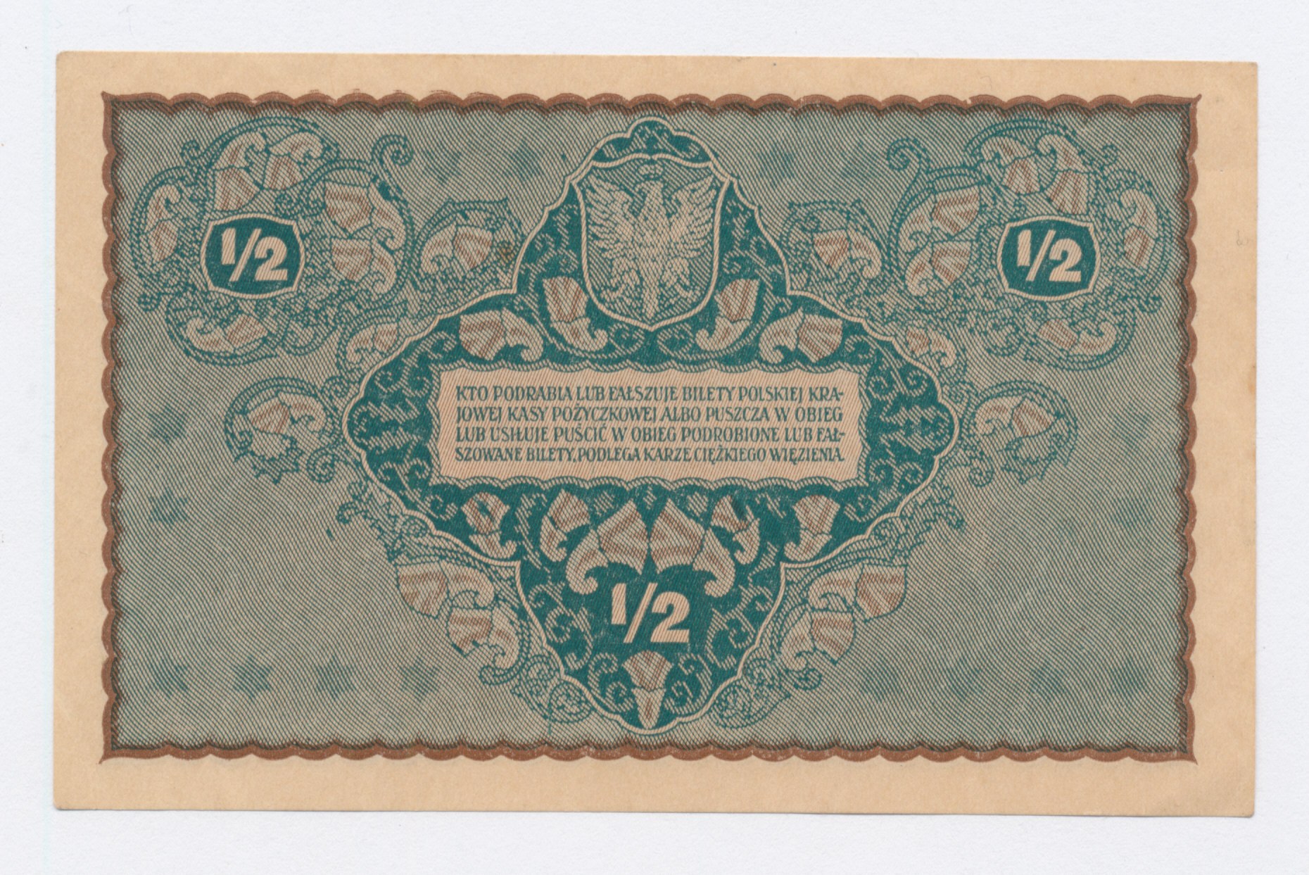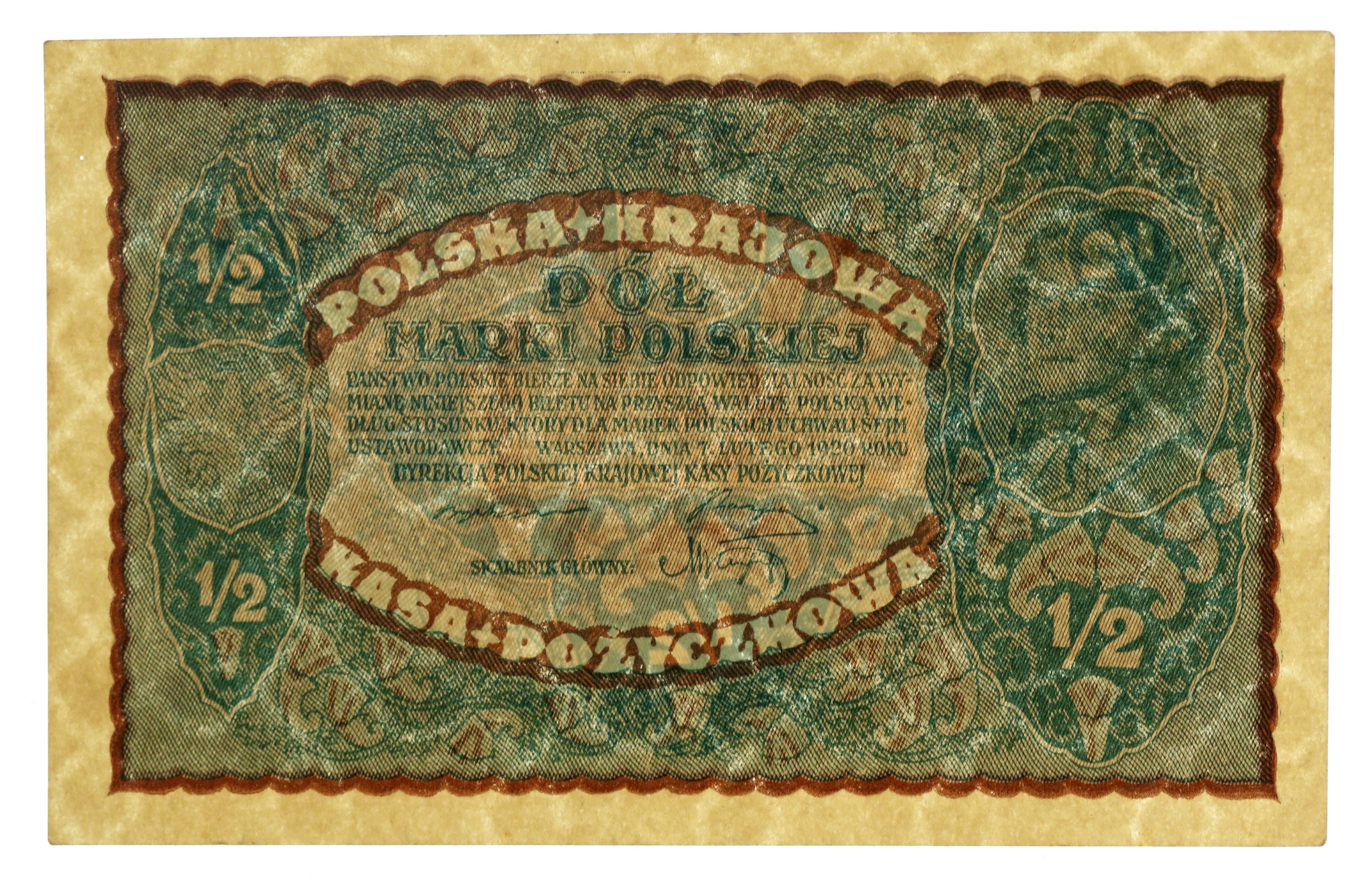 II RP, 1/2 mkp 1920. Stan zachowania 1-. Słabe ugięcie dolnego rogu dolnego rogu, zgniotka na prawym marginesie. Literatura: Miłczak 30
