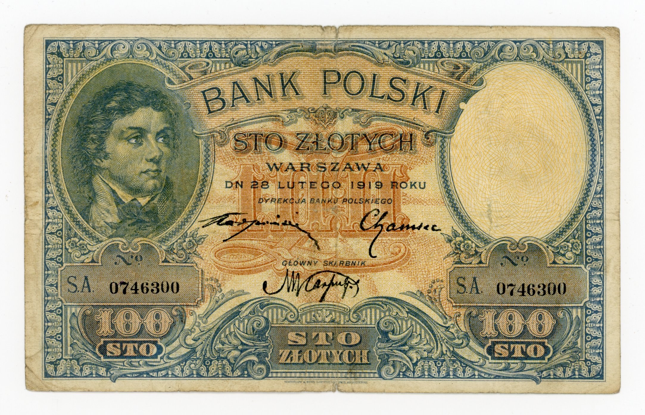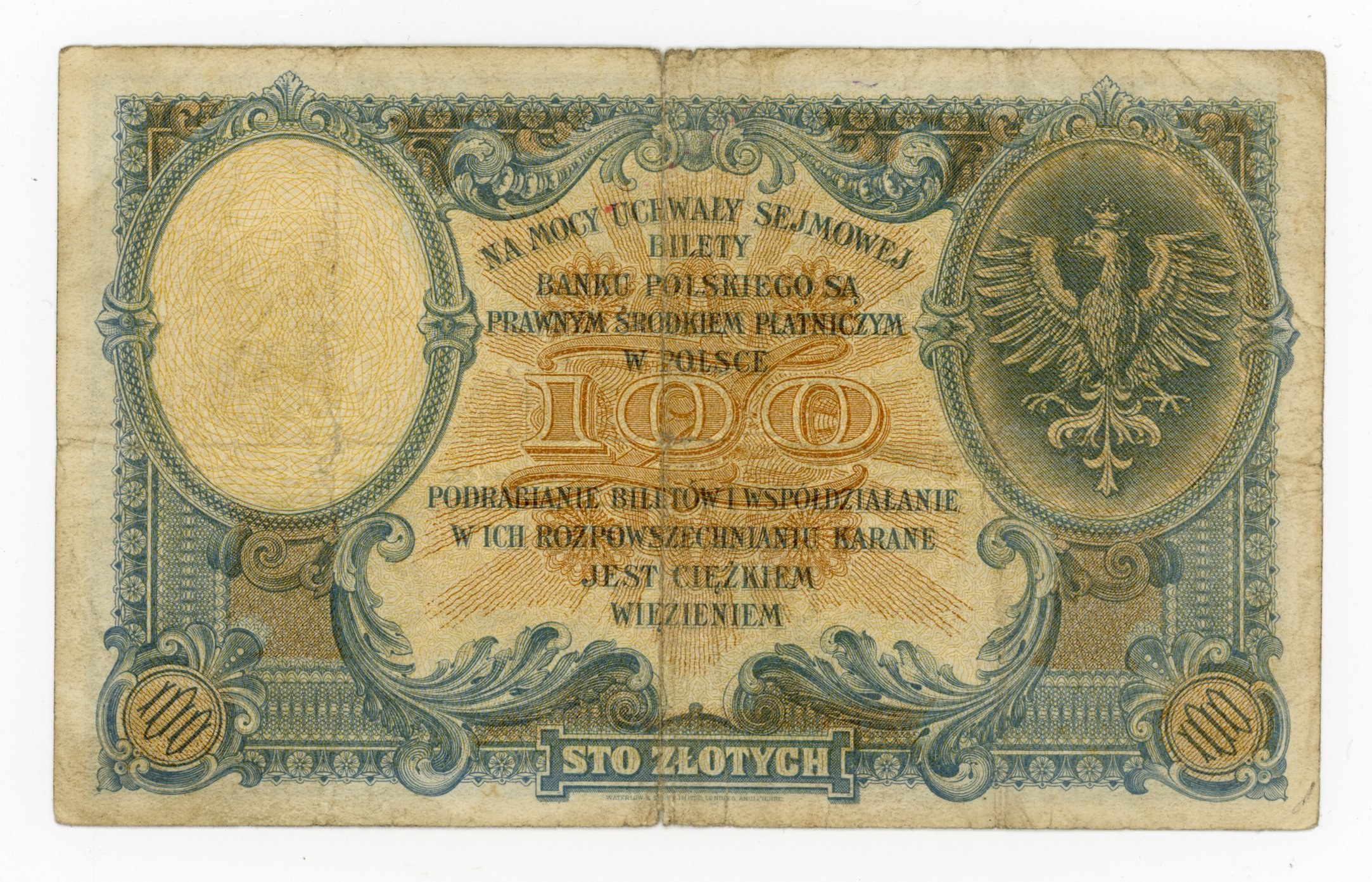 II RP, 100 złotych 1919 S.A.. Stan zachowania 3-. Kilkukrotnie złamane. Literatura: Miłczak 53