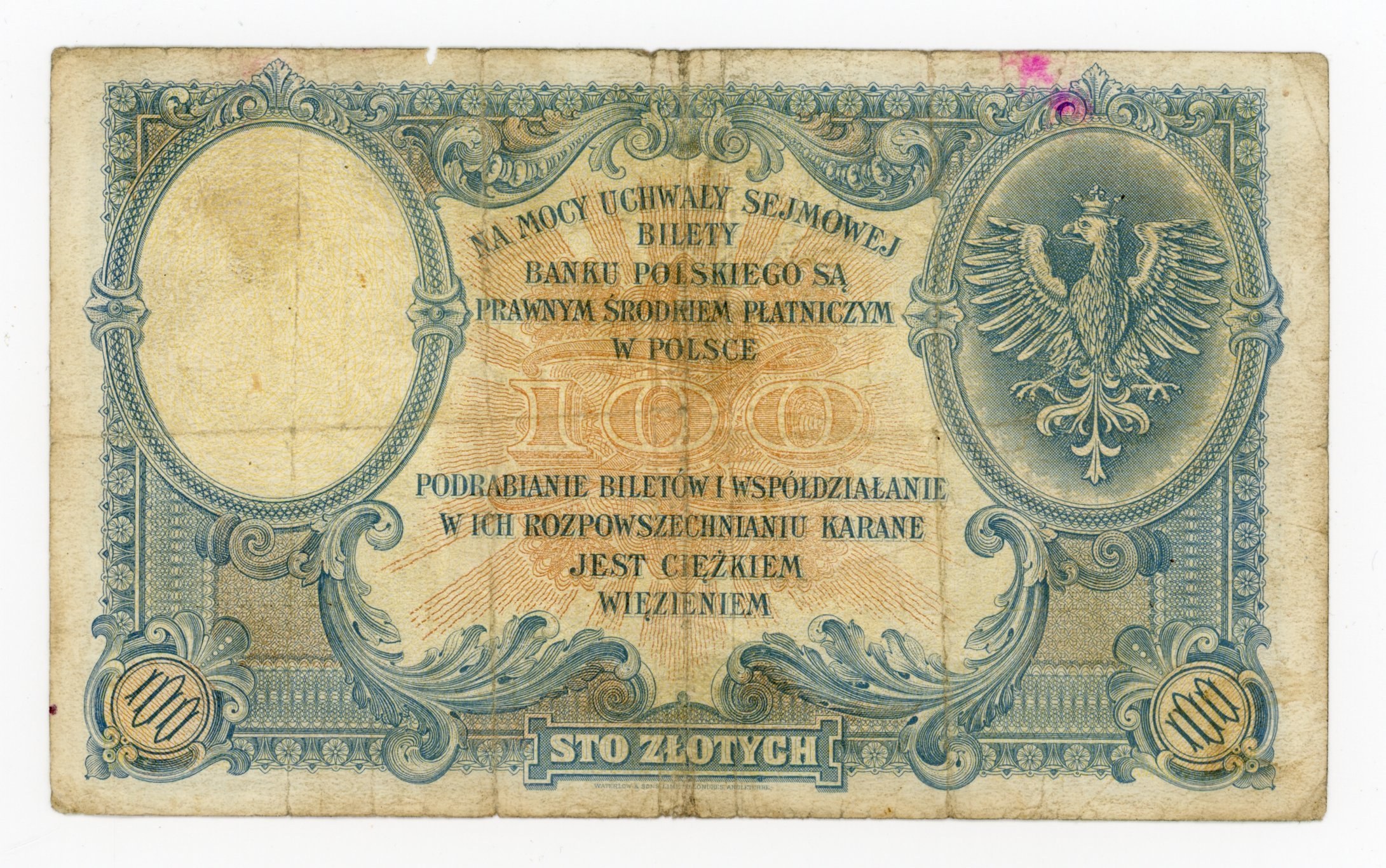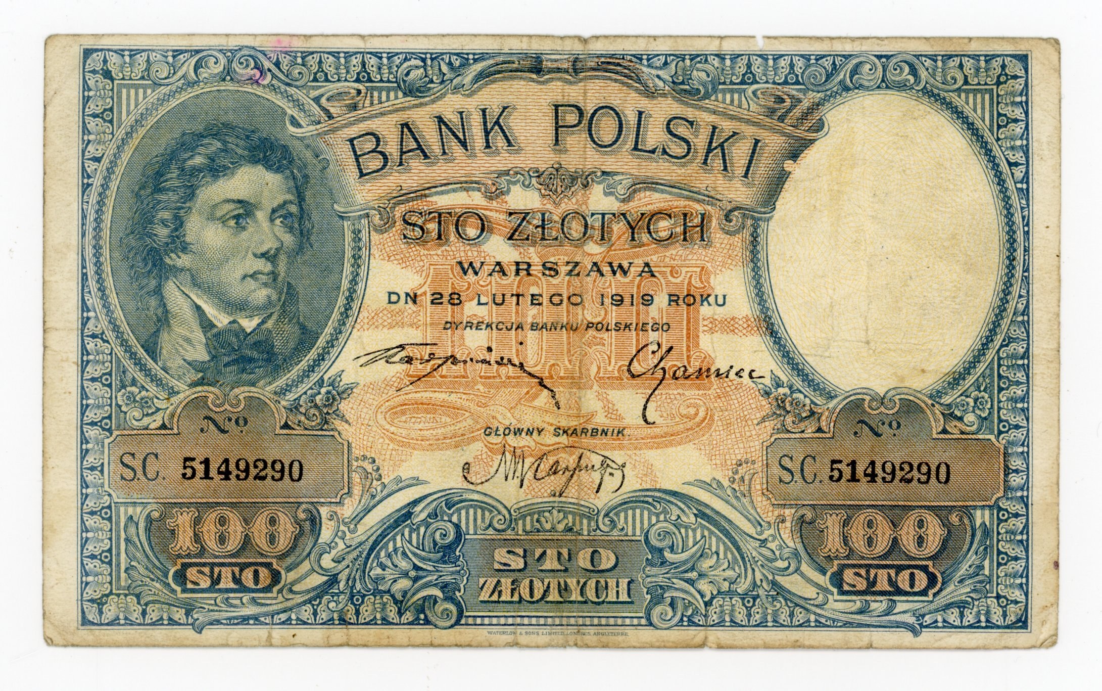 II RP, 100 złotych 1919 S.C.. Stan zachowania 3-. Kilkukrotnie złamane. Literatura: Miłczak 53