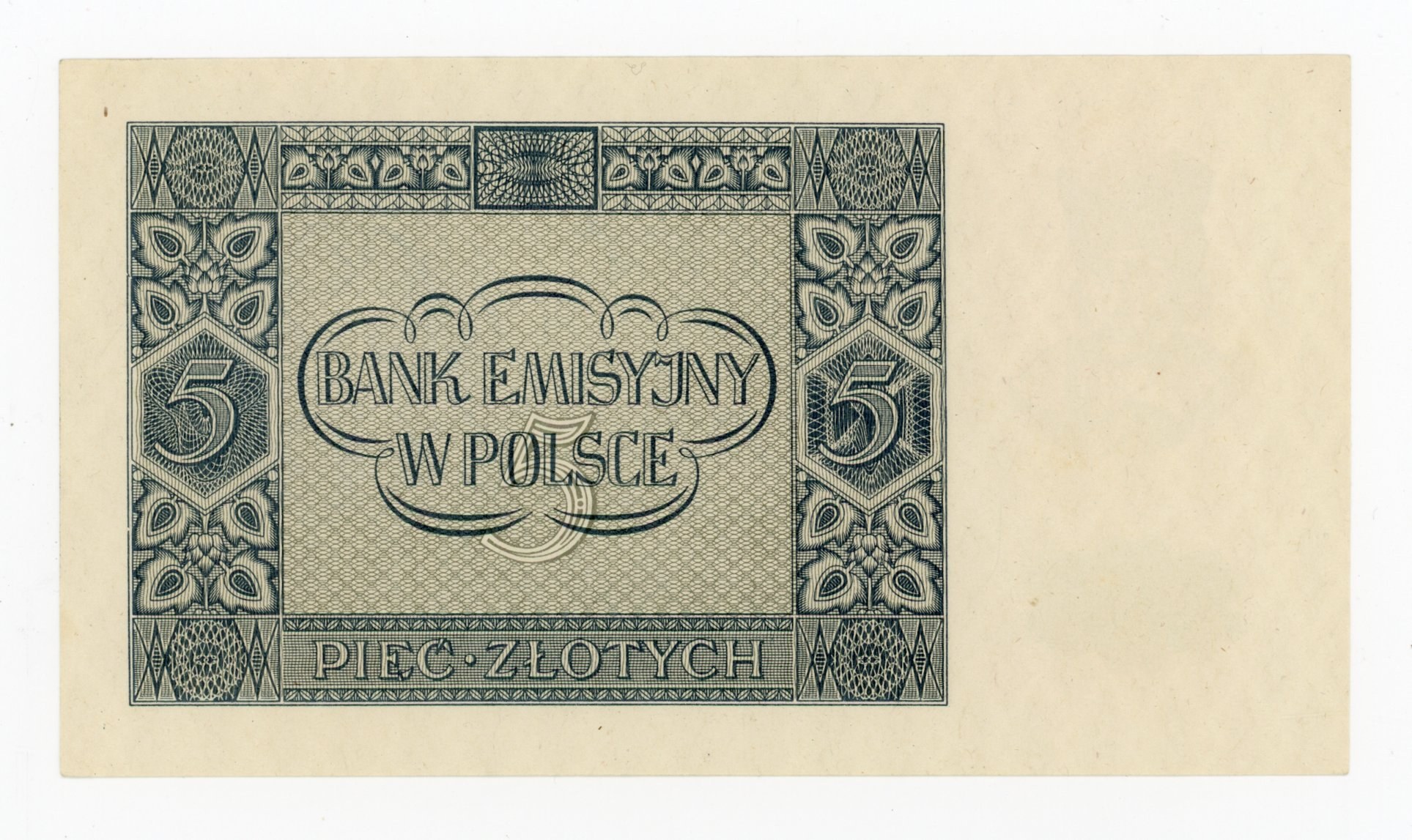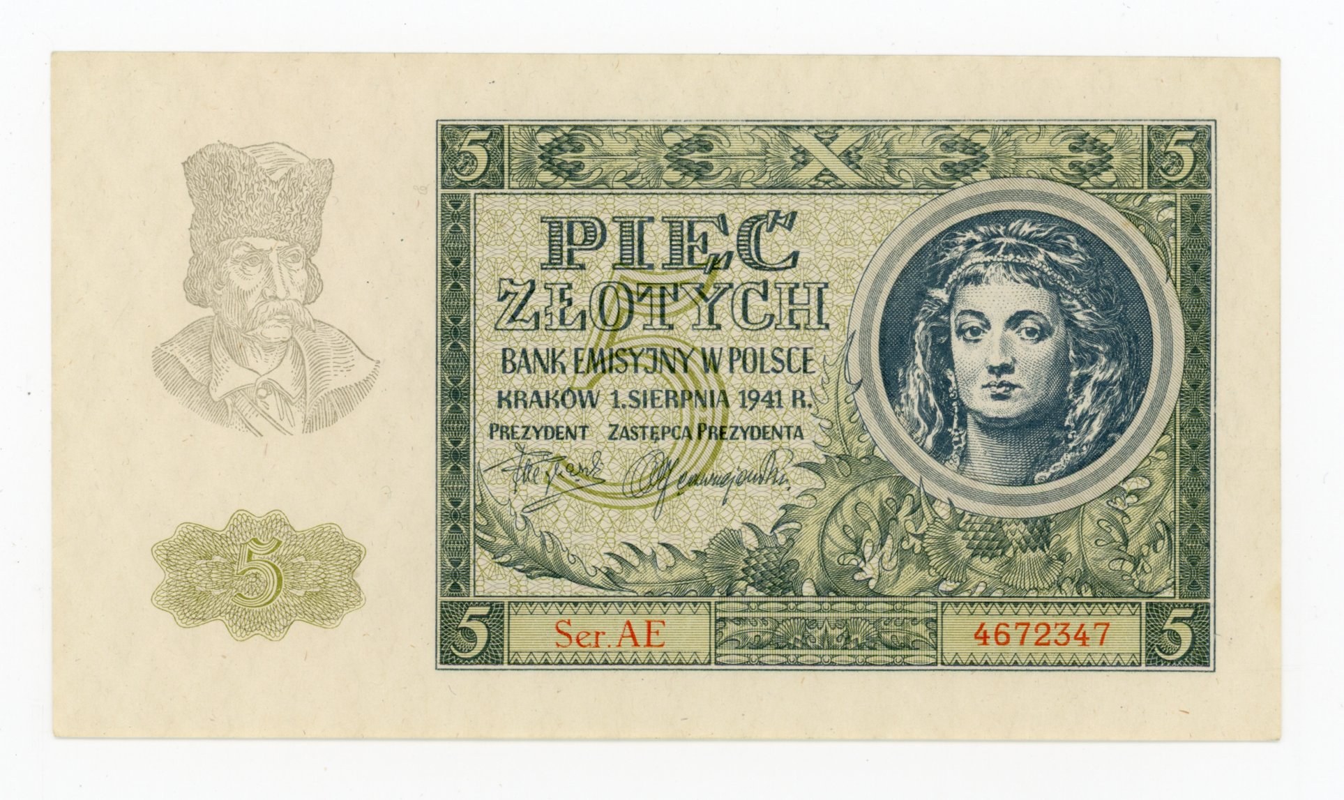 GG, 5 złotych 1941 AE. Stan zachowania 1. Emisyjny stan zachowania. Literatura: Miłczak 101b