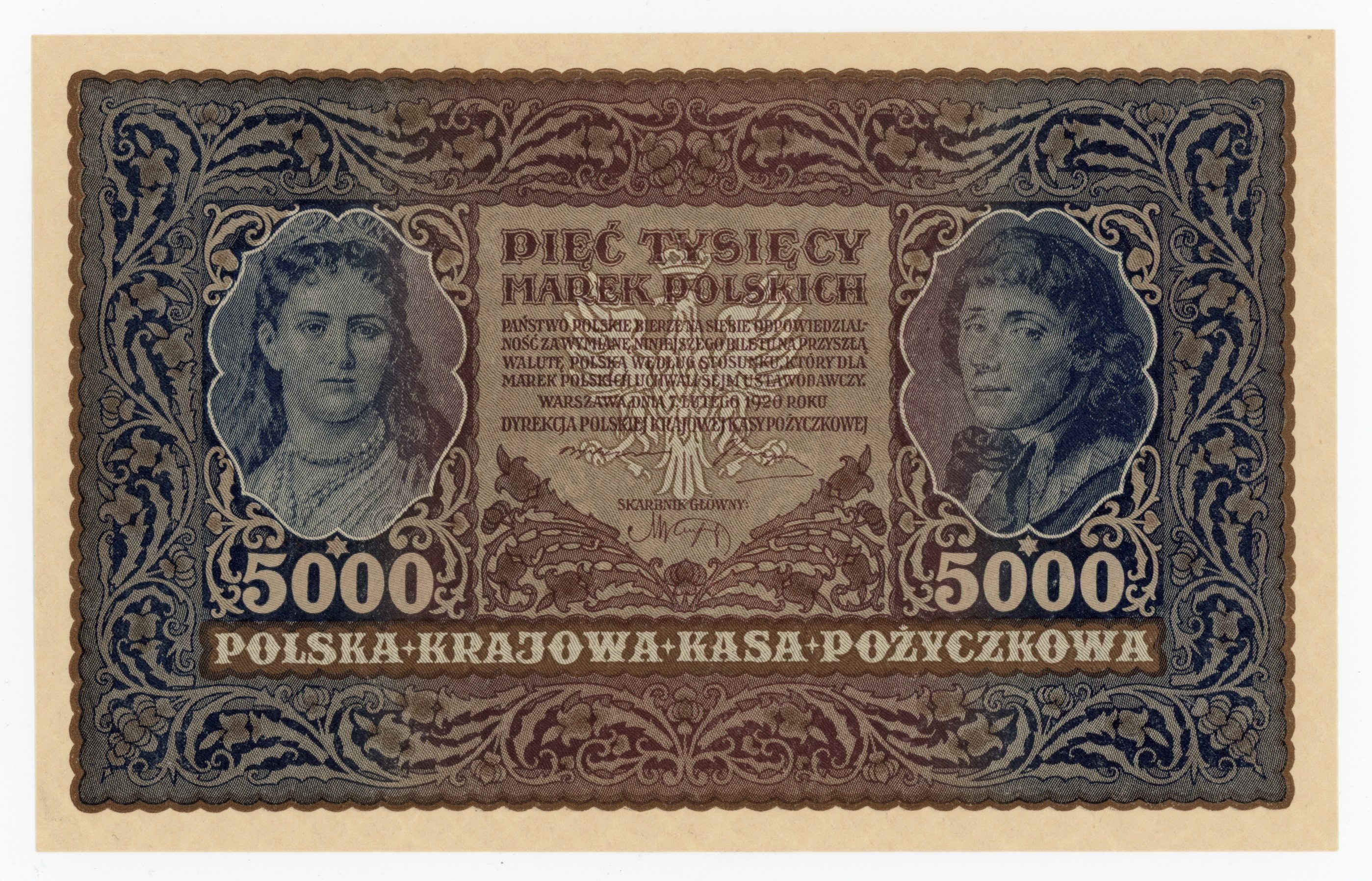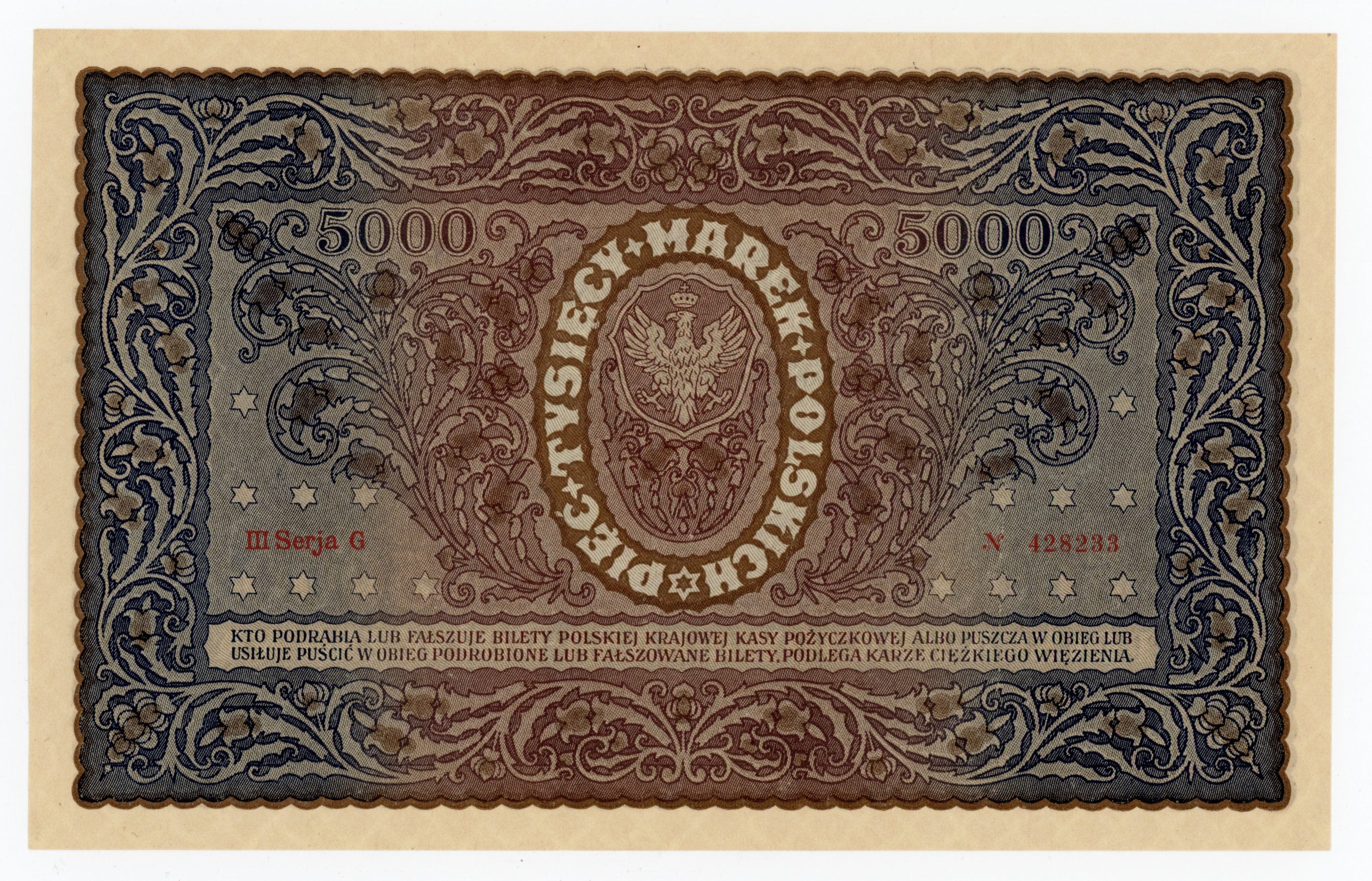 II RP, 5.000 mkp 1920 III Serja G. Stan zachowania 1-. Piękny stan zachowania jedynie drobne nagniotki. Literatura: Miłczak 31c