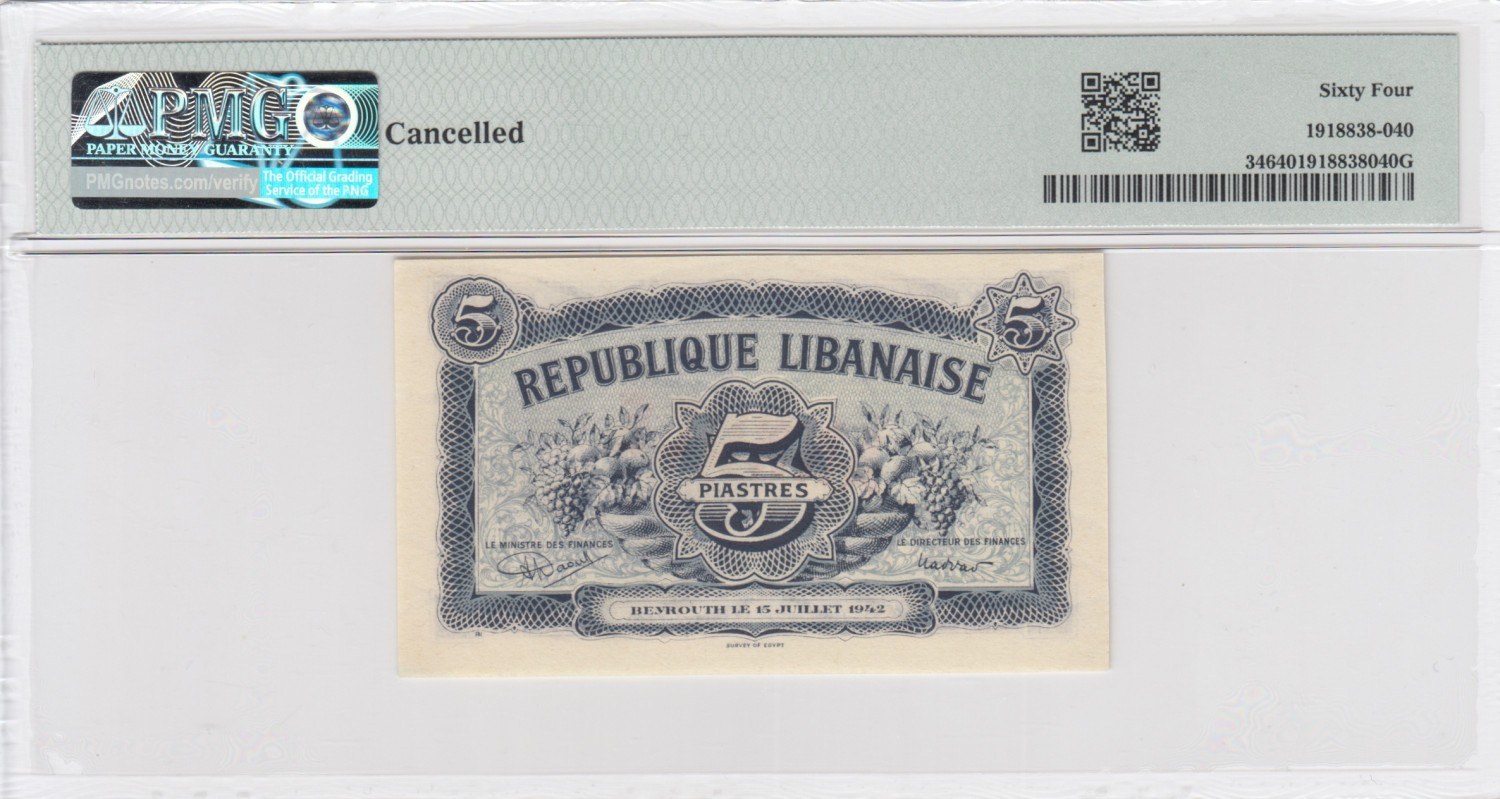 Lebanon 5 Piastres 1942 - PMG 64 Choice Uncirculated