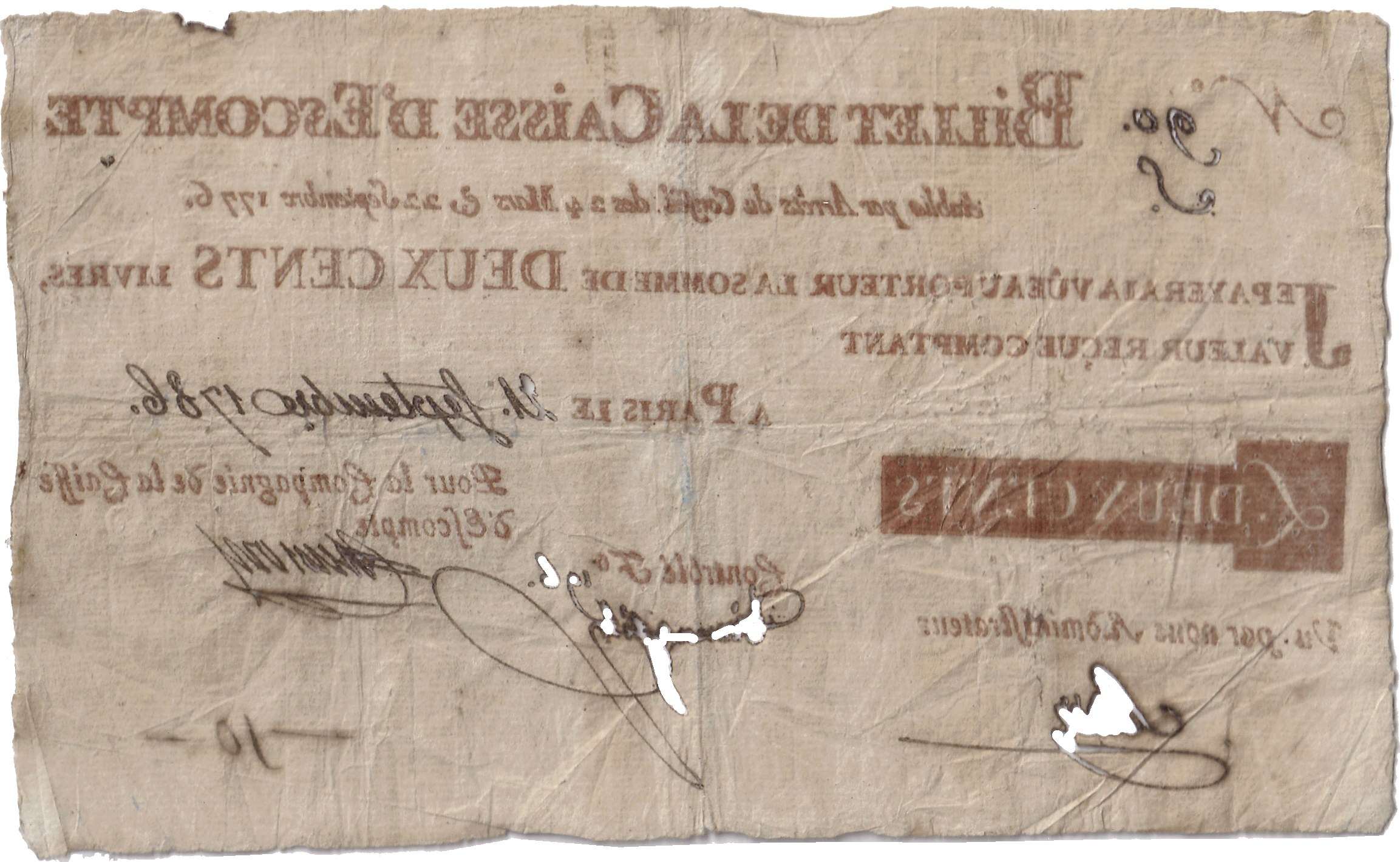 PCGS CHOICE FINE. Sans cachet au revers. Sur papier fin, filigrané CAISSE D’ESCOMPTE (papèterie d’Angoulême). Écritures manuscrites à l’encre d’époque, dont la plume a légèrement perforé le papier. Exemplaire gradé et certifié authentique par PCGS. Selon certaines opinions, ce billet pourrait être une contrefaçon d’époque, d’une grande rareté également pour une série mal documentée. Vendu comme tel. B.