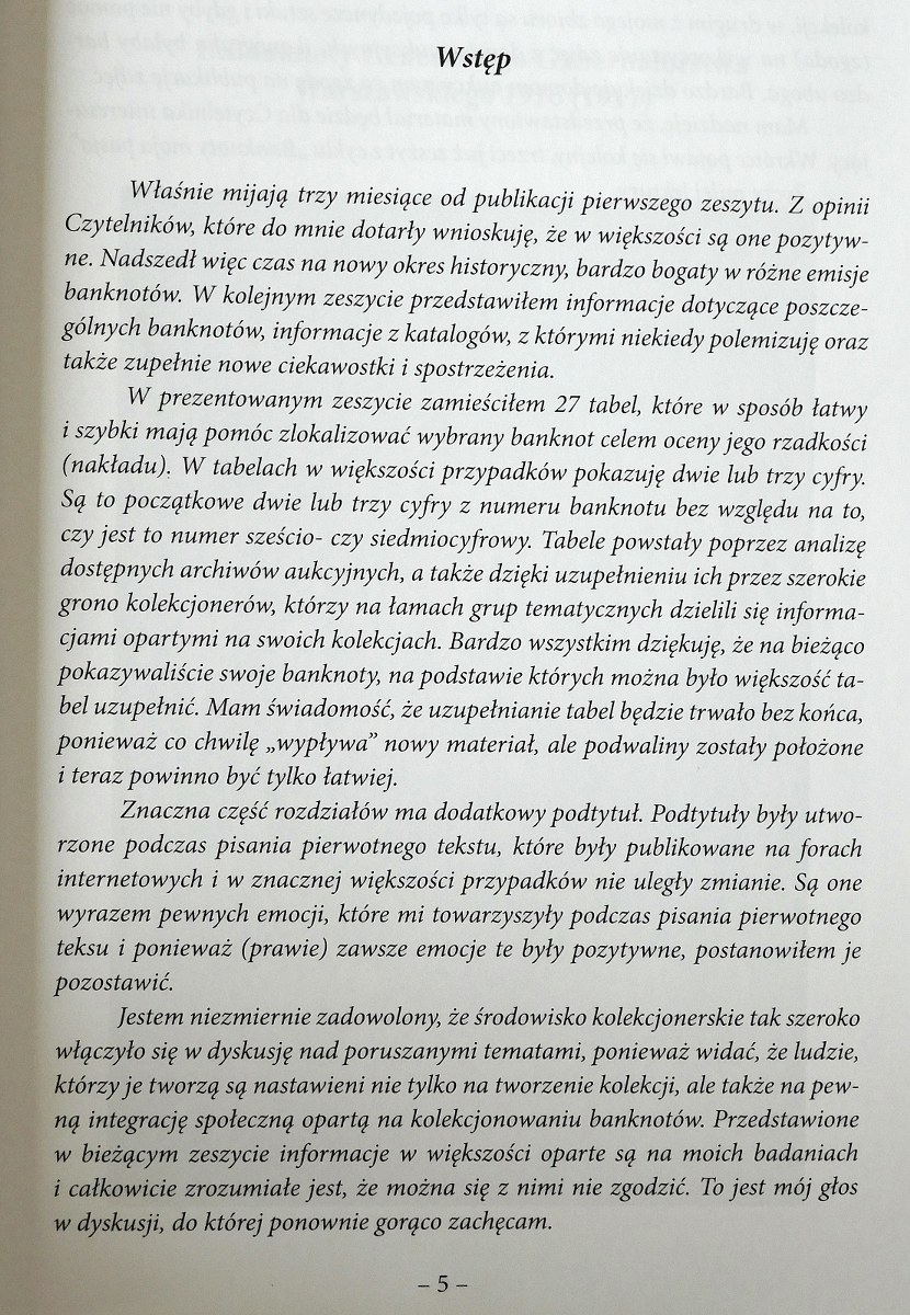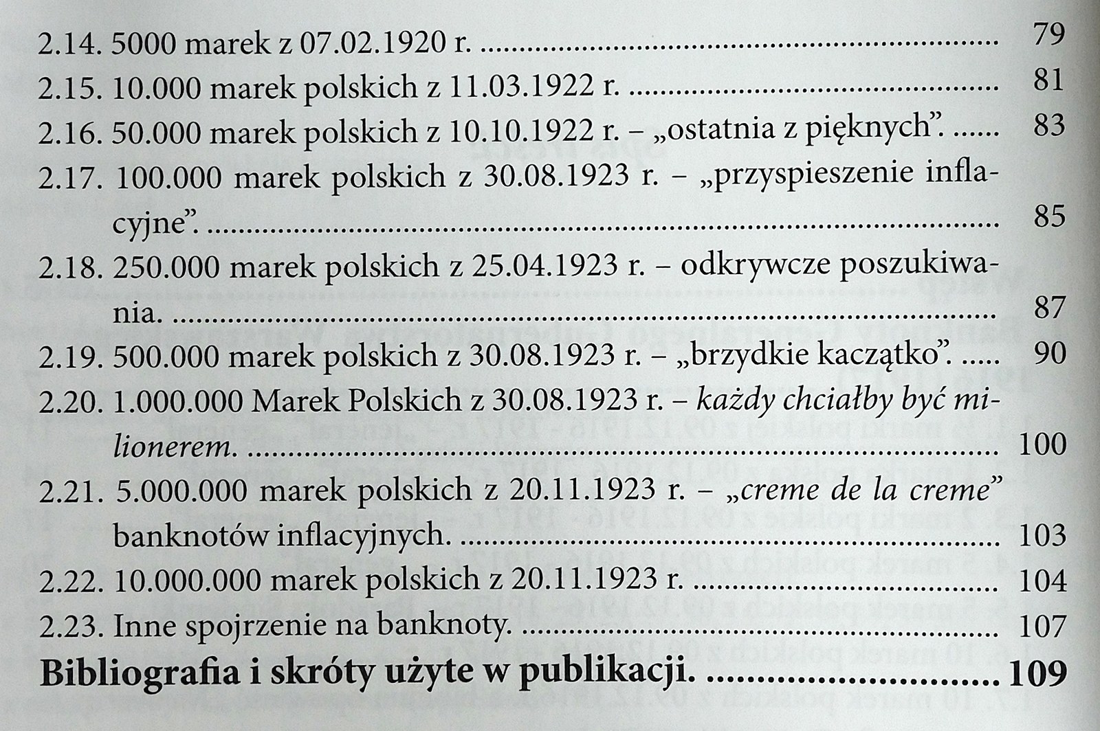 Wydanie autorskie zawierające ponad 70 ilustracji i tabel występowania na banknotach zakresów serii i numeracji. Jest to zbiór artykułów, rozpraw, tez i analiz, publikowanych wcześniej w mediach społecznościowych, zebranych w jedną całość, a poświęconych różnym aspektom pieniądza papierowego okresu - Generalnego Gubernatorstwa Warszawskiego 1916 (1917) i banknotów Rzeczypospolitej Polskiej 1919–1923 (1924) - waluty markowej.