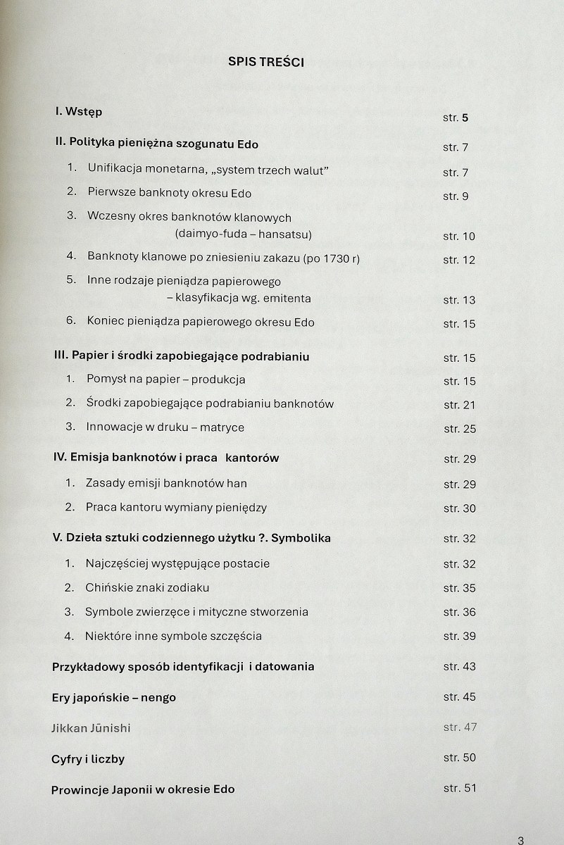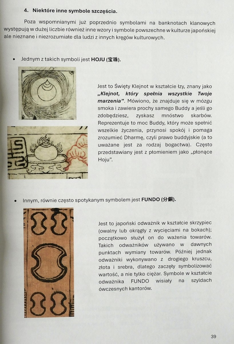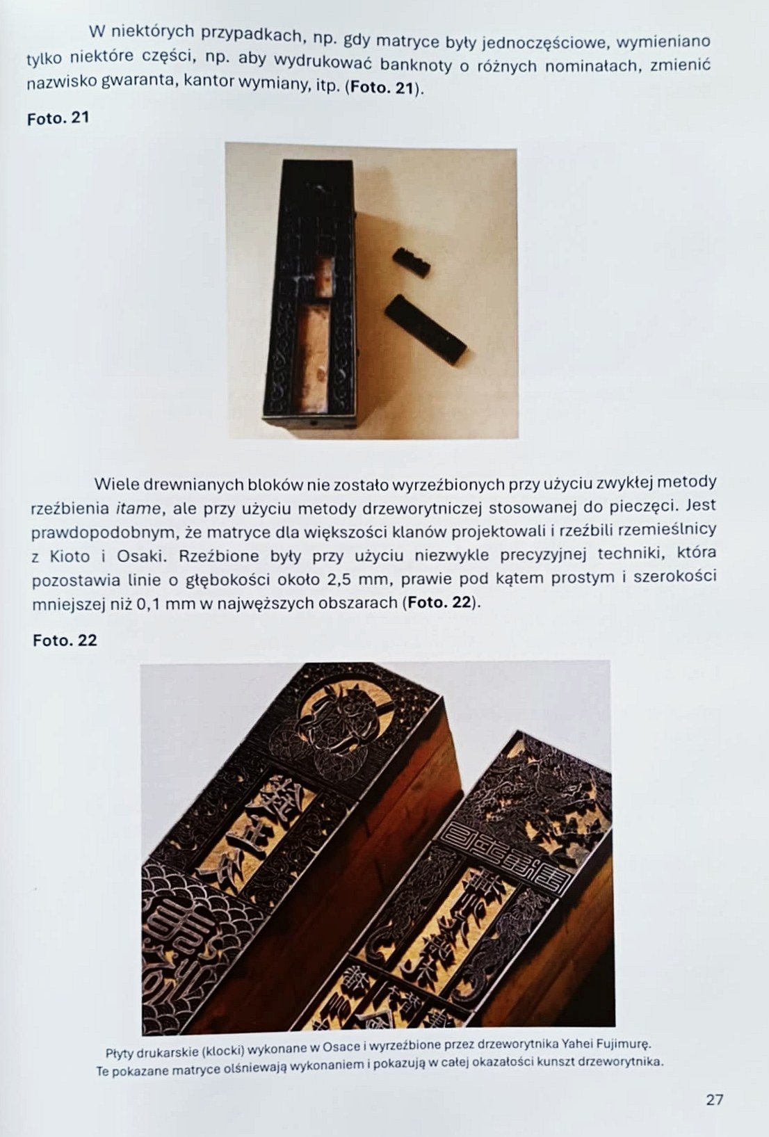 Katalogowe, unikalne wydanie na polskim rynku wydawniczym, które w sposób kompleksowy traktuje historyczny pieniądz papierowy Japonii. Mnóstwo kolorowych ilustracji, nie tylko dotyczących samych banknotów, w opracowaniu mamy też przedstawione techniki produkcji, od pozyskiwania samego papieru, do druku i dystrybucji banknotów włącznie. Wydane przez autora niskim nakładem kilkunastu egzemplarzy, jako pozycja niekomercyjna, hobbystyczna, obecnie jest jedynym i najlepszym opracowaniem w tym temacie dostępnym w języku polskim.