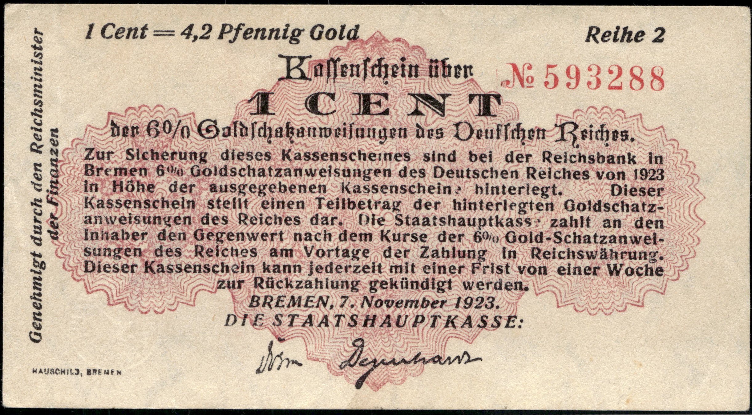 Germany. Bremen 1 Cent 4,2 Pfennig Gold 1923