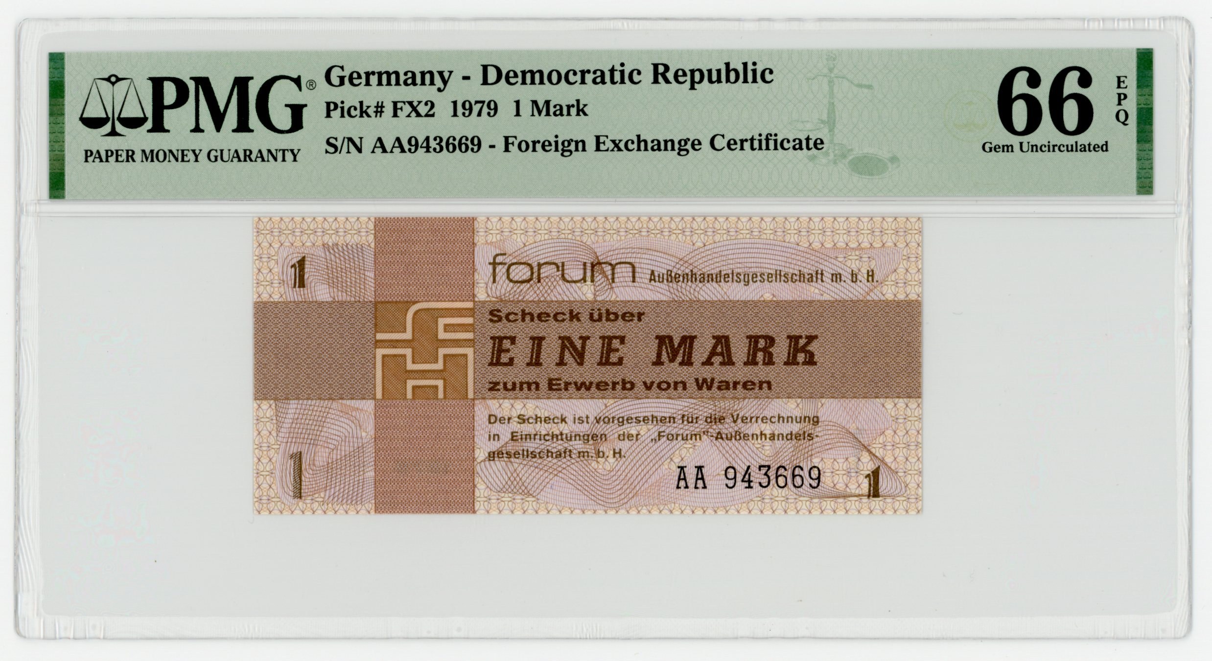 Niemcy, DDR, Forum, 1 marka 1979 - PMG 66 EPQ. Stan zachowania PMG 66 EPQ. Literatura Pick: FX2; Rosenberg: 368a