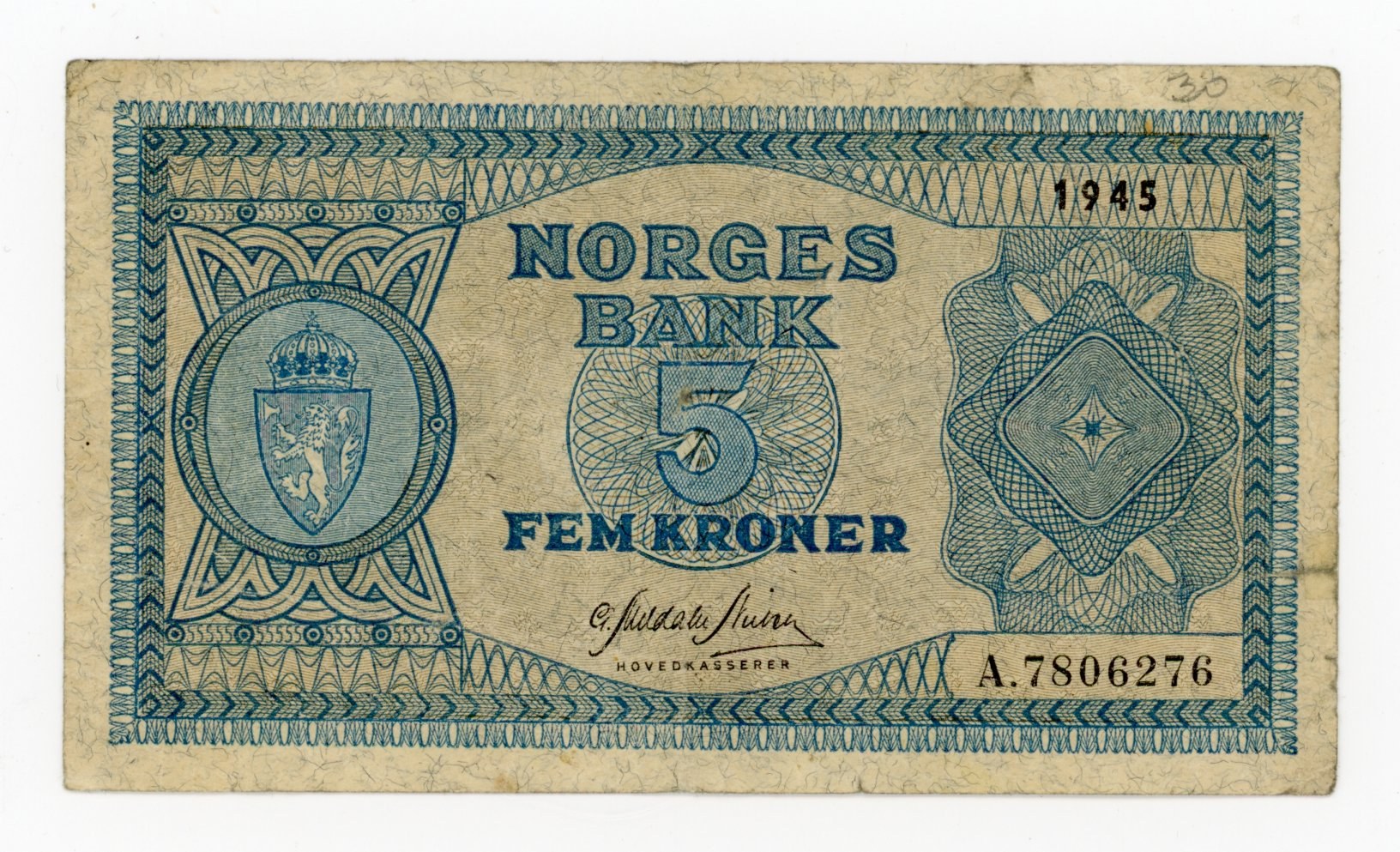 Norwegia, 5 koron 1945. Stan zachowania 3. Kilkukrotnie złamane. Literatura: Pick 25a