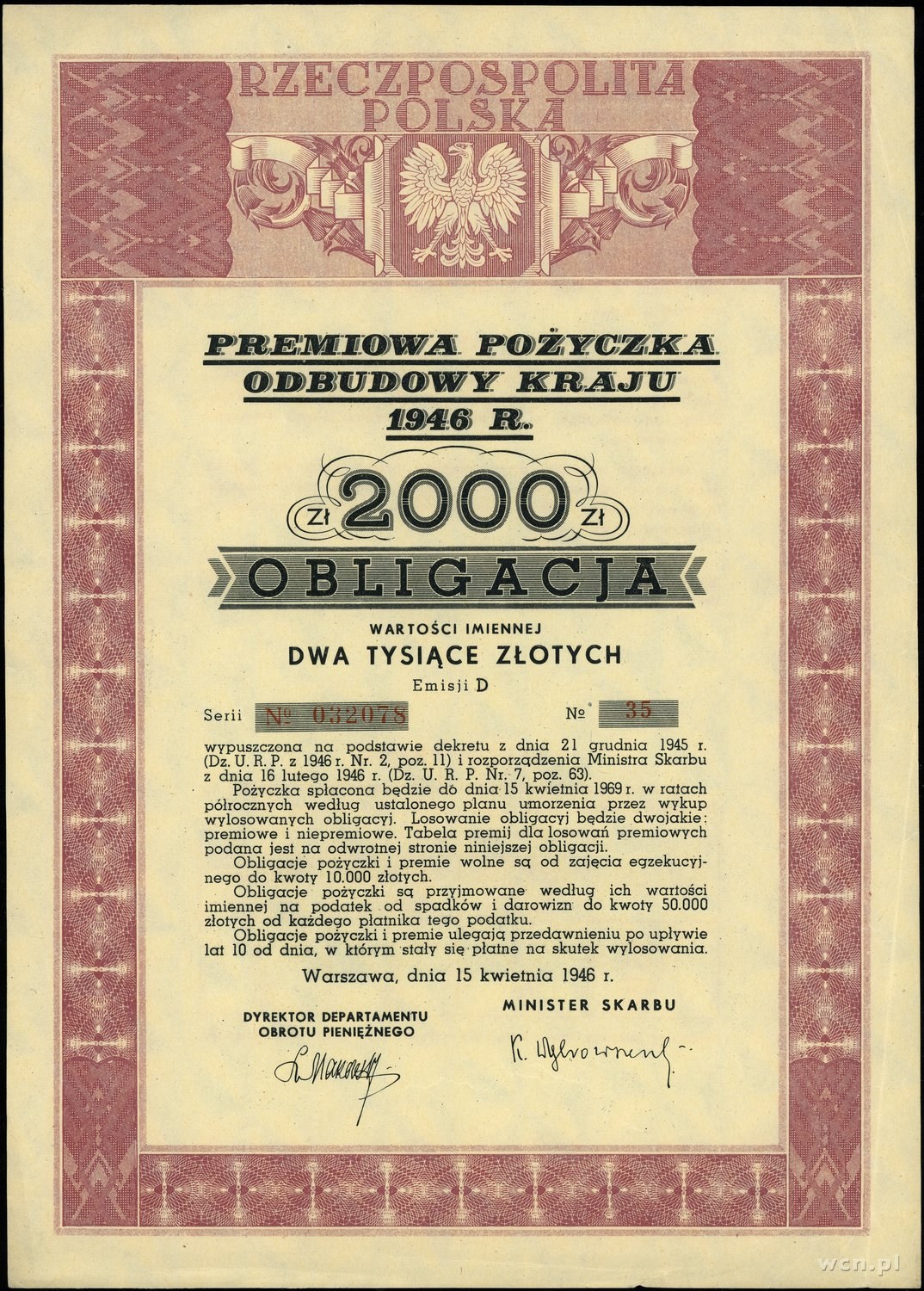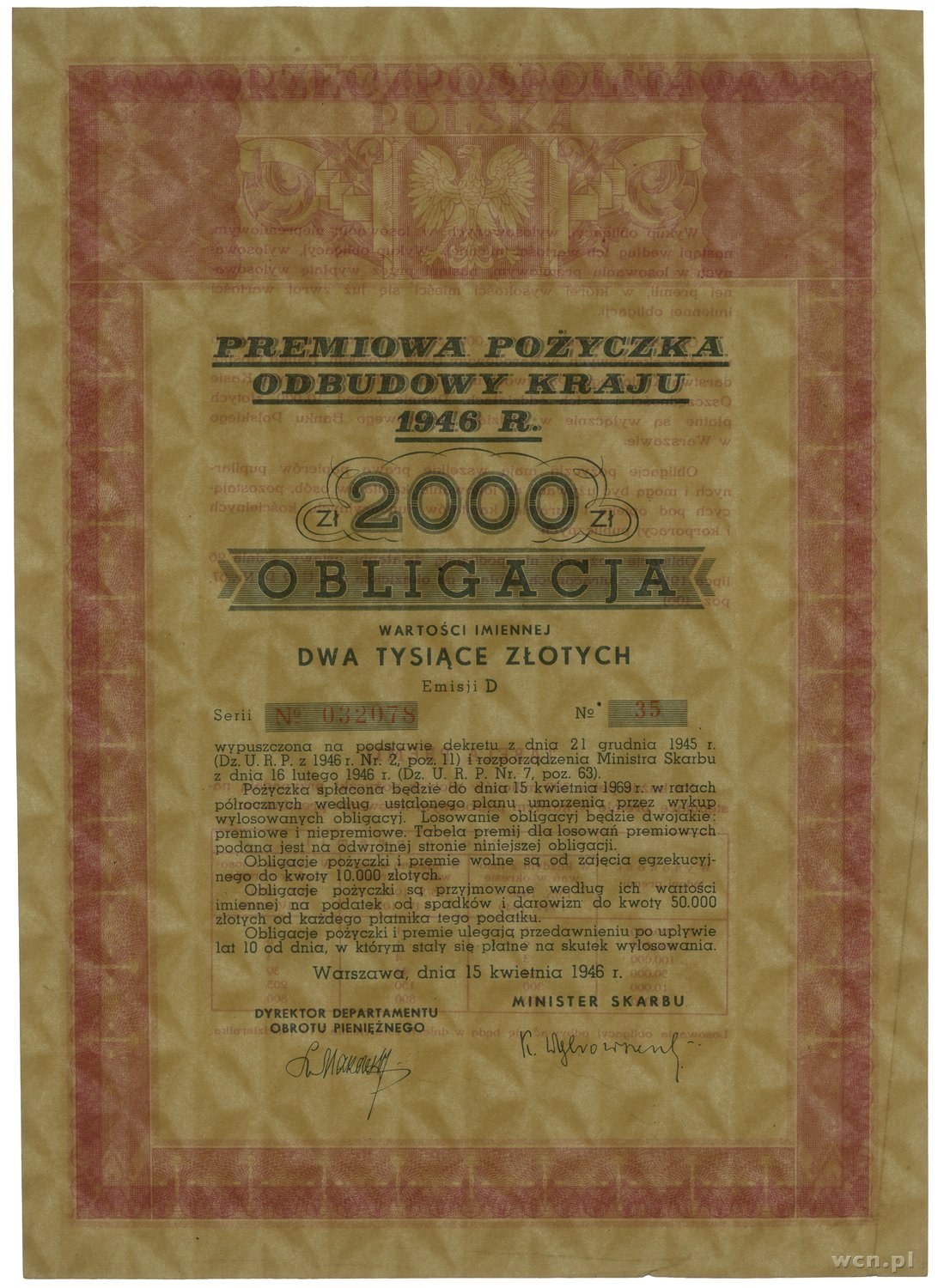 POLSKA POWOJENNA (1944–1952), Obligacja wartości imiennej na 2.000 złotych Premiowej Pożyczki Odbudowy Kraju, 15.04.1946; seria D, numeracja 032078 / 35; Lucow 1339 (R0), Moczydłowski PL19; prawe rogi złamane, miejscowe zagniecenia.
