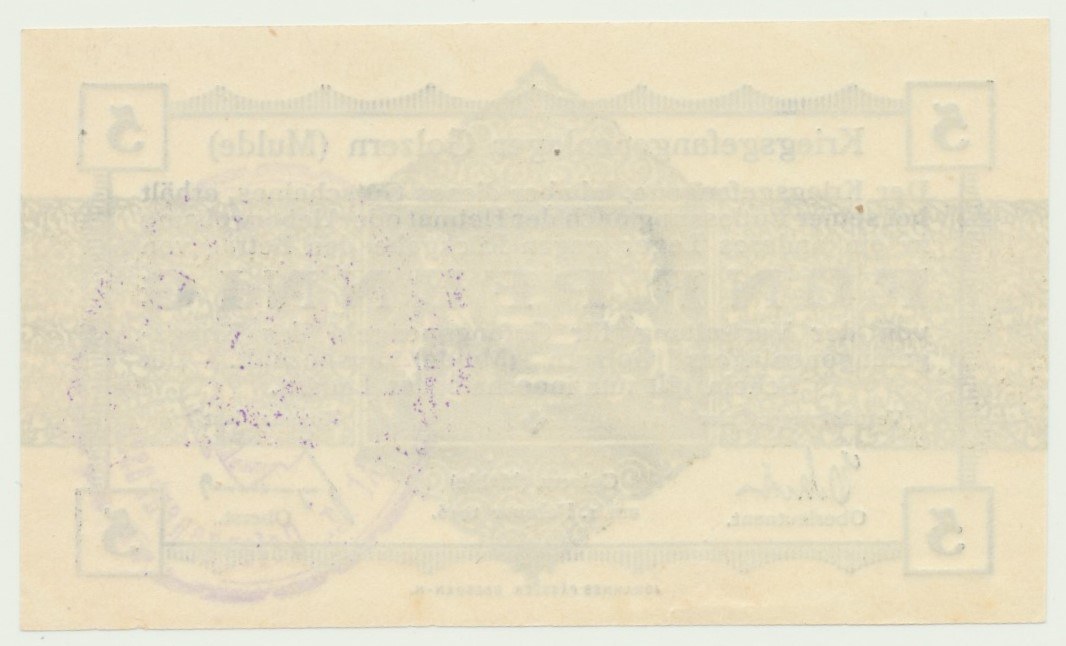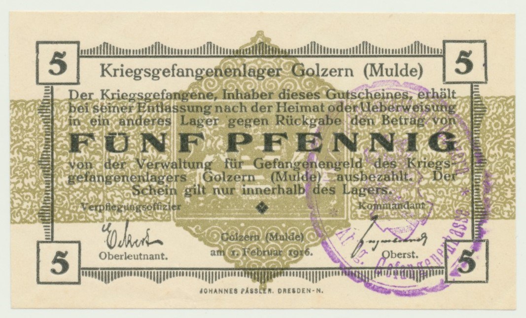 5 fenigów 1.02.1916 r., obóz jeniecki w Golzern (Mulde), z pieczęcią obozu Kriegsefangenenlager Golzern Abtlg. Gefangenenkasse w kolorze fioletowym. Bankowy egzemplarz.